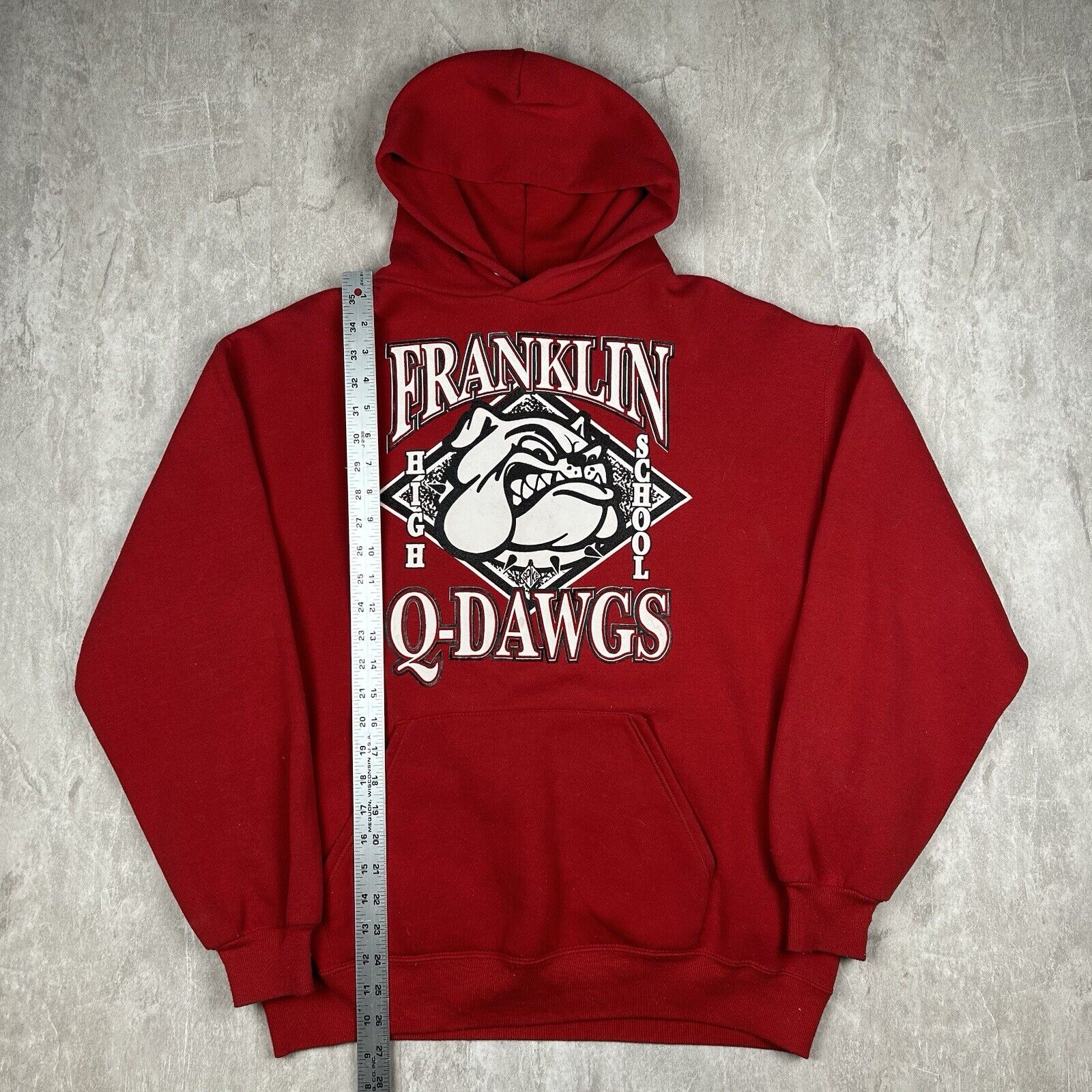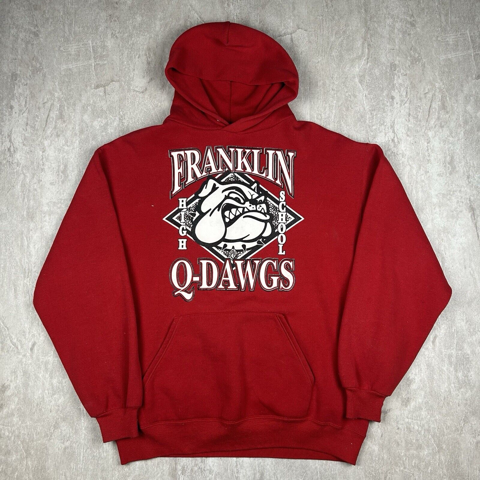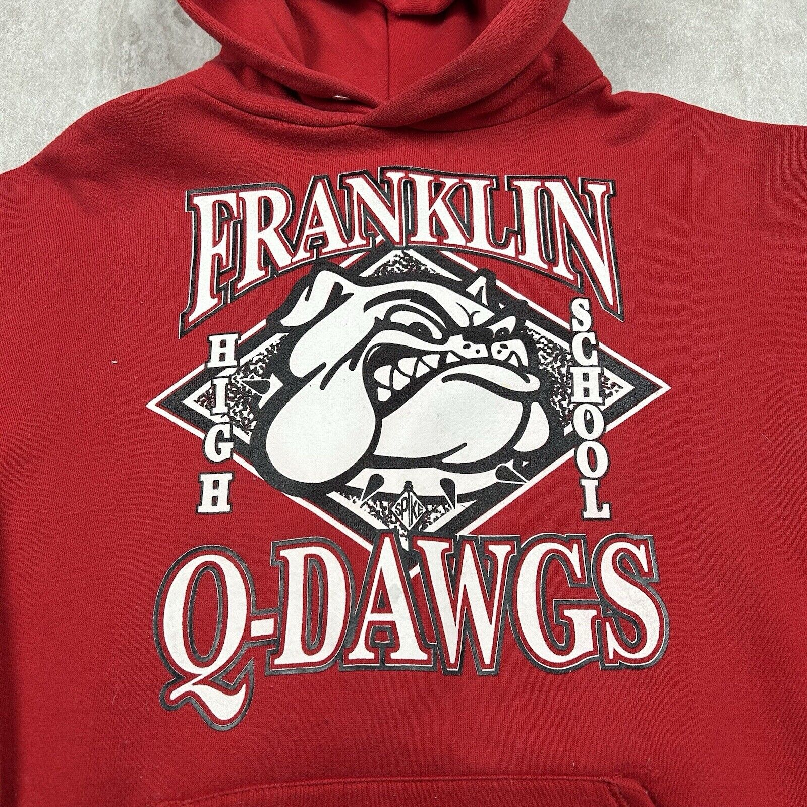 This Vintage 90s Franklin High School Q-Dogs Hoodie in red, size L, features a bold bulldog graphic and classic USA-made construction. A standout piece of nostalgic school spirit.