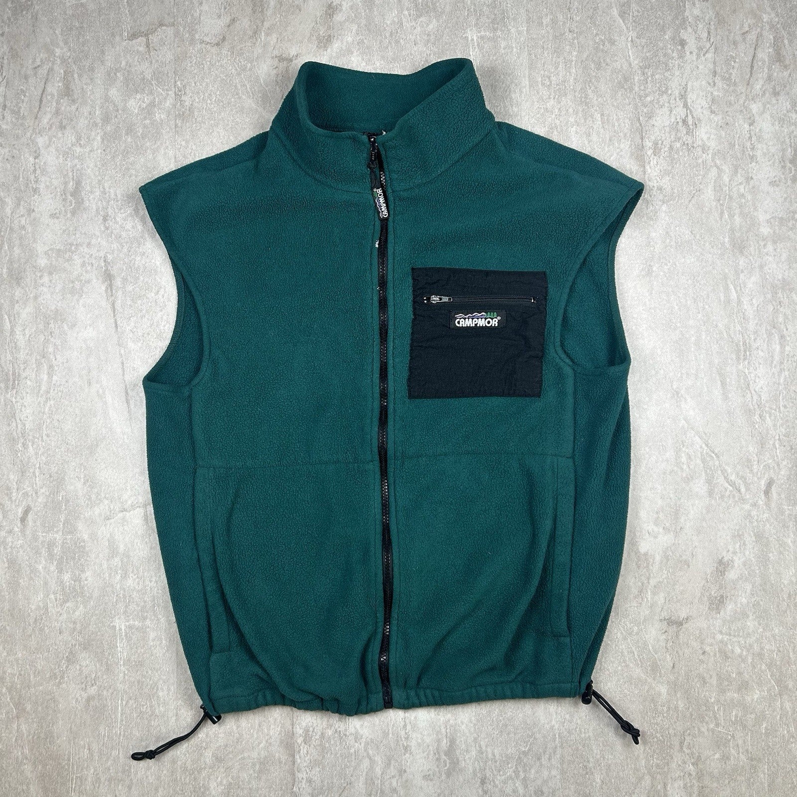 This vintage Campmor nylon fleece vest in green offers both warmth and utility, with convenient pockets for storage. A versatile piece, perfect for layering or outdoor activities. Size is unknown, but it provides a comfortable fit for most.