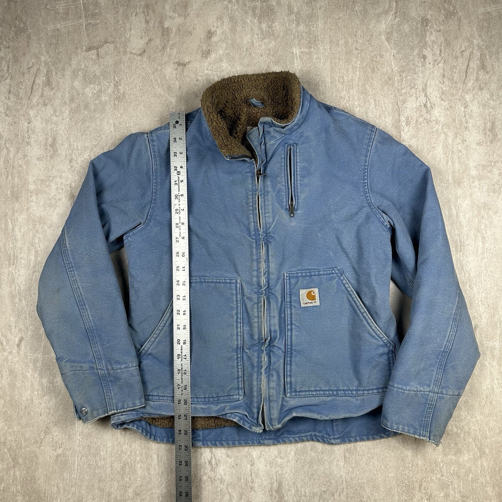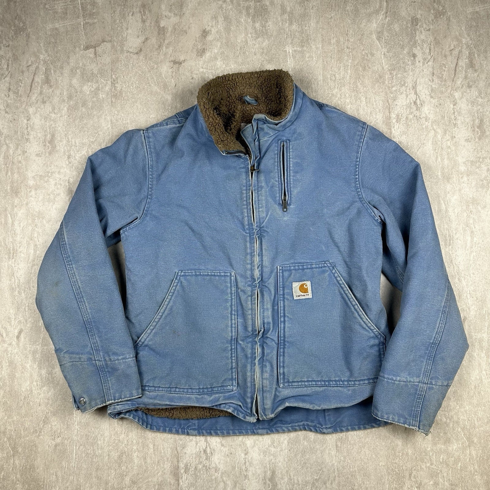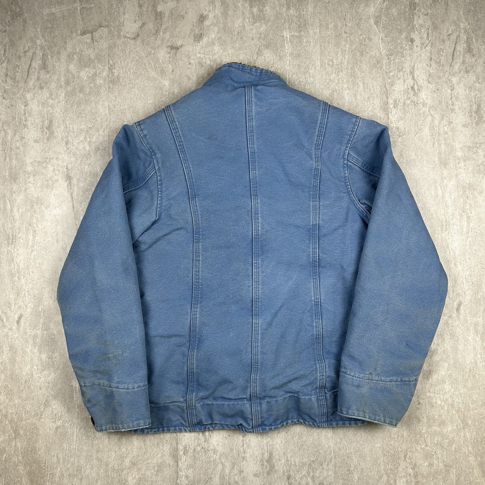 This rare Carhartt J22 workwear jacket in baby blue features a durable canvas shell with a quilted lining for warmth. Zip-up front with classic Carhartt utility. Women's size M.