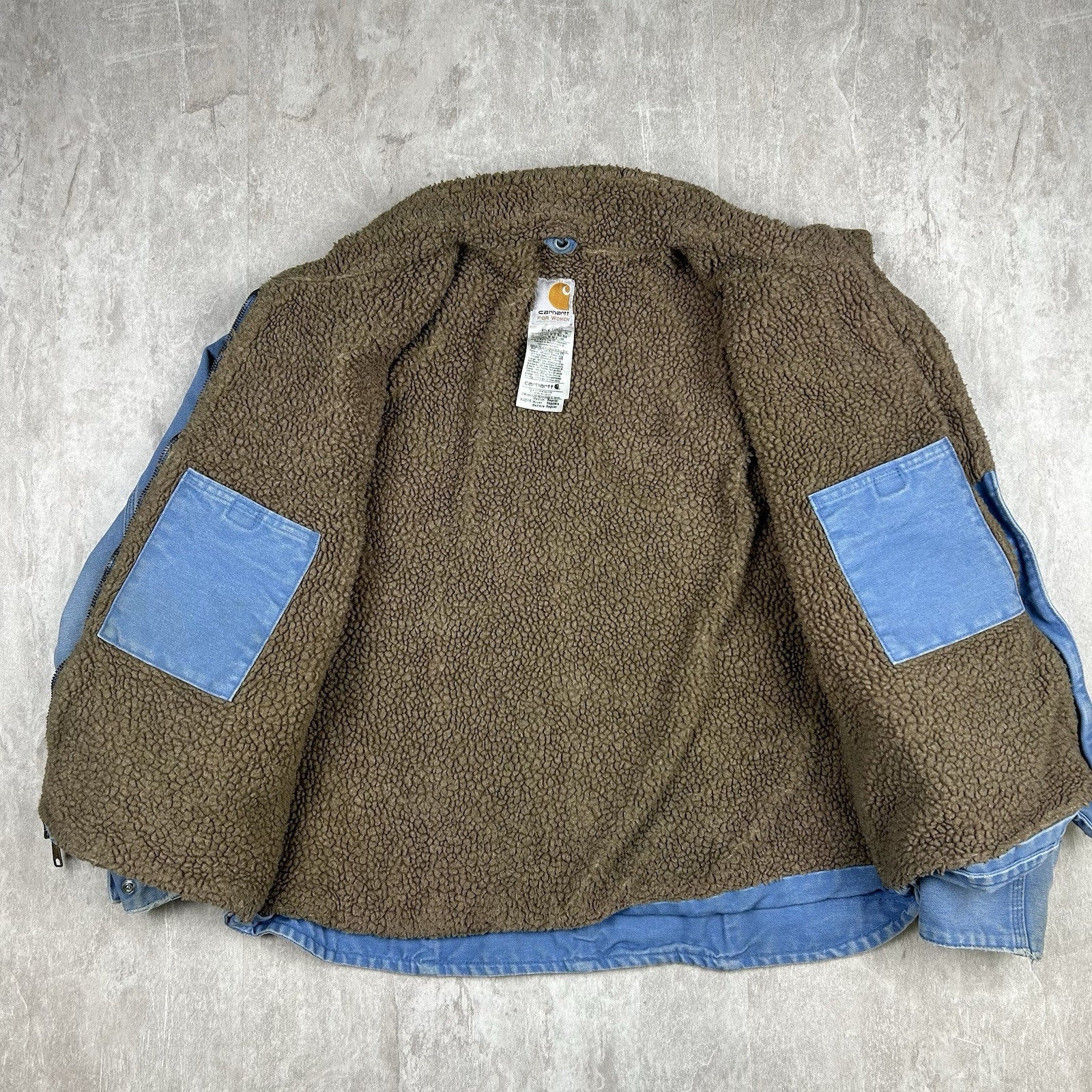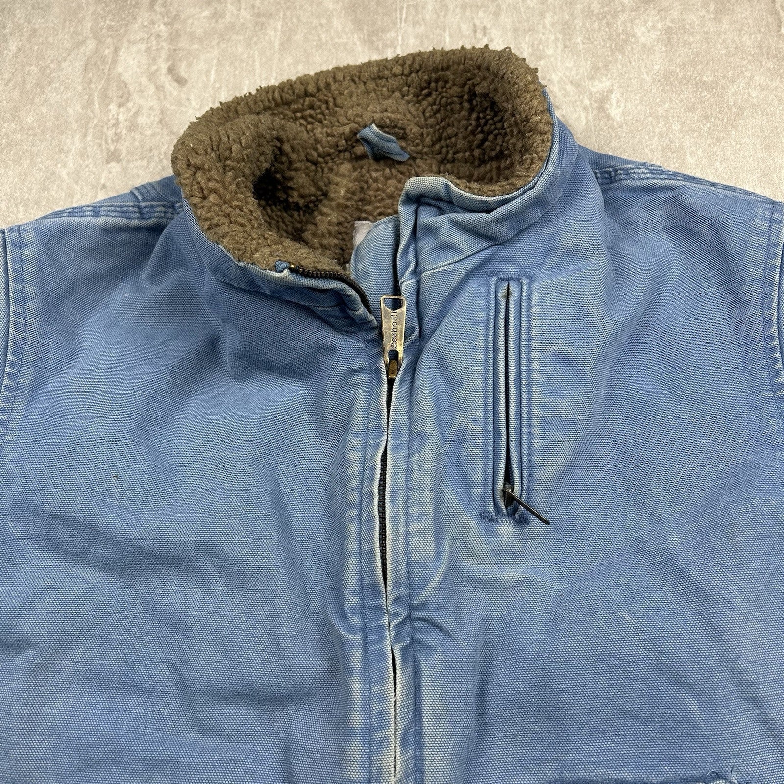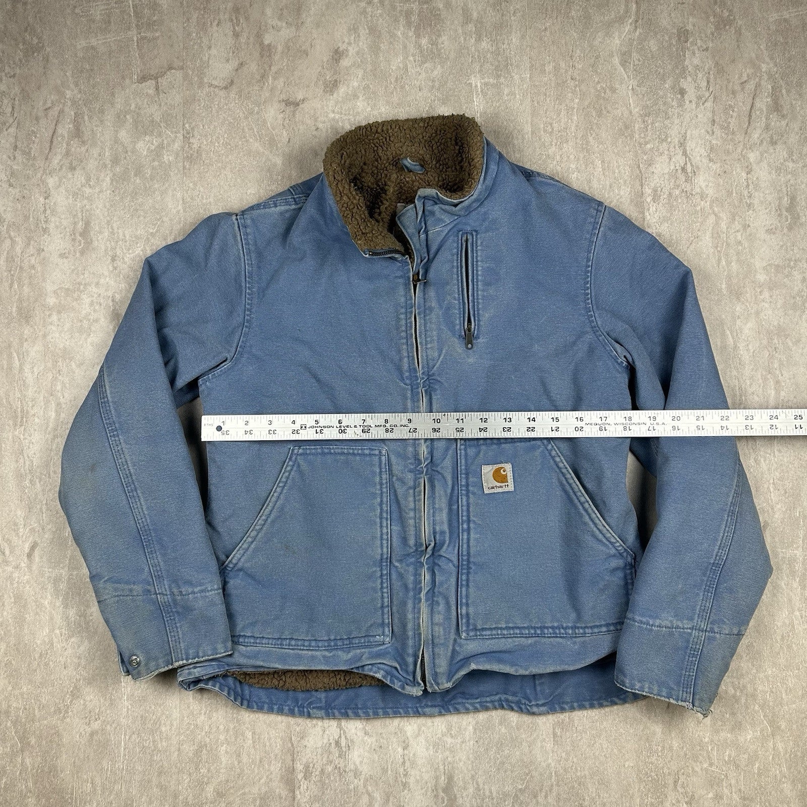 This rare Carhartt J22 workwear jacket in baby blue features a durable canvas shell with a quilted lining for warmth. Zip-up front with classic Carhartt utility. Women's size M.