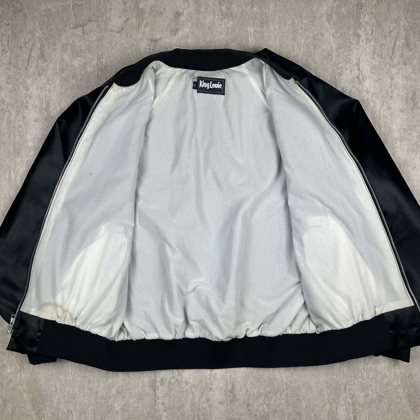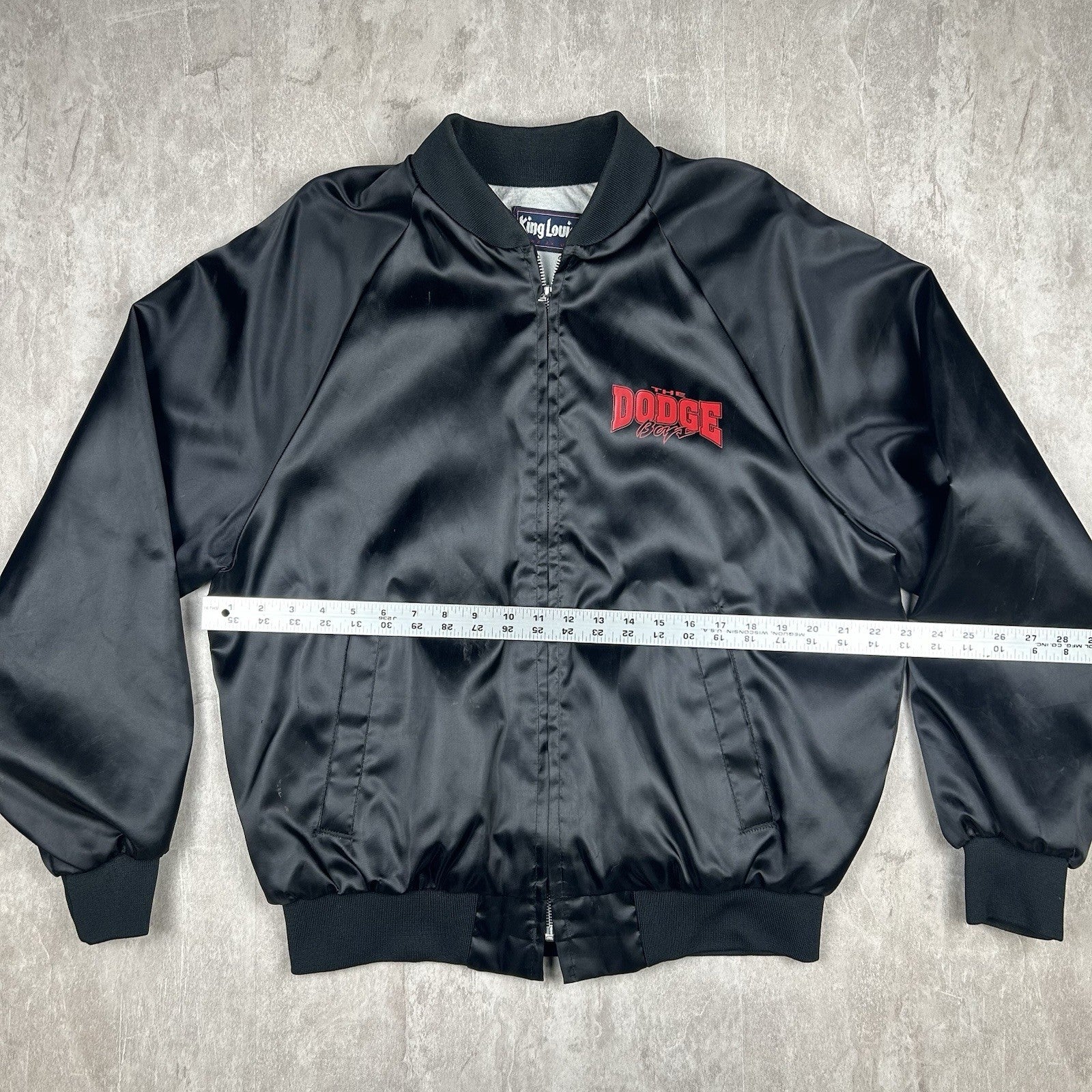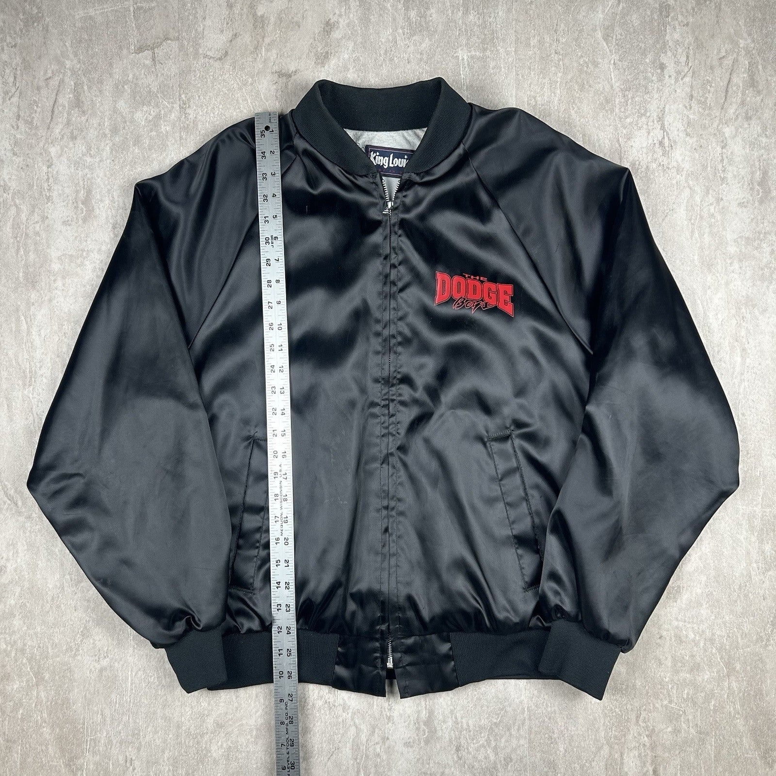 Sleek vintage King Louie satin jacket featuring Dodge branding and a made-in-USA tag. Classic black with bold embroidered details and a full zip front. Men's size L.