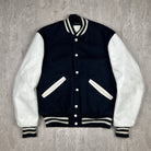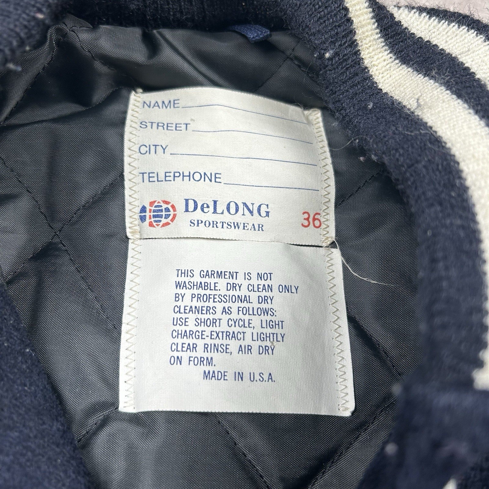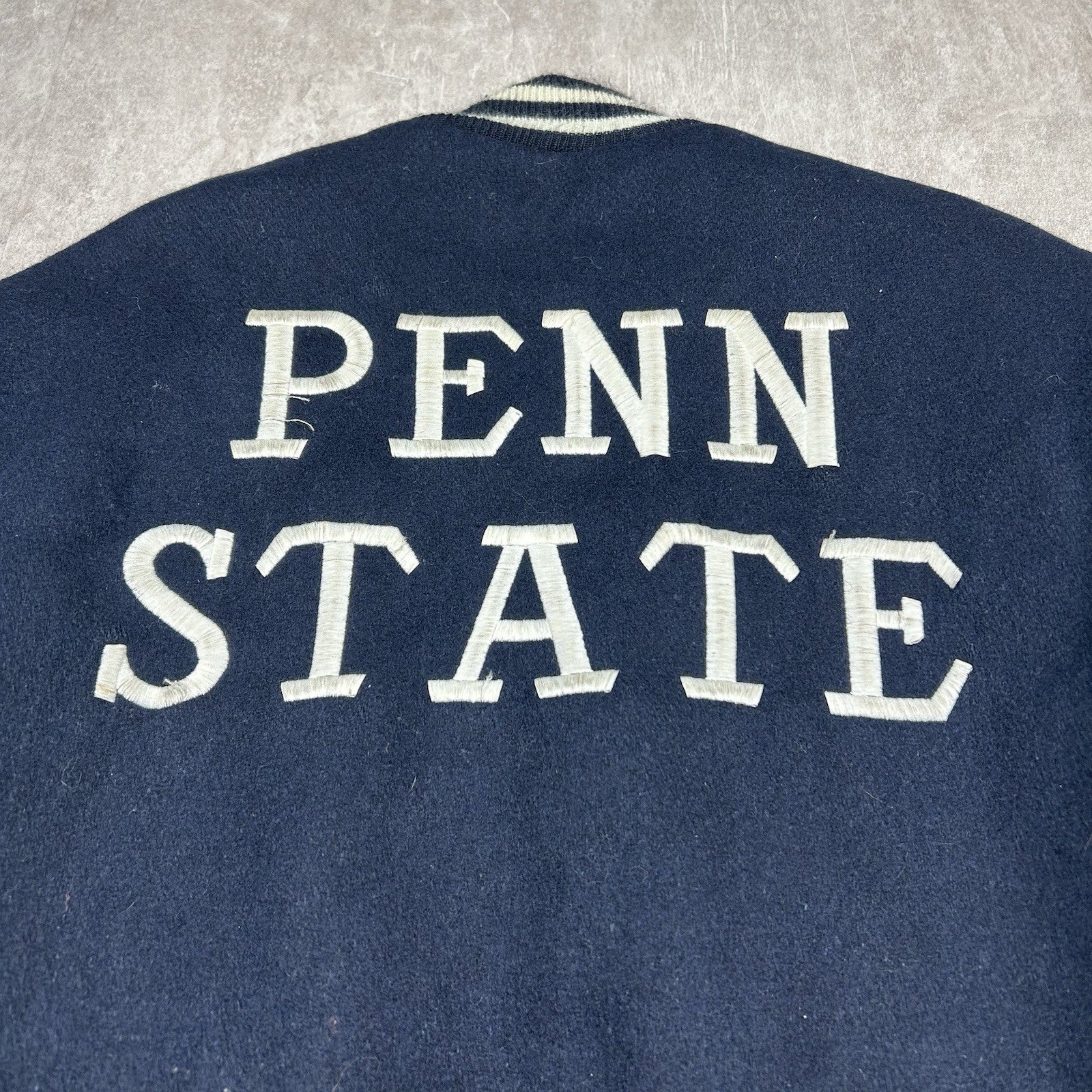 Classic varsity-style Penn State Nittany Lions jacket by Delong Sportswear. Features snap buttons, striped cuffs, and iconic school branding. Men's size 36.