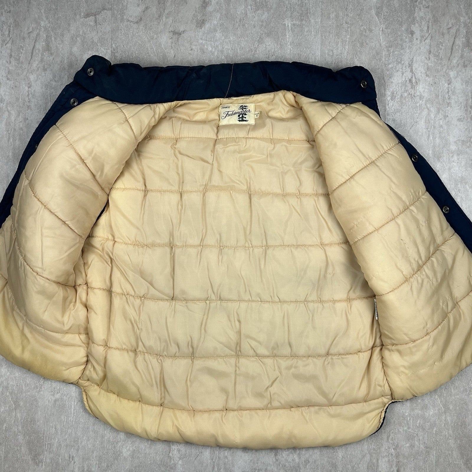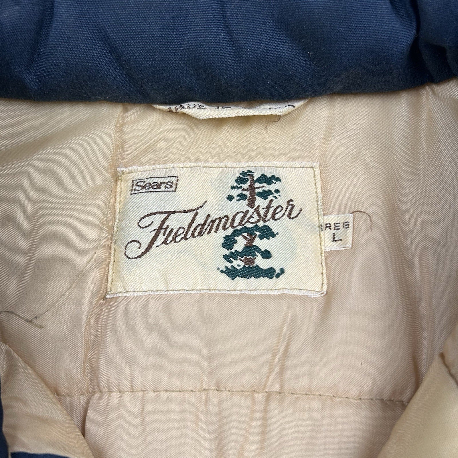Classic vintage Sears Fieldmaster sleeveless vest in navy blue, featuring a rugged canvas shell, zip front, and cozy quilted lining. Timeless workwear style in men's size L.