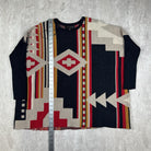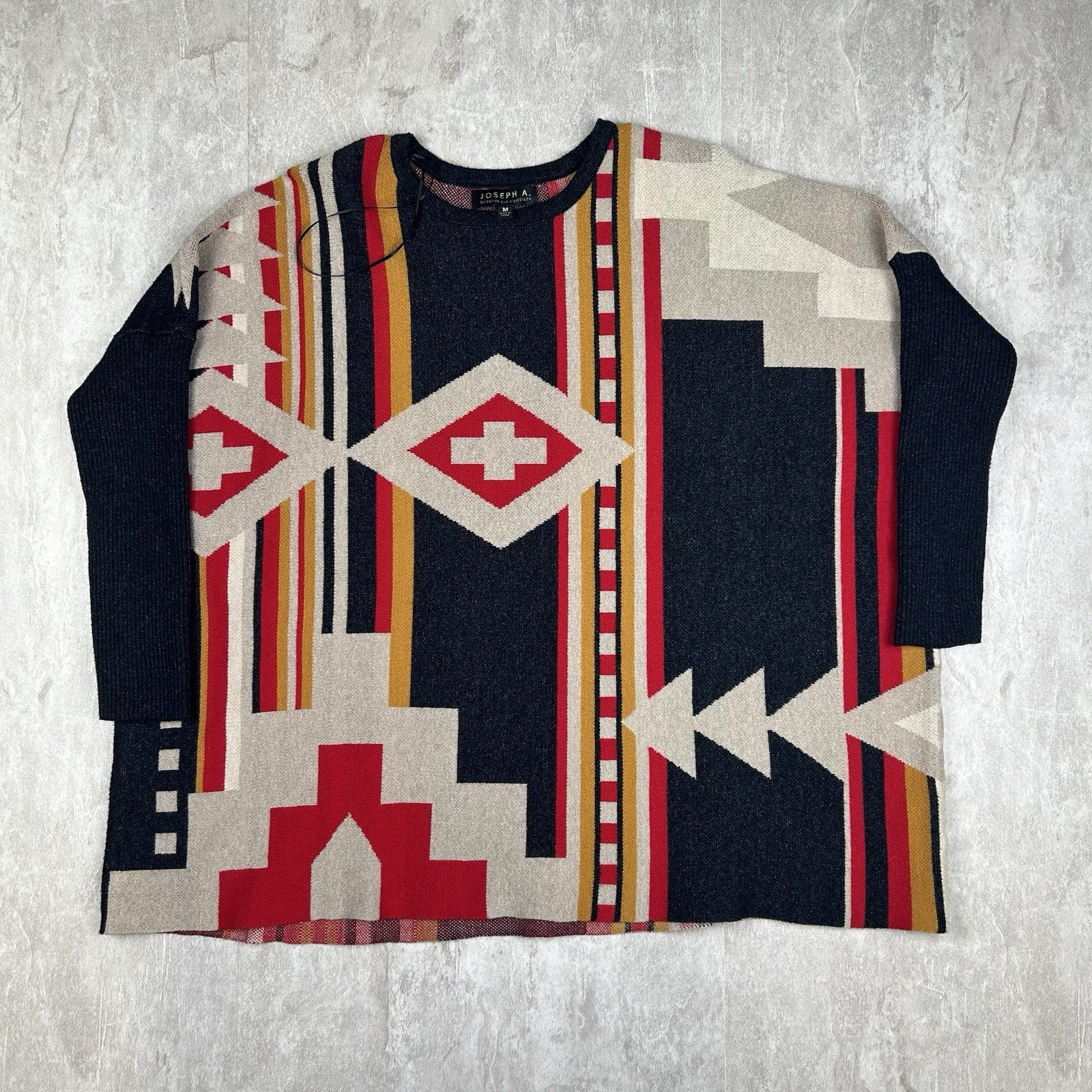 Bold and cozy Joseph A. knit poncho sweater in a vibrant multicolor Aztec-inspired pattern. Long sleeve design with a relaxed fit and soft drape. Tagged women's size M.