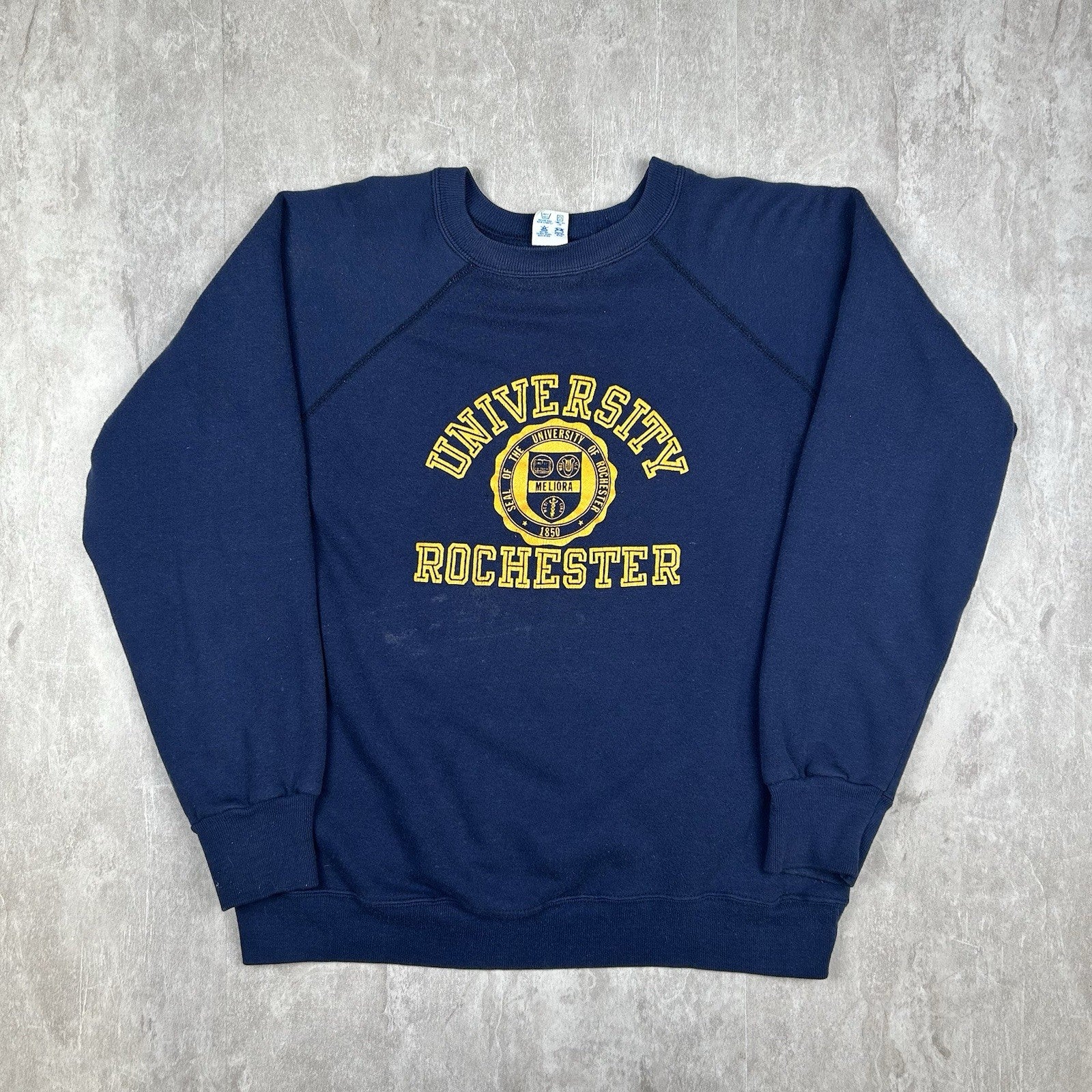 Classic collegiate style from the 1980s, this vintage Champion crewneck features the University of Rochester logo on soft, heavyweight cotton. Made in the USA with Champion's iconic quality and fit, men's size XL.