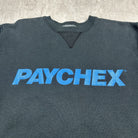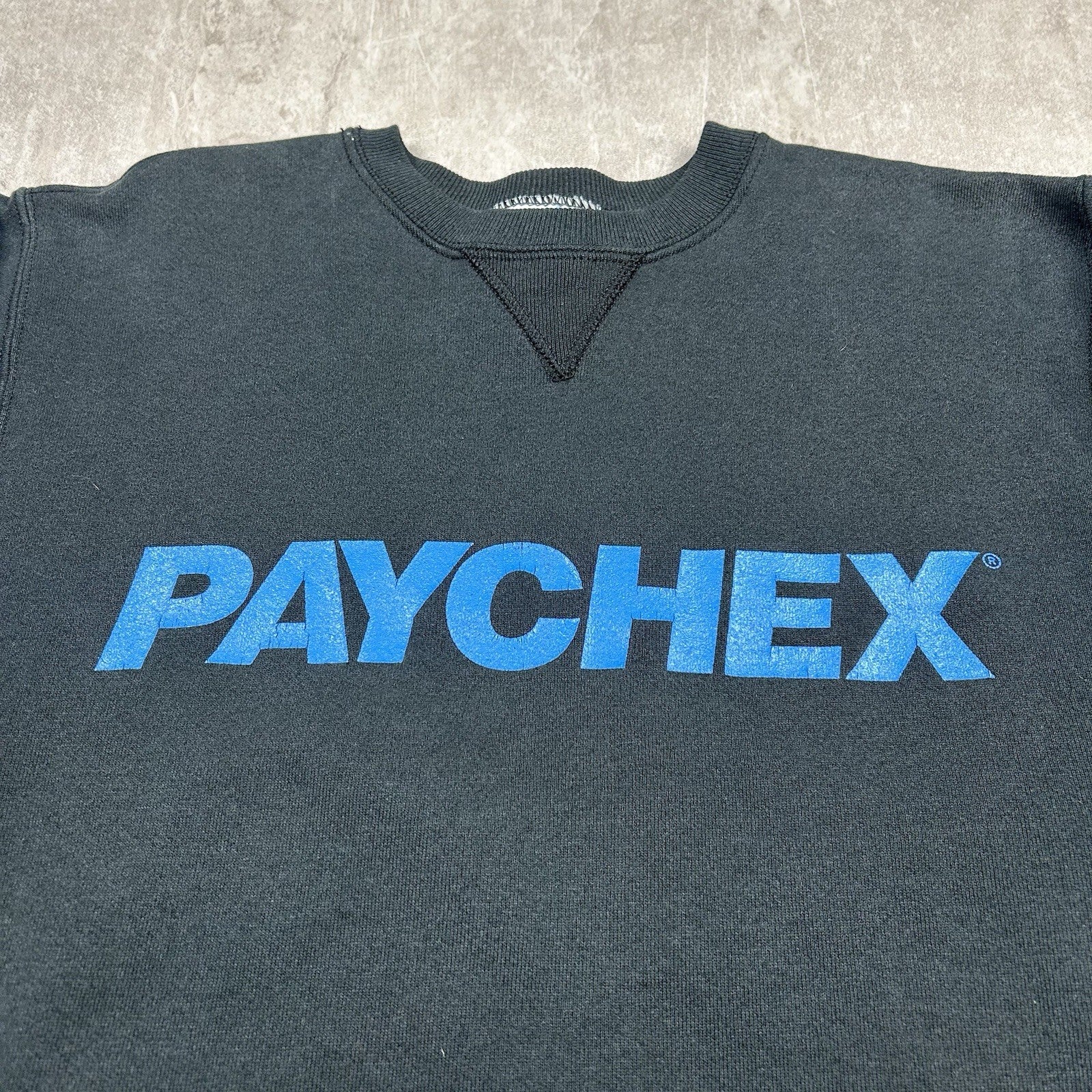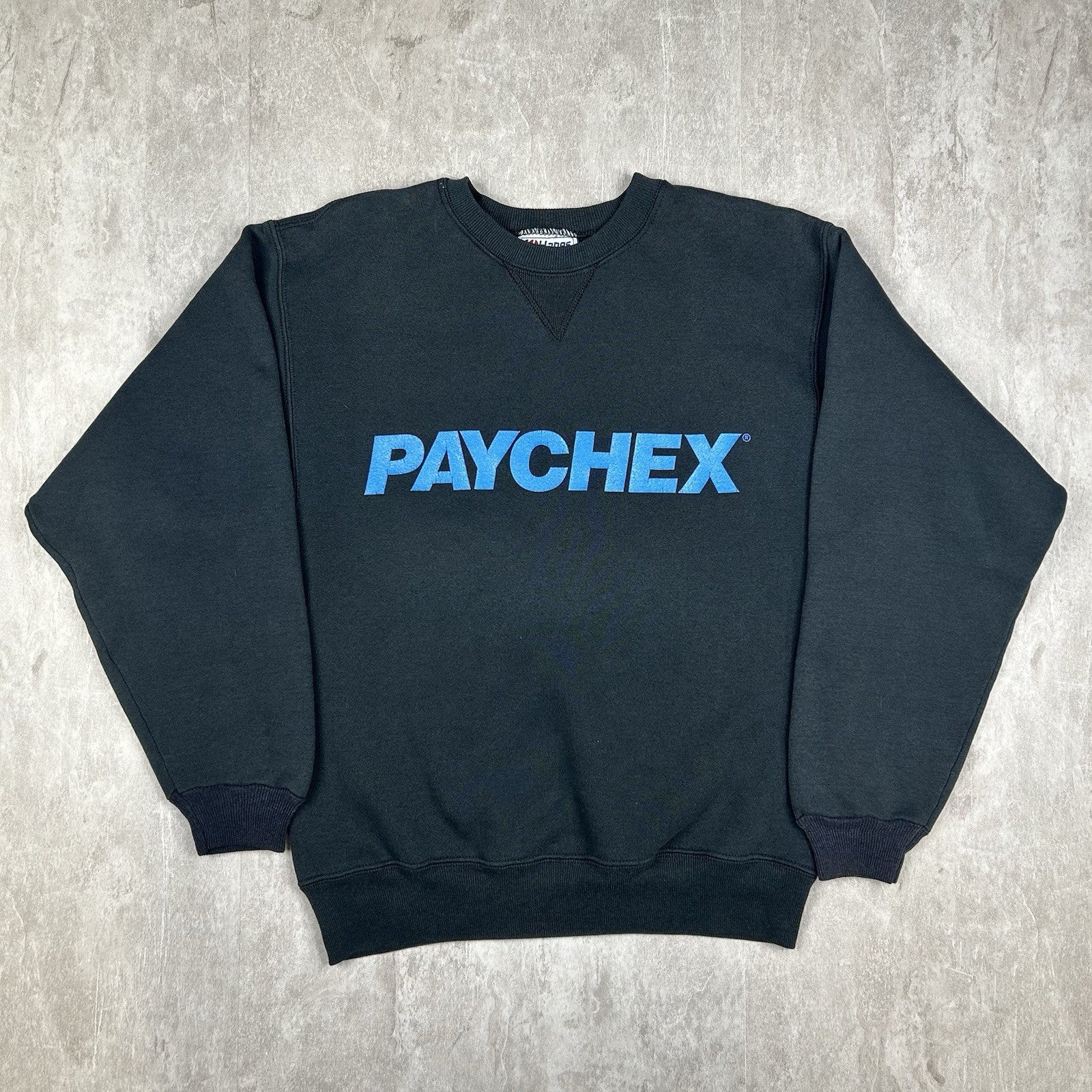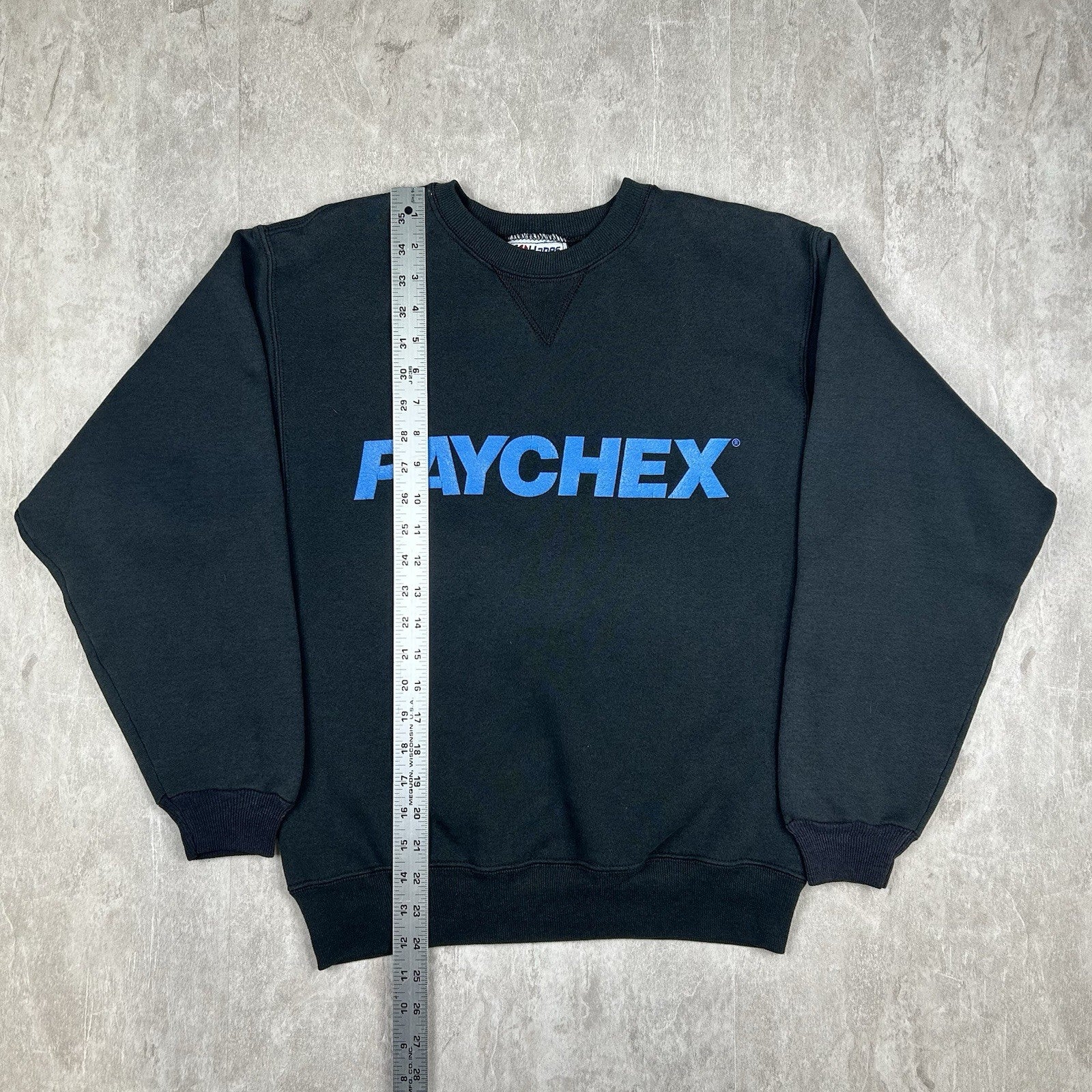 Throwback to the 1980s with this vintage Paychex crewneck sweatshirt repping Rochester, NY. Classic Hanes tag, black heavyweight cotton, and a bold front logo make this a rare hometown find. Men's size M.