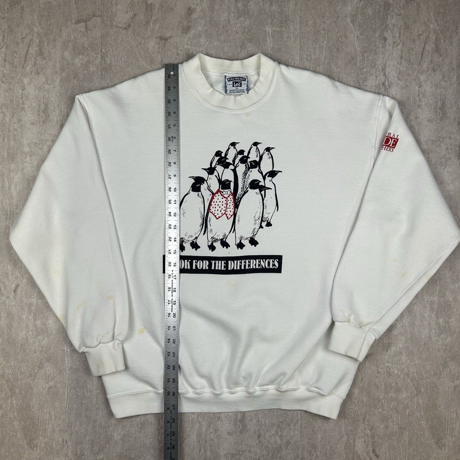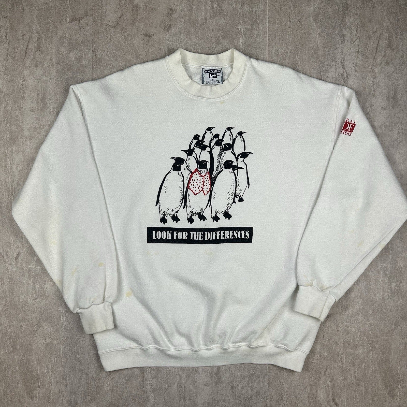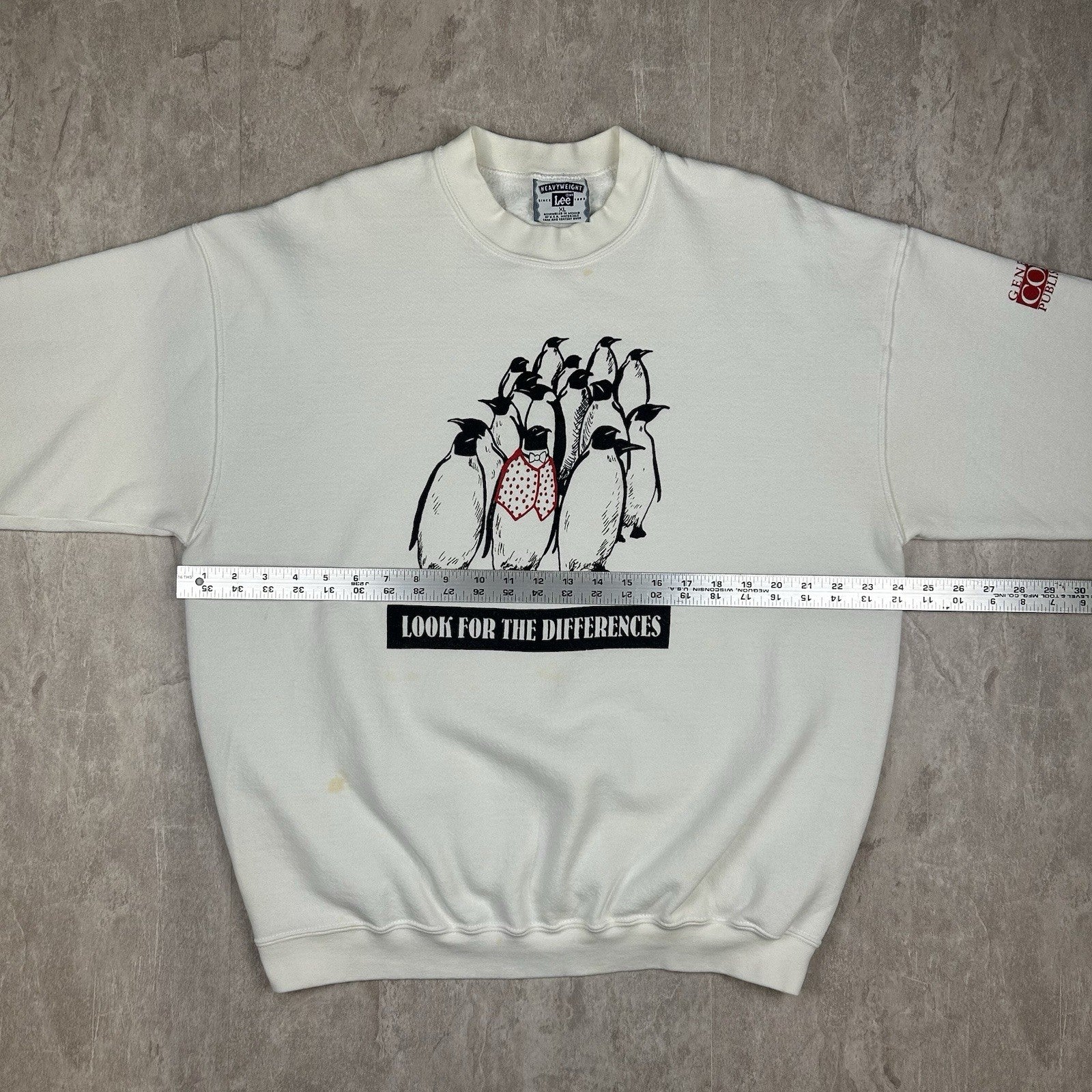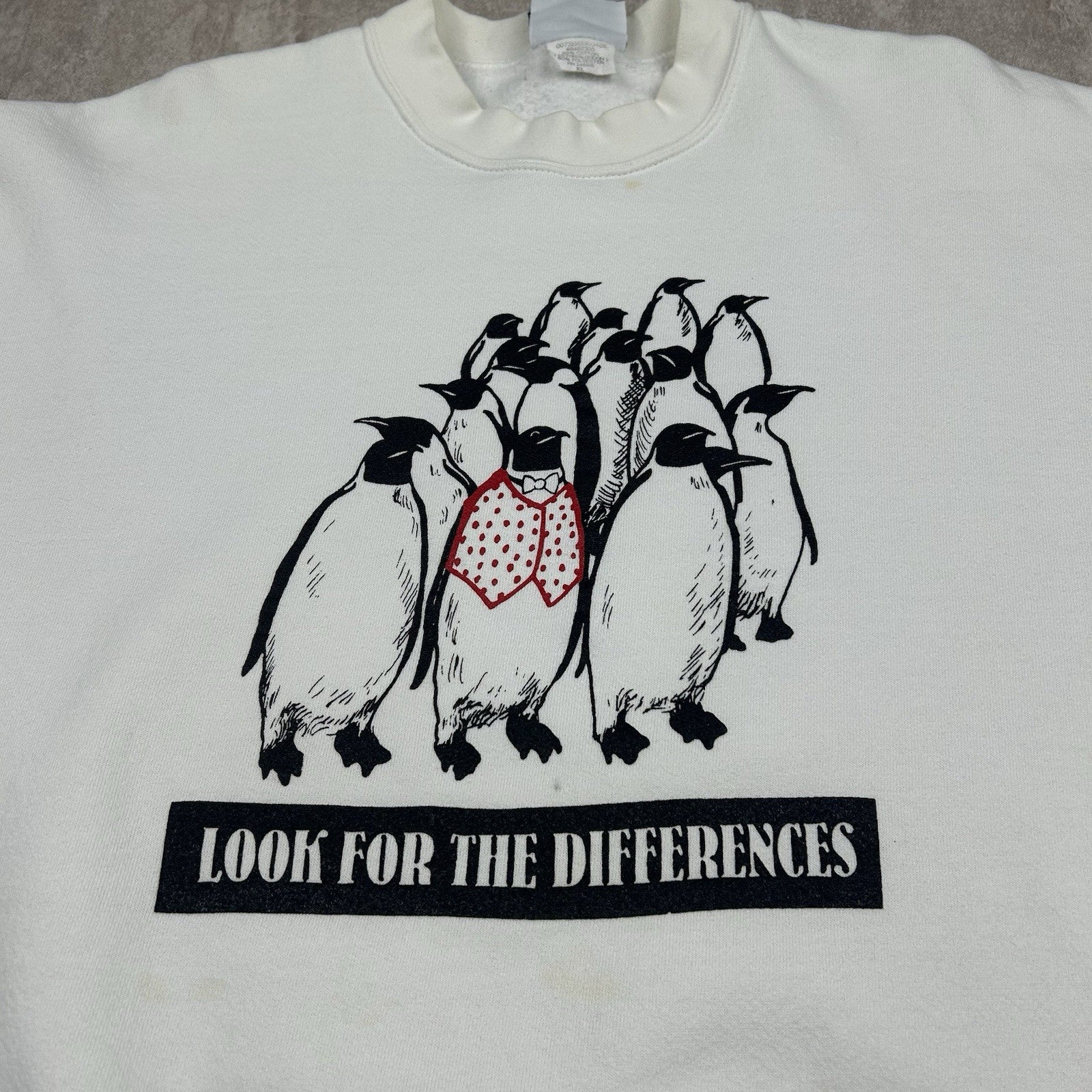 This vintage 90s crewneck sweatshirt features a playful "Penguin Look For The Differences" graphic. Cozy and unique, it's a fun retro piece. Men's size XL.