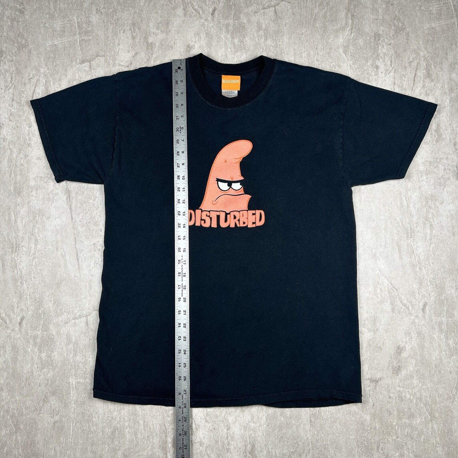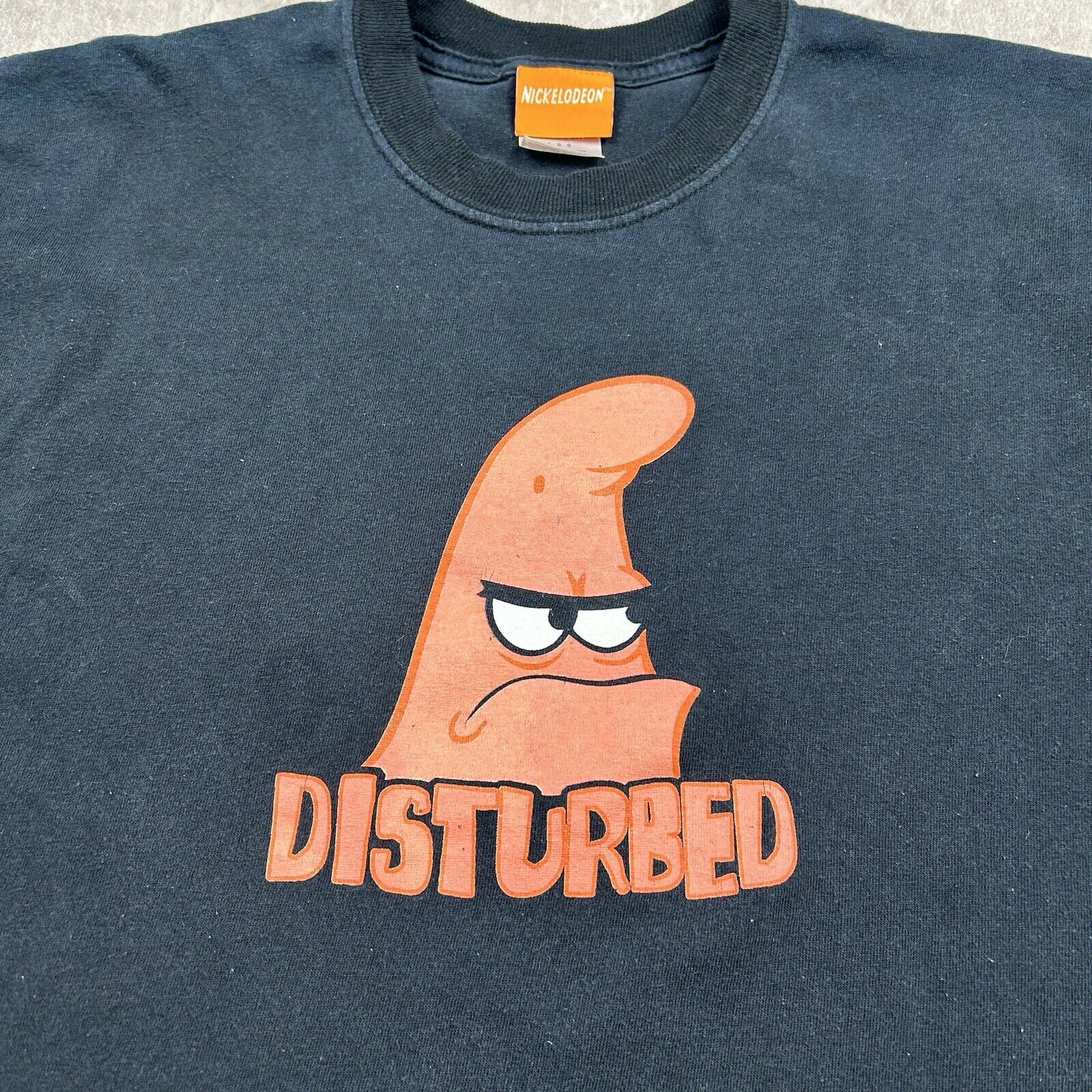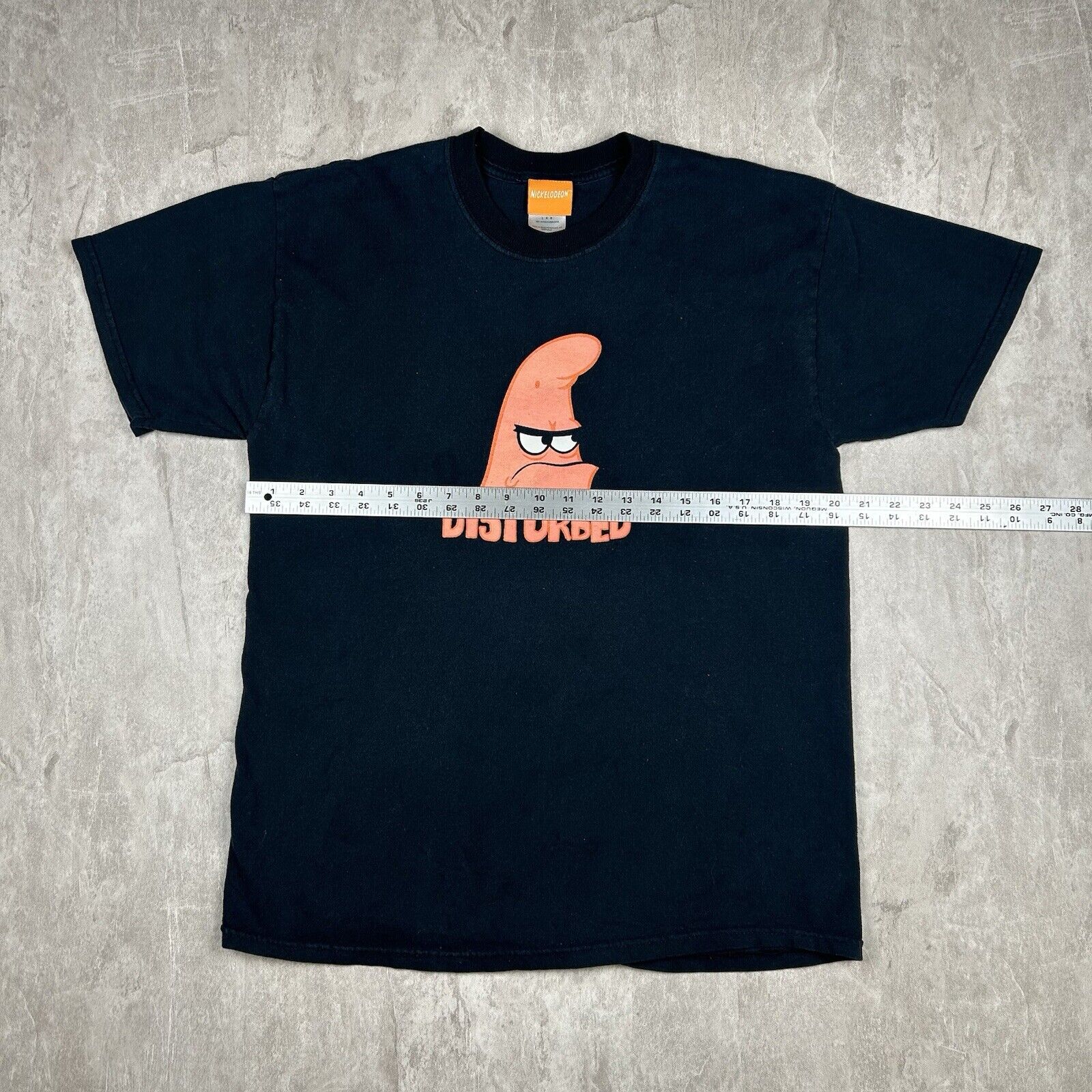 Embrace nostalgia with this Vintage 2004 Patrick 'Disturbed' Spongebob T-Shirt. In black, this men's size L tee features a hilarious graphic of Patrick from the beloved Nickelodeon show, Spongebob Squarepants. A must-have for fans of 2000s cartoons and quirky humor.