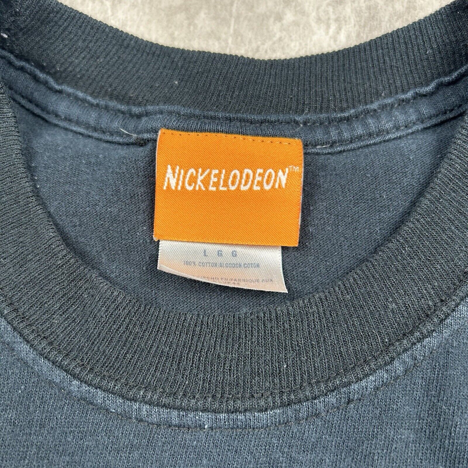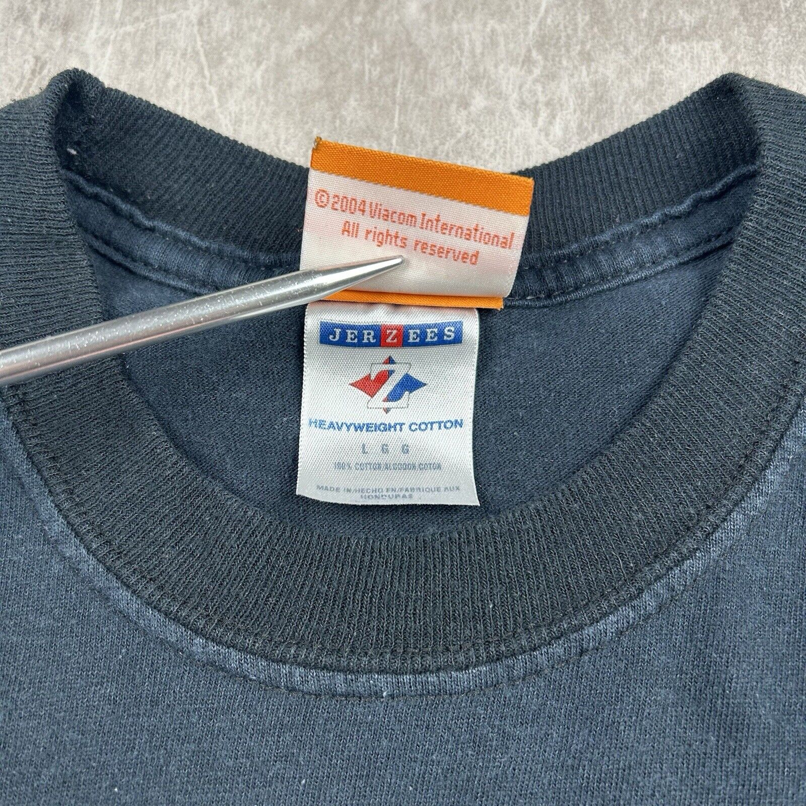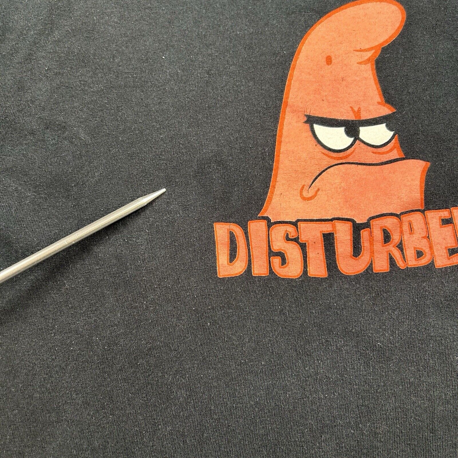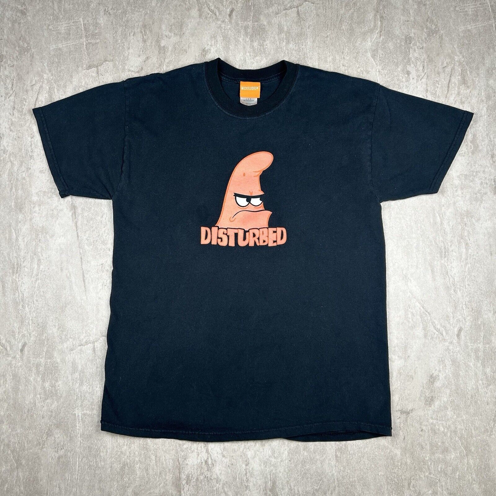 Embrace nostalgia with this Vintage 2004 Patrick 'Disturbed' Spongebob T-Shirt. In black, this men's size L tee features a hilarious graphic of Patrick from the beloved Nickelodeon show, Spongebob Squarepants. A must-have for fans of 2000s cartoons and quirky humor.