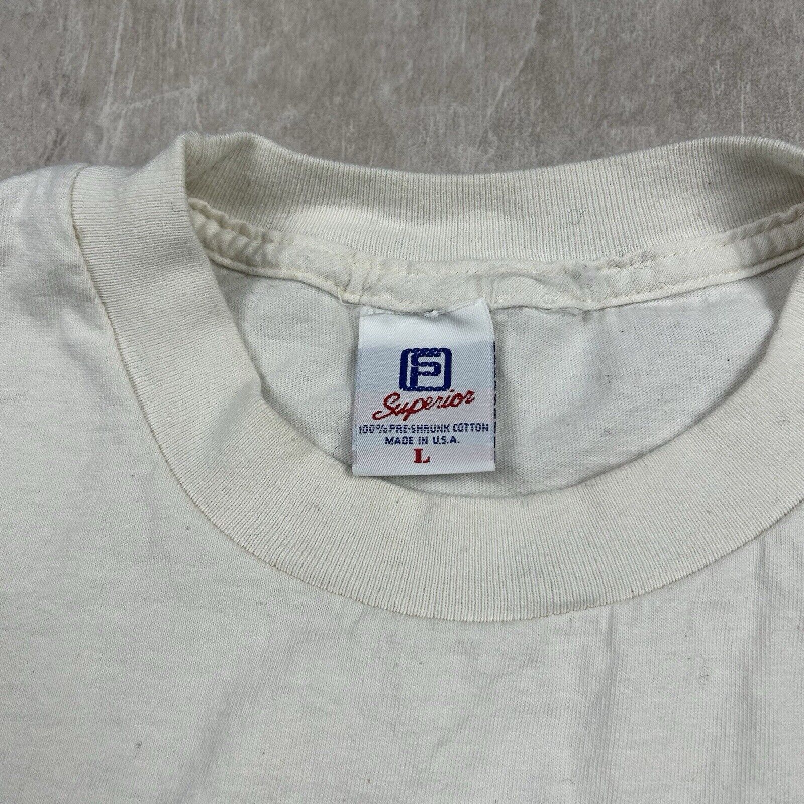 Stand out with this Vtg 90s Kia 'Nice Doggie' Monster Dinosaur T-Shirt. In men's size L, this white tee features a bold and playful graphic of a dinosaur, adding a quirky twist to your vintage collection. Made by Superior, it's a fun throwback piece for any casual outfit.