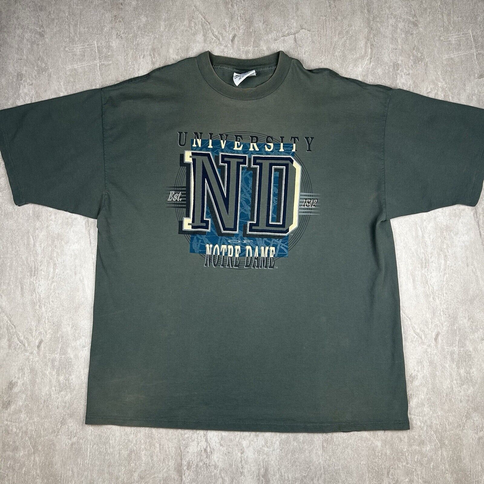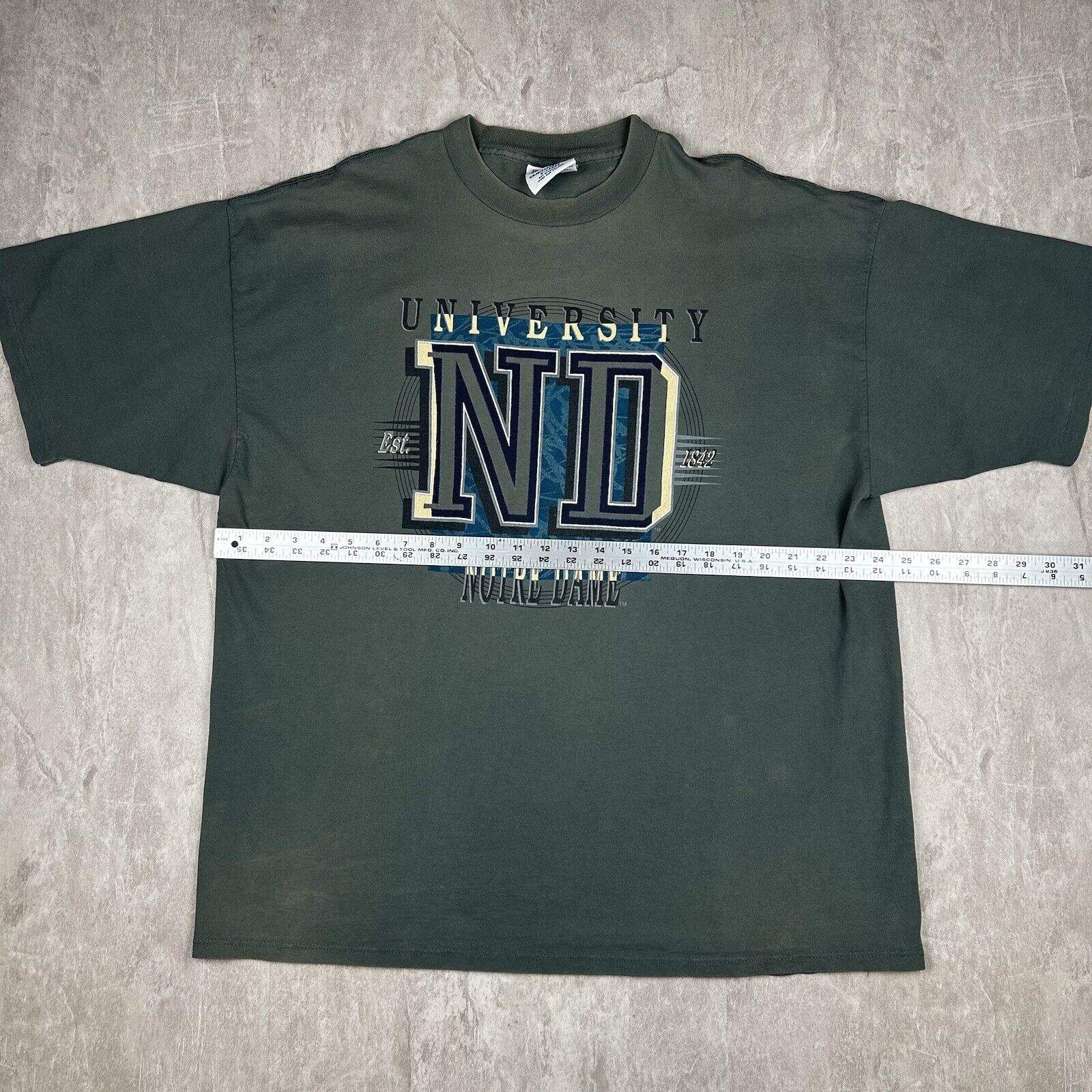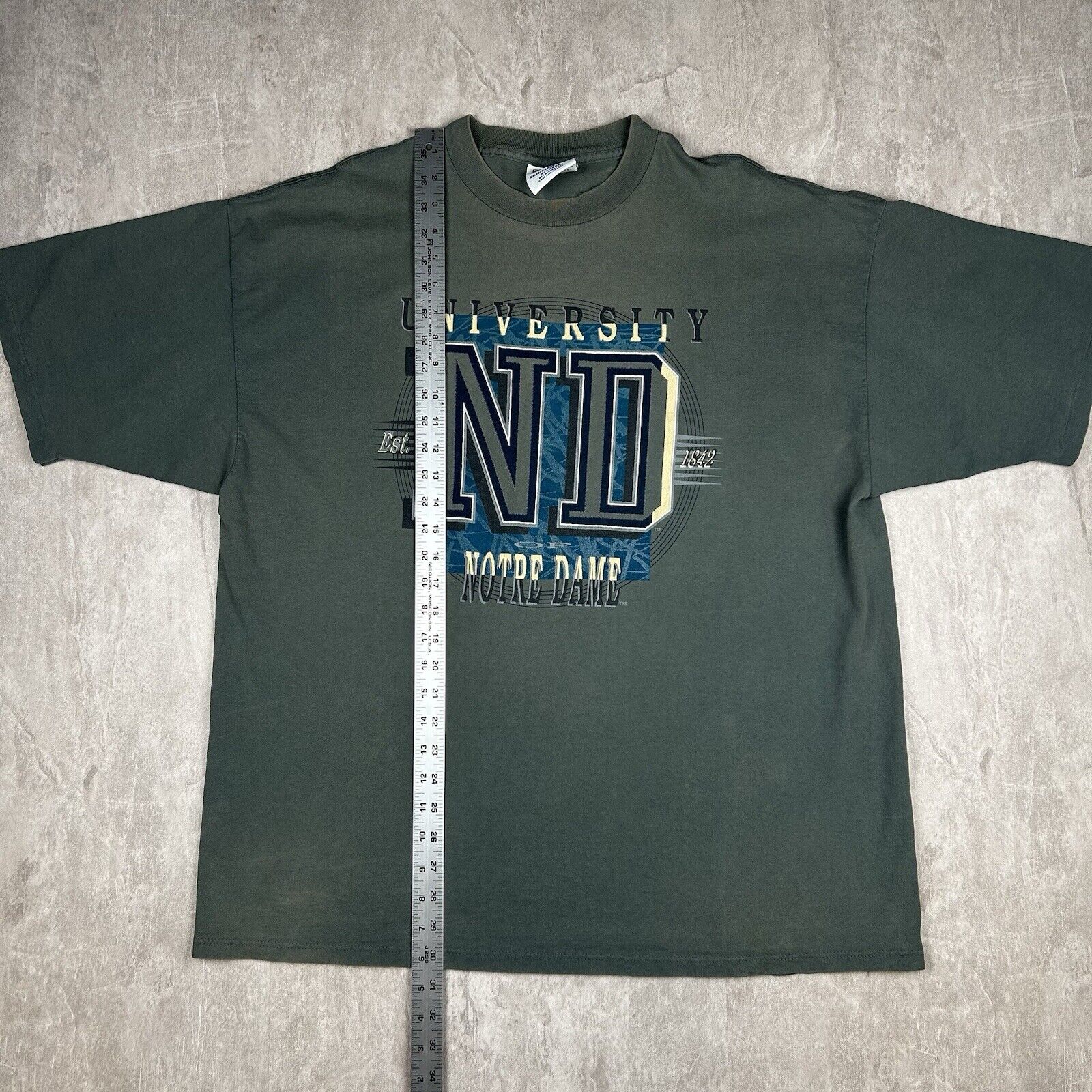 This vintage 90s Notre Dame Fighting Irish T-shirt features a classic green color and a single-stitch construction, a hallmark of true vintage. In Men's size XL, it's perfect for fans of the iconic college team looking for a retro piece to add to their collection.