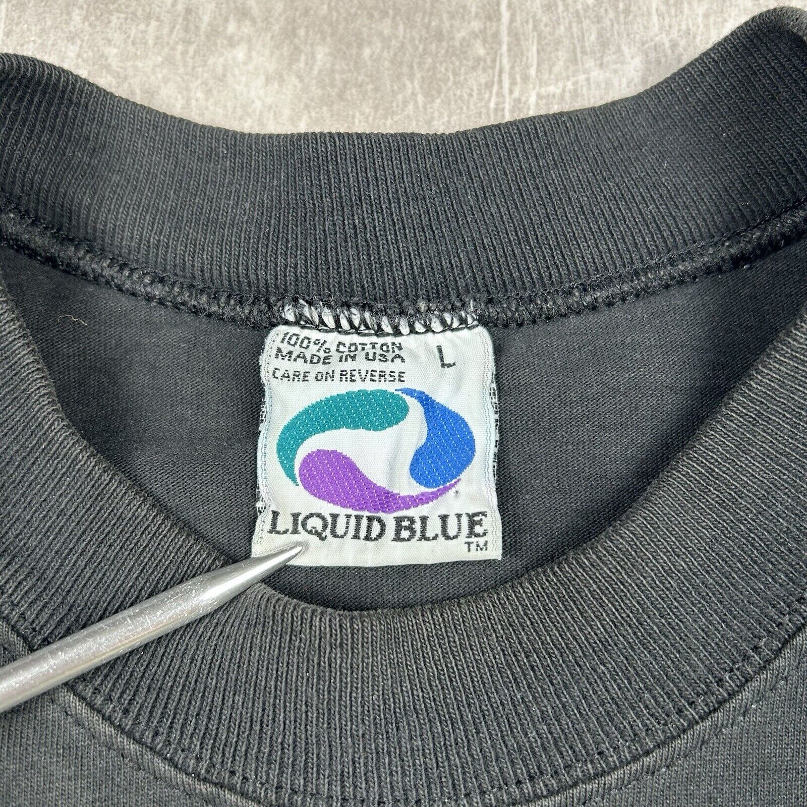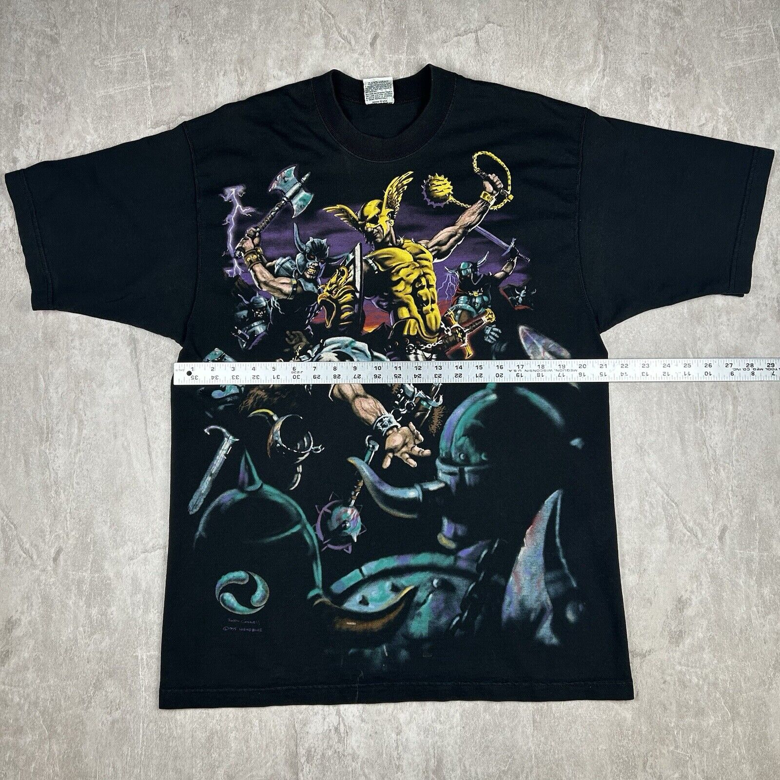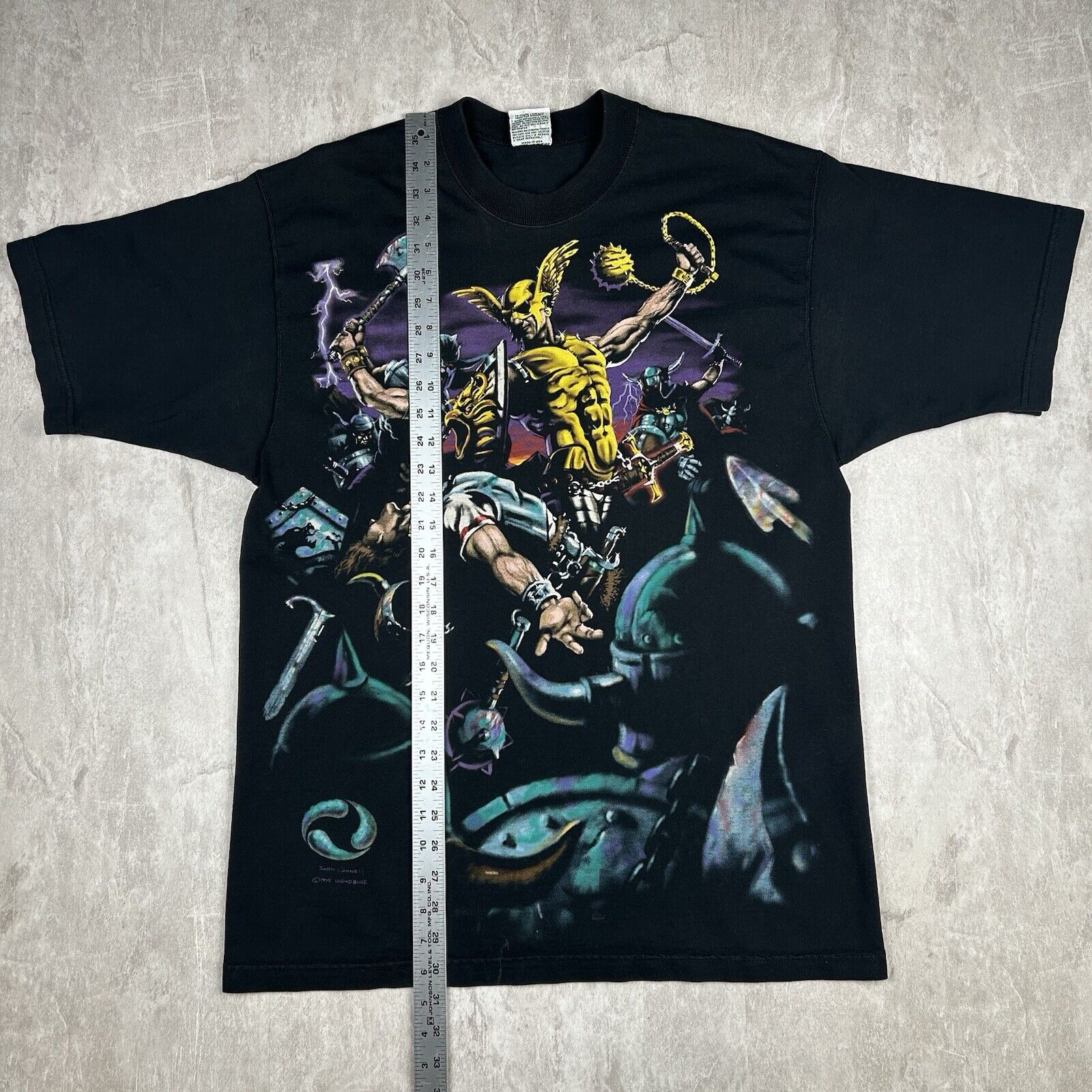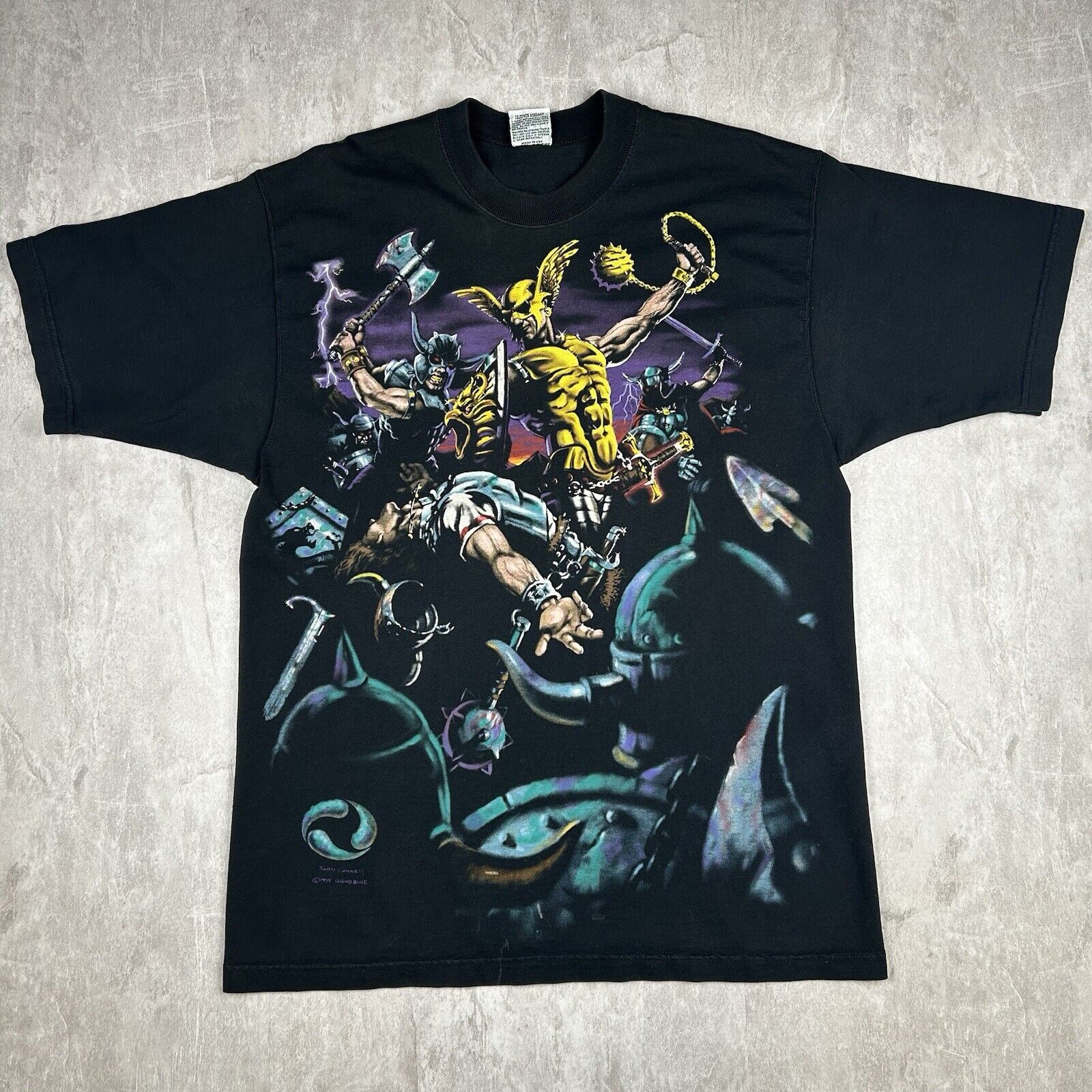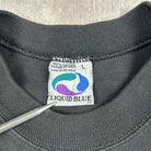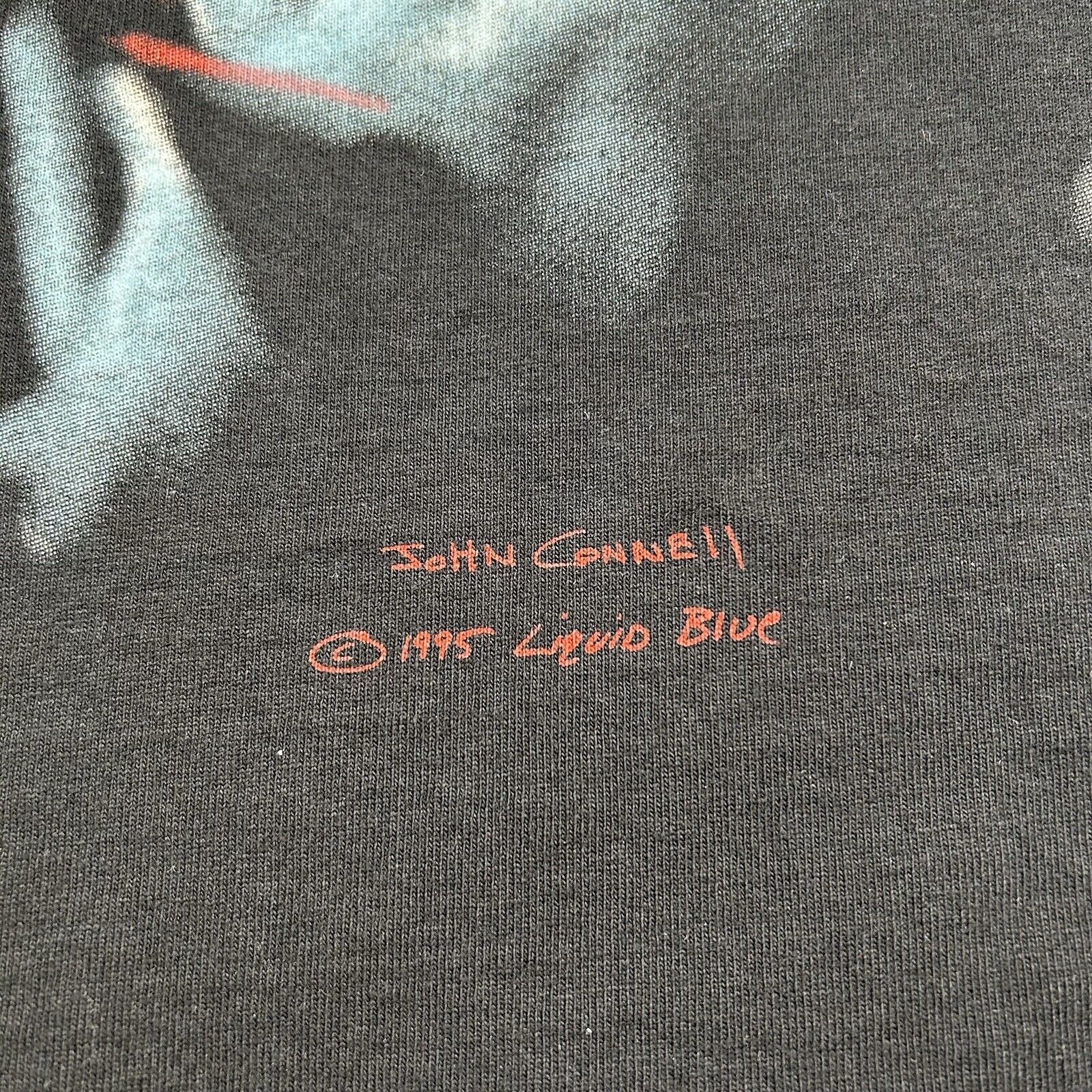 Step back into the 90s with this incredible 1995 Liquid Blue tee featuring John Connell's captivating ogre vs. Greek god battle artwork. A standout piece for lovers of bold vintage graphics. Men's Size L.