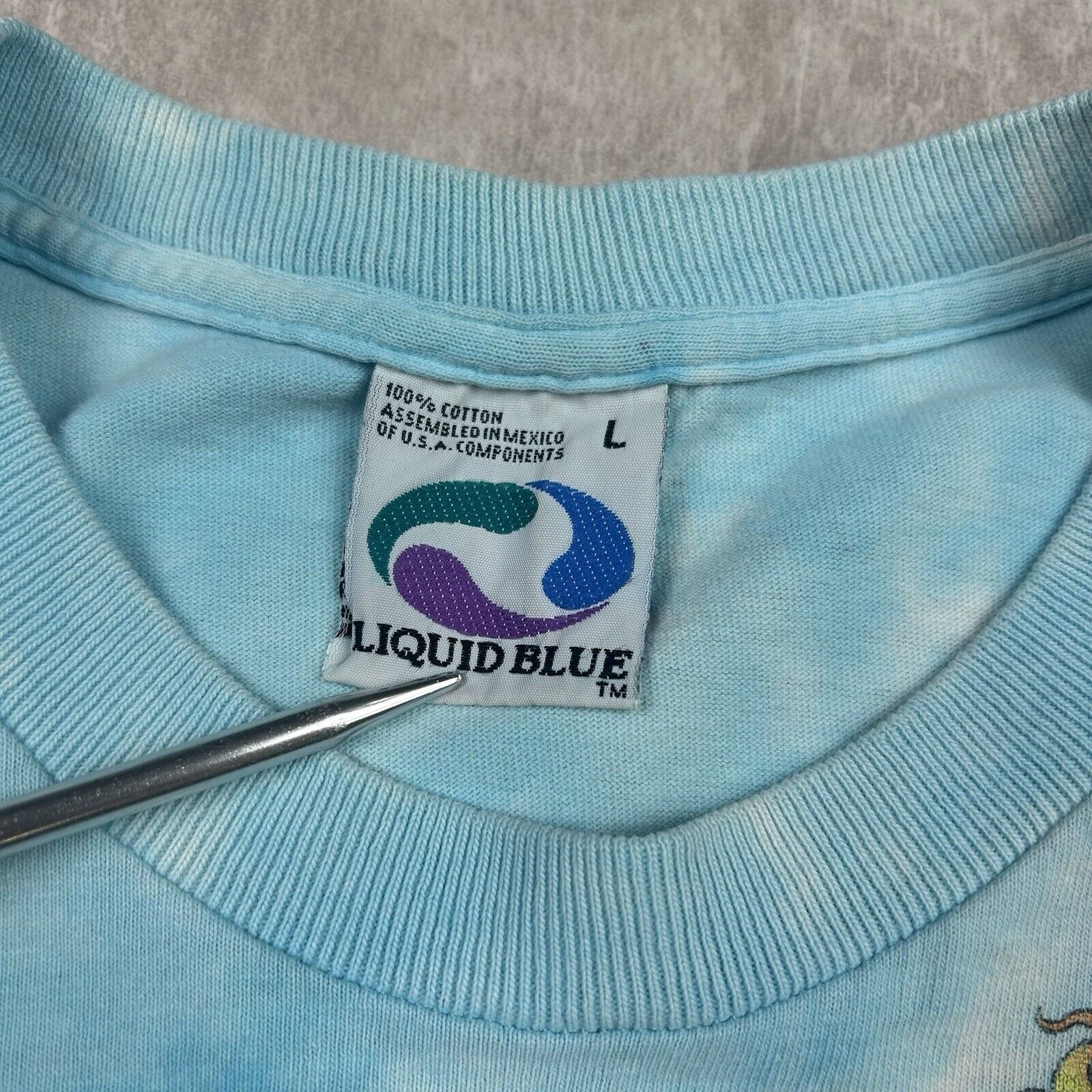 This vintage 90s Liquid Blue Grateful Dead T-shirt features the iconic parachuting bears graphic, capturing the band's vibrant spirit. Men's size L, perfect for fans of the Dead or 90s nostalgia.