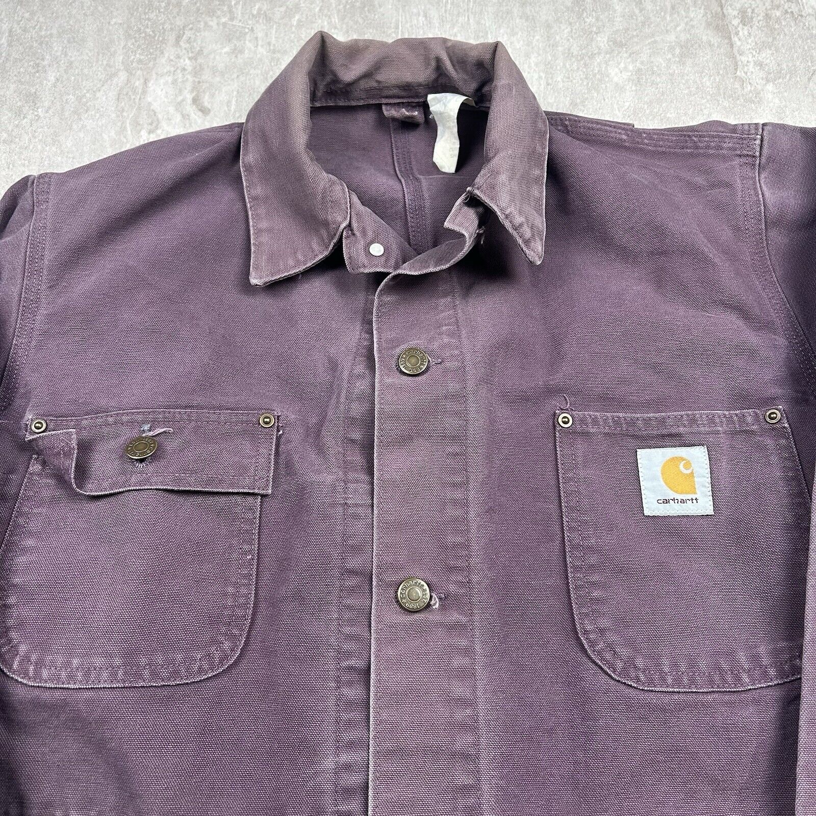 Elevate your wardrobe with this vintage 90s Carhartt chore coat in a rare purple colorway. Made in the USA, it features classic rugged construction with a nod to Michigan roots, ideal for work or casual wear. Men's size S.