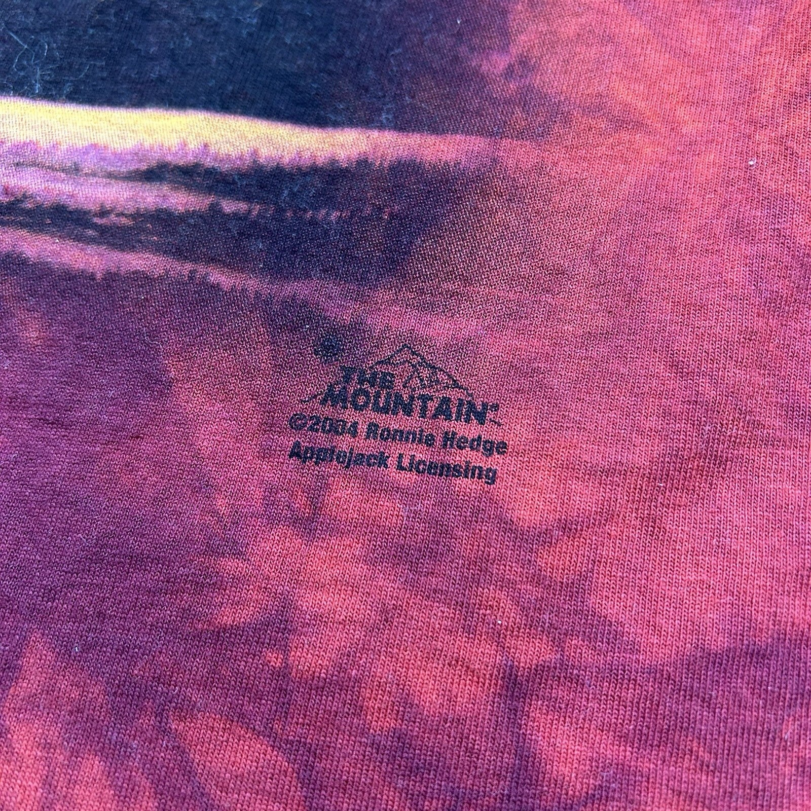 This Y2K 2004 The Mountain T-shirt features a majestic bald eagle graphic on a bold red tie-dye backdrop. Made from 100% organic cotton, it's a standout piece for nature lovers and vintage tee collectors. Men's size L.