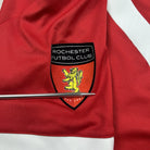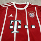 Official 2017-18 FC Bayern Munich home jersey by Adidas. Classic red design with white vertical pinstripes, embroidered club crest, and T-Mobile sponsor logo. Men's size M.