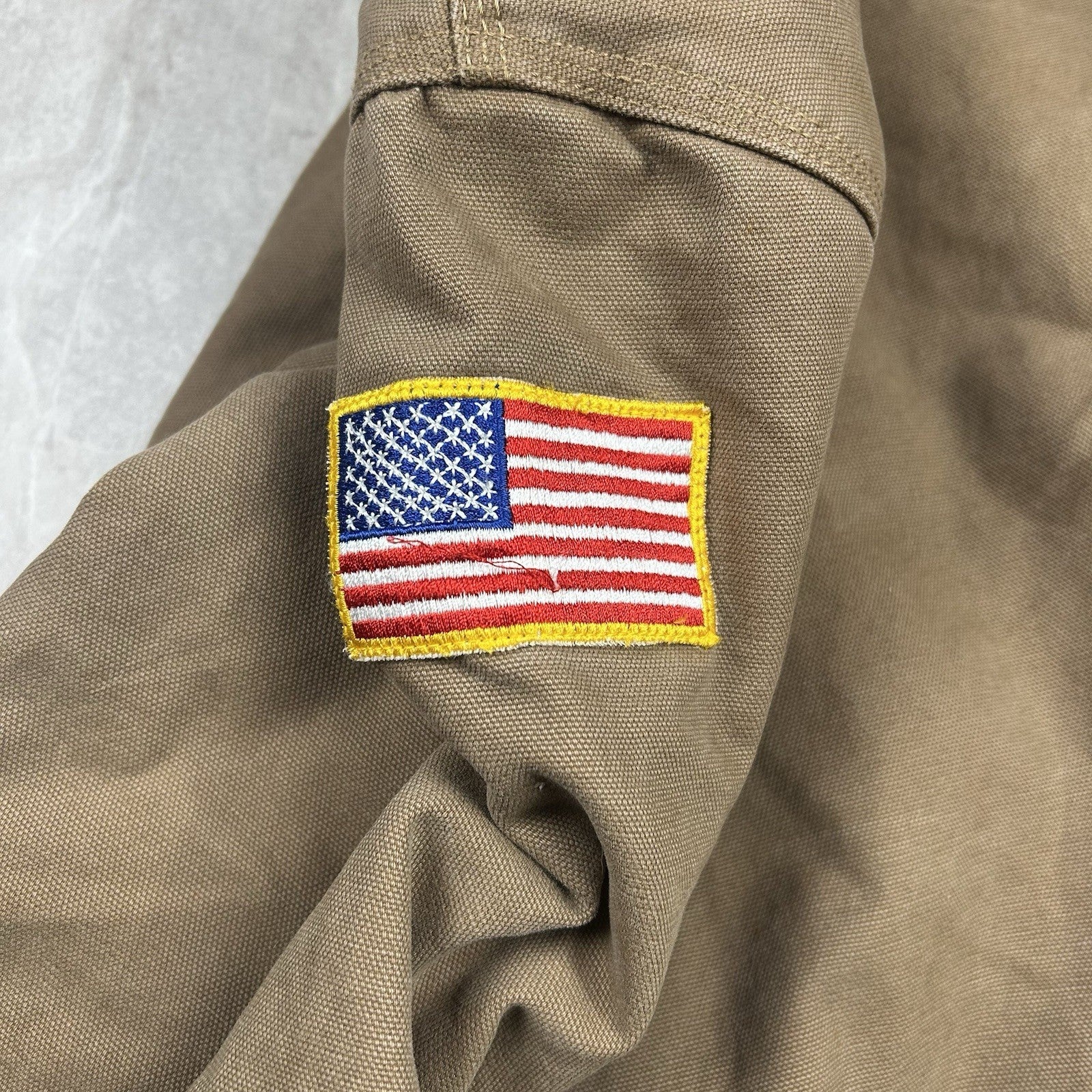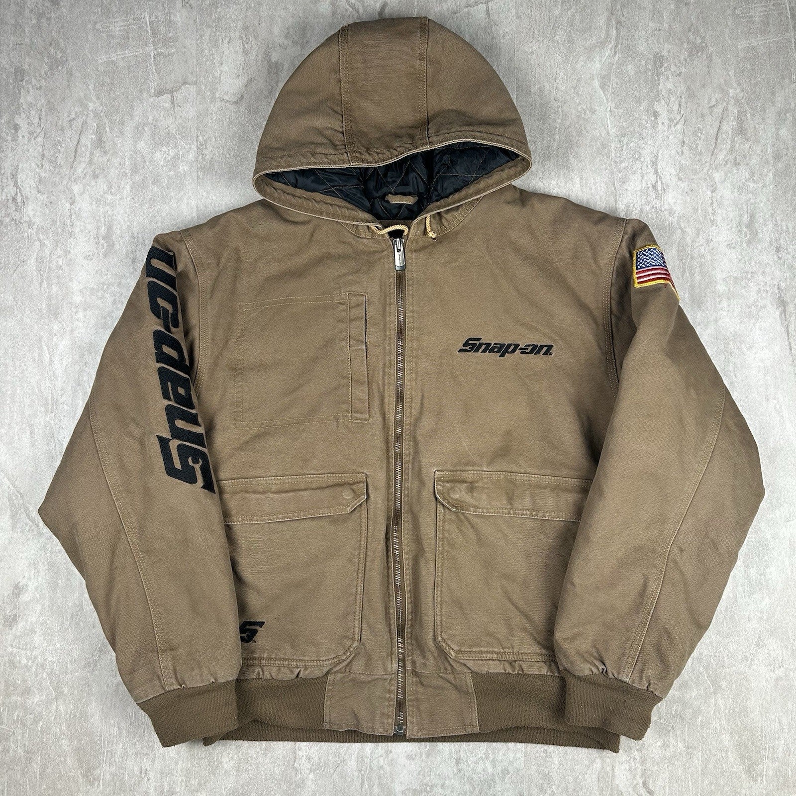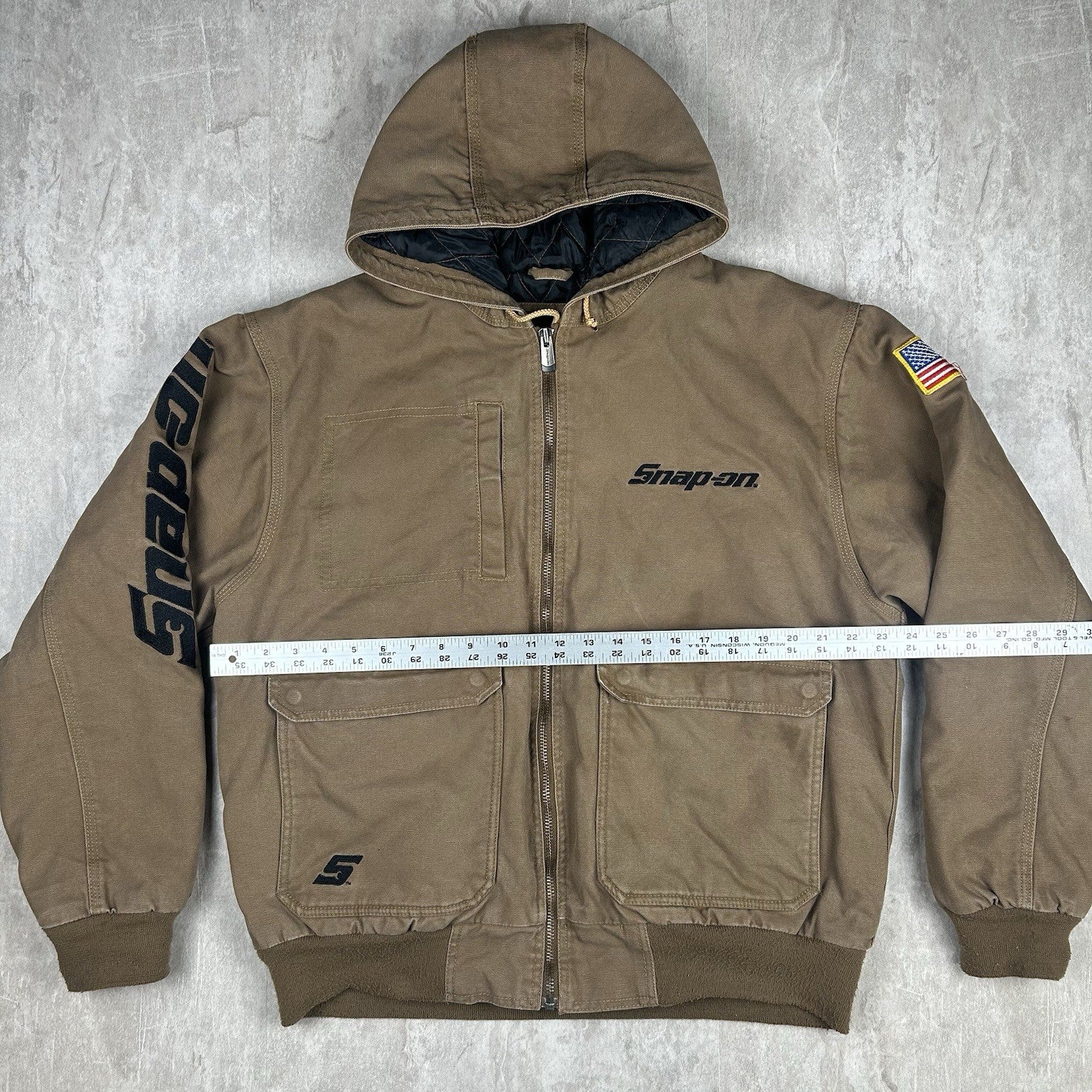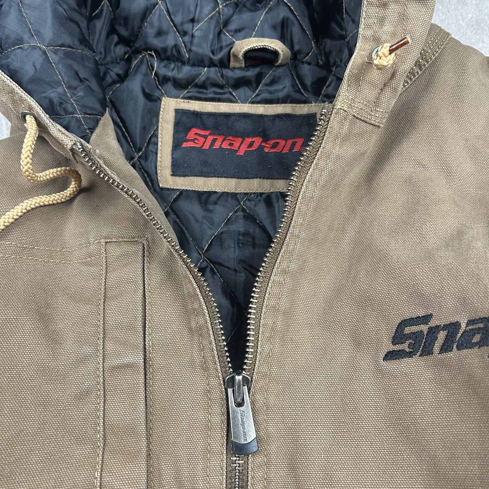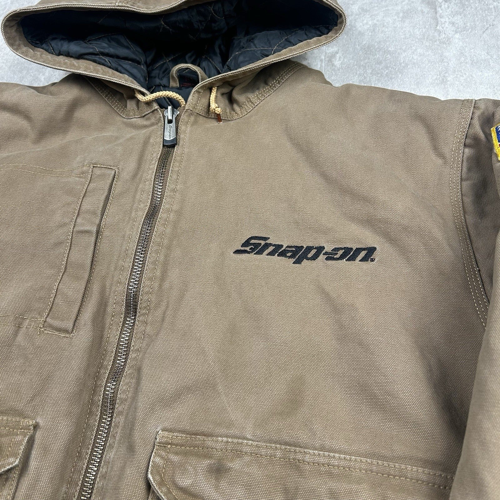 This Snap-On Tools full-zip hooded jacket features a durable tan canvas shell with quilted lining for added warmth. Designed for tough jobs and everyday wear, it includes a sturdy hood and practical utility style. Men's size L.