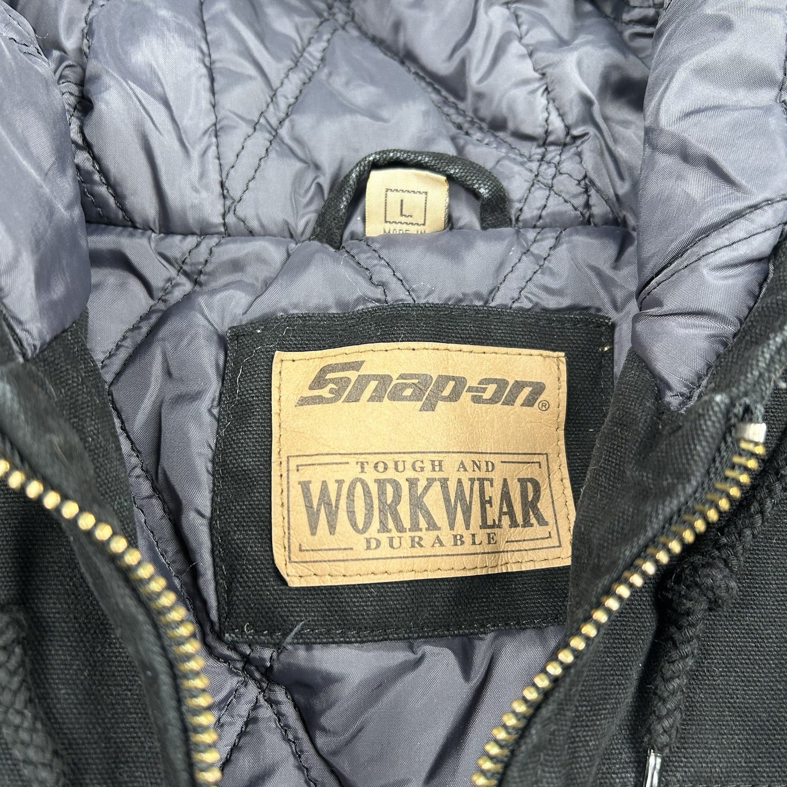 This Snap-On Tools hooded work jacket is built for durability and warmth. Made from quilted canvas with a full zip design, it's perfect for work or casual wear. Men's size L.