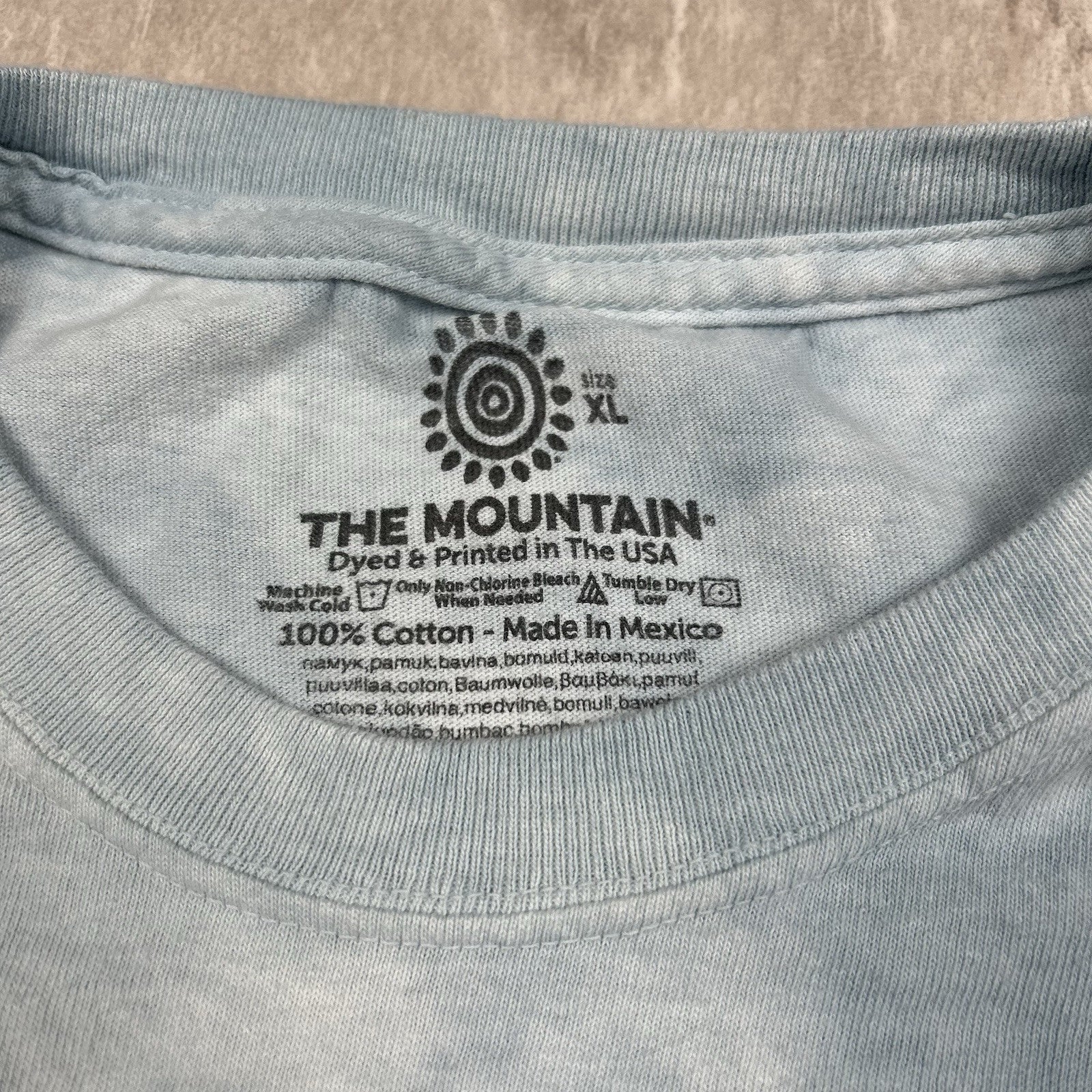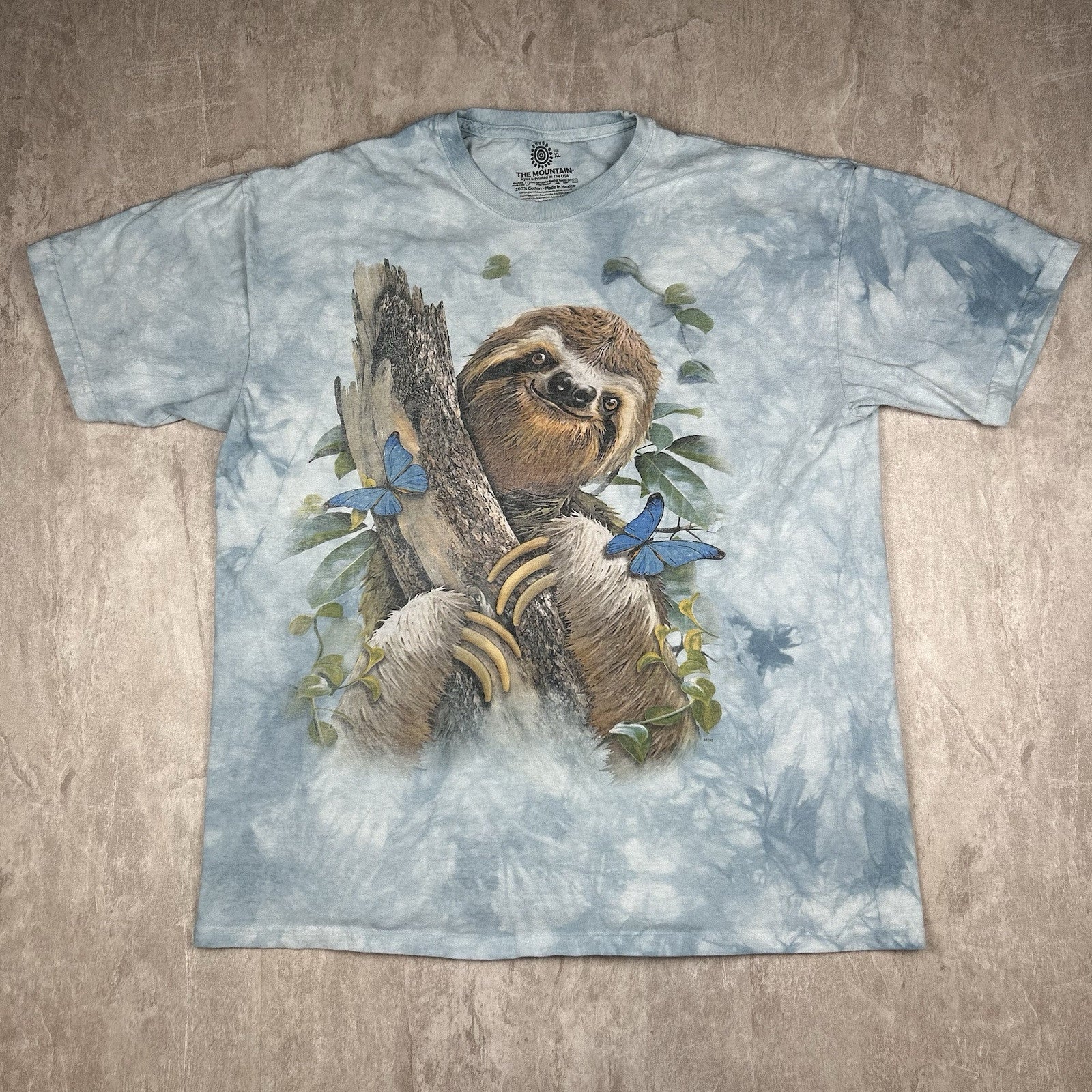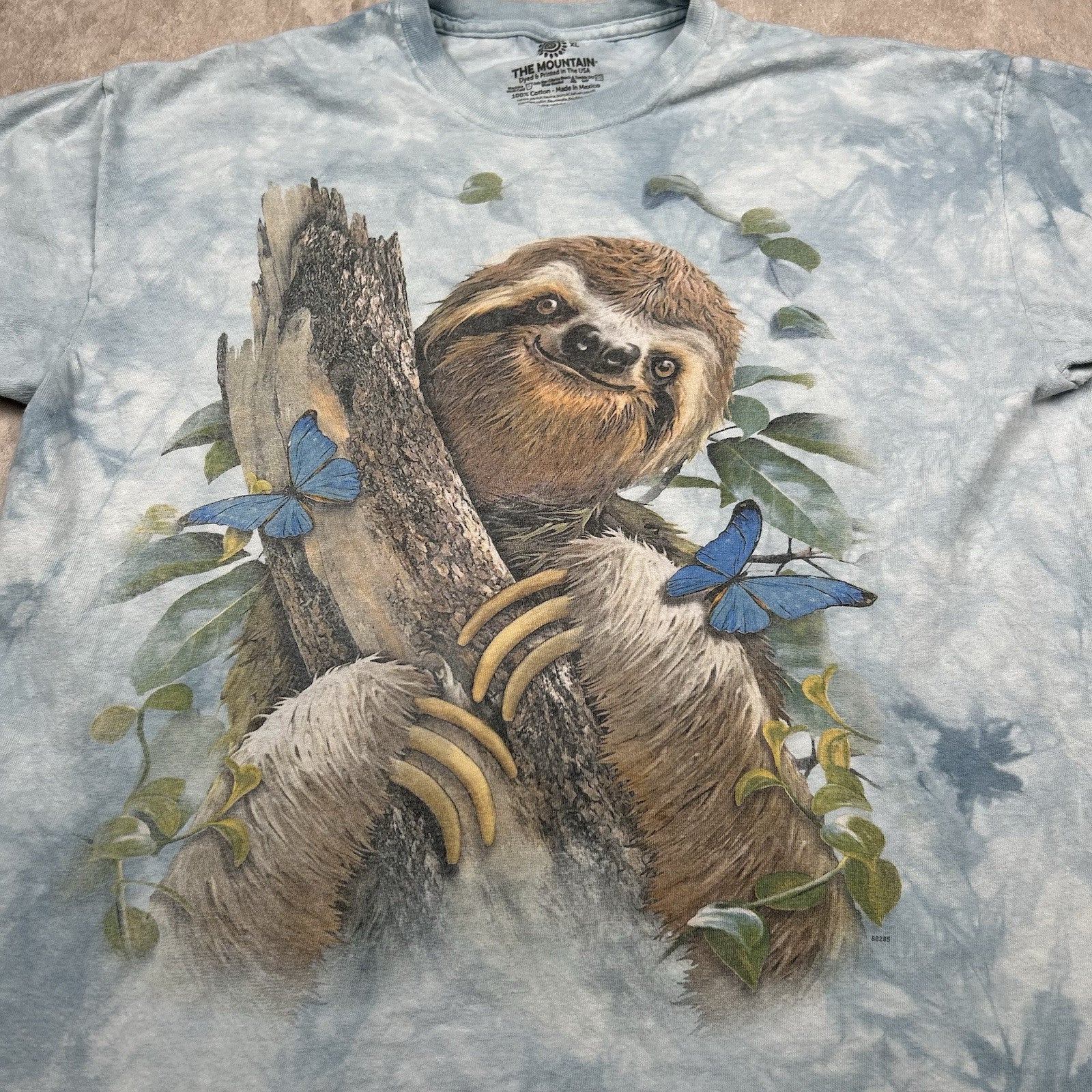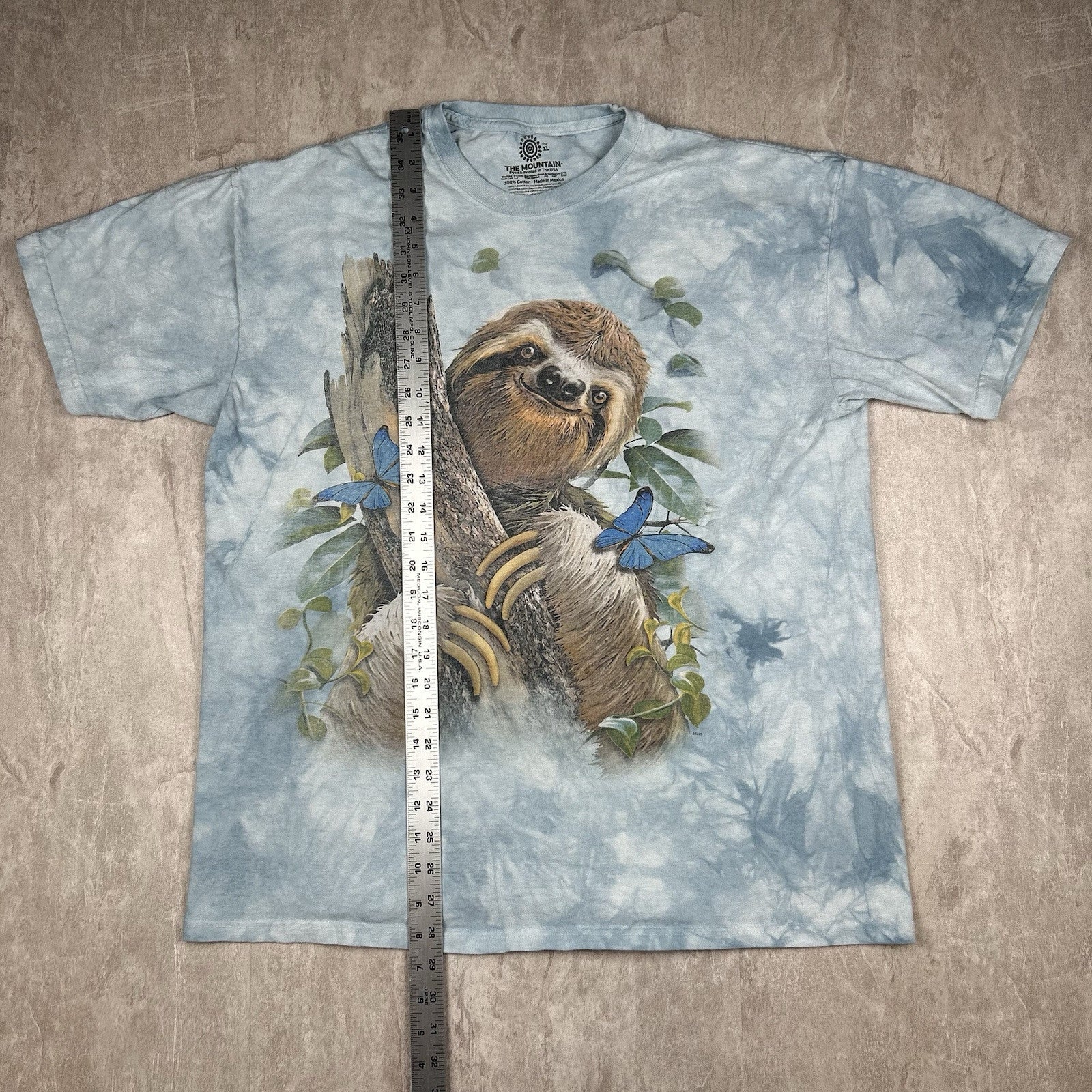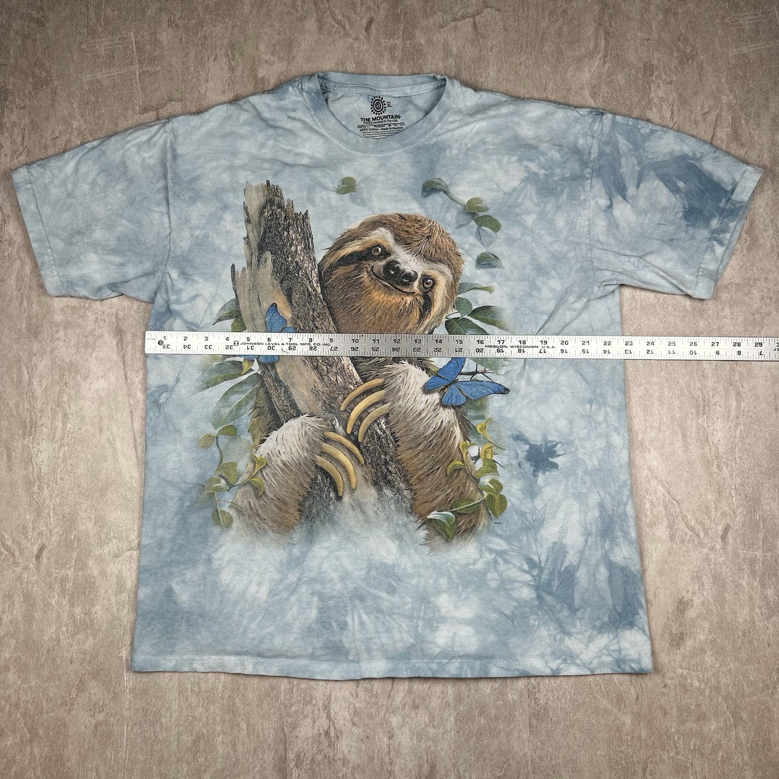This The Mountain T-shirt features a sloth and butterfly graphic on a blue tie-dye background. Made for nature lovers. Men's size XL.