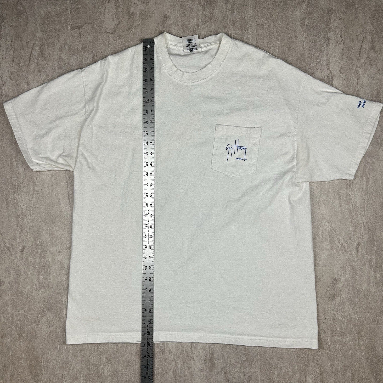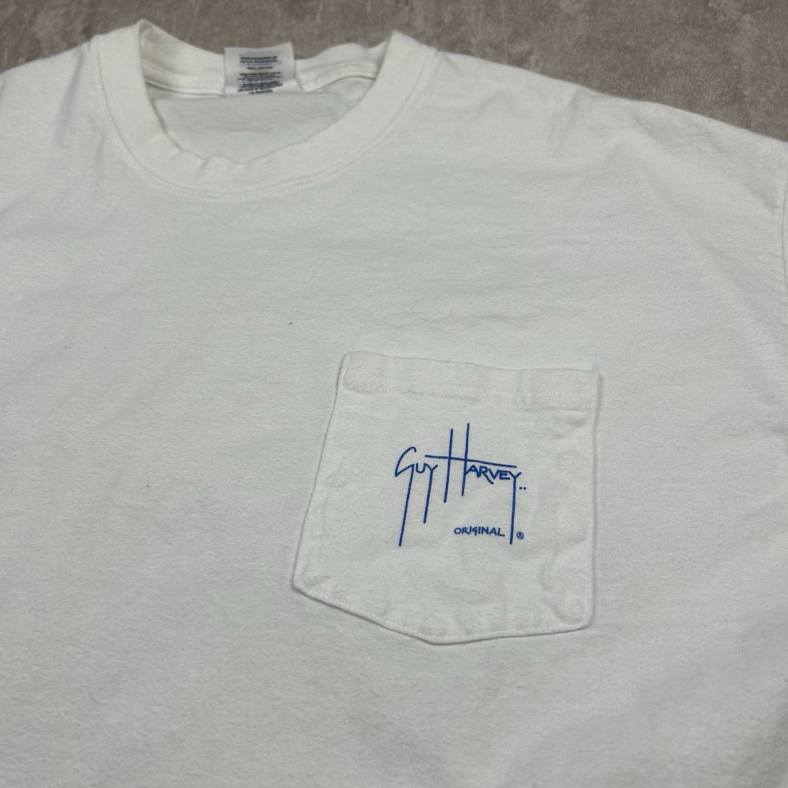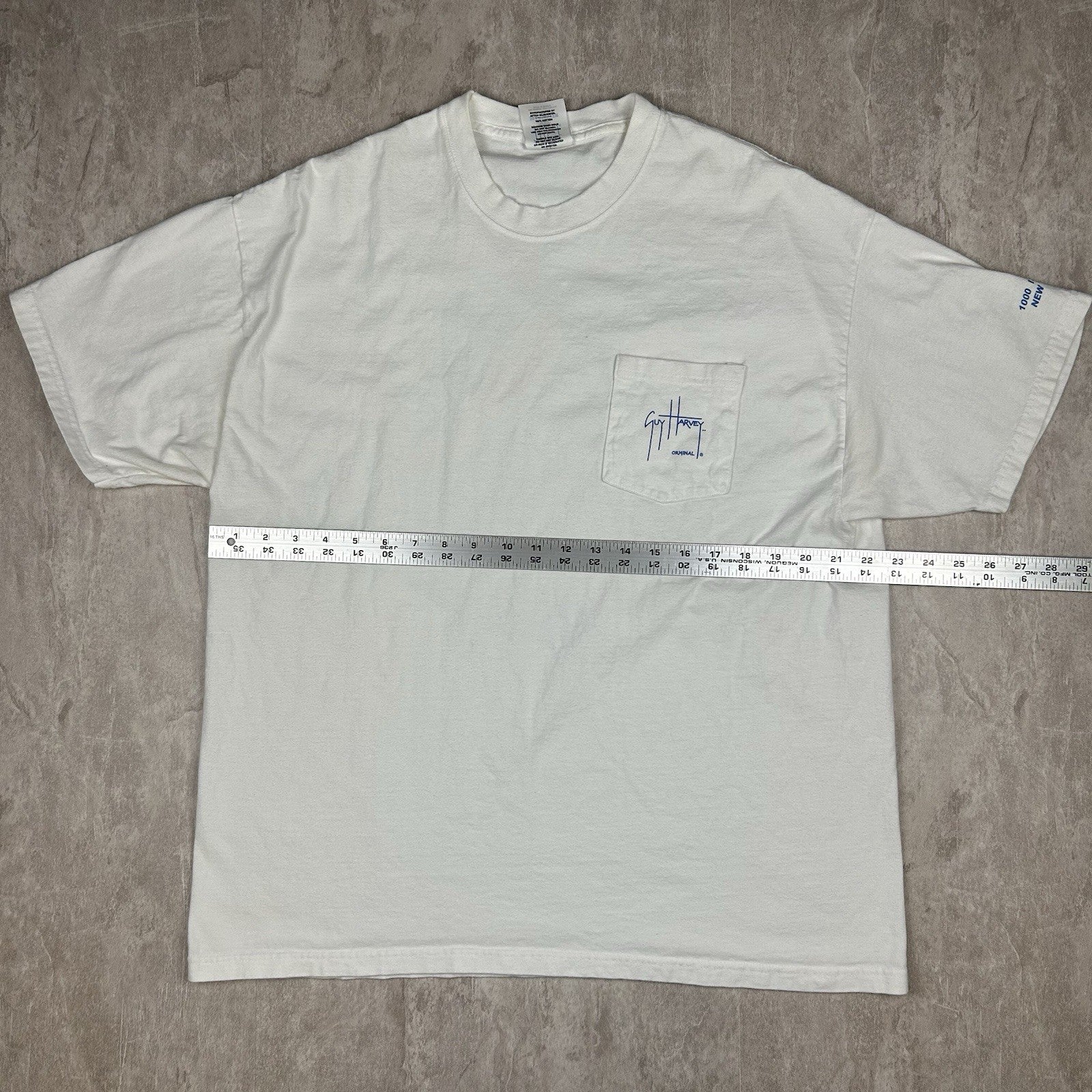 Classic Guy Harvey style from 2004, this double-sided white tee features bold bass fishing artwork on the back and signature branding on the front. A must-have for anglers and collectors alike. Men's size XL.