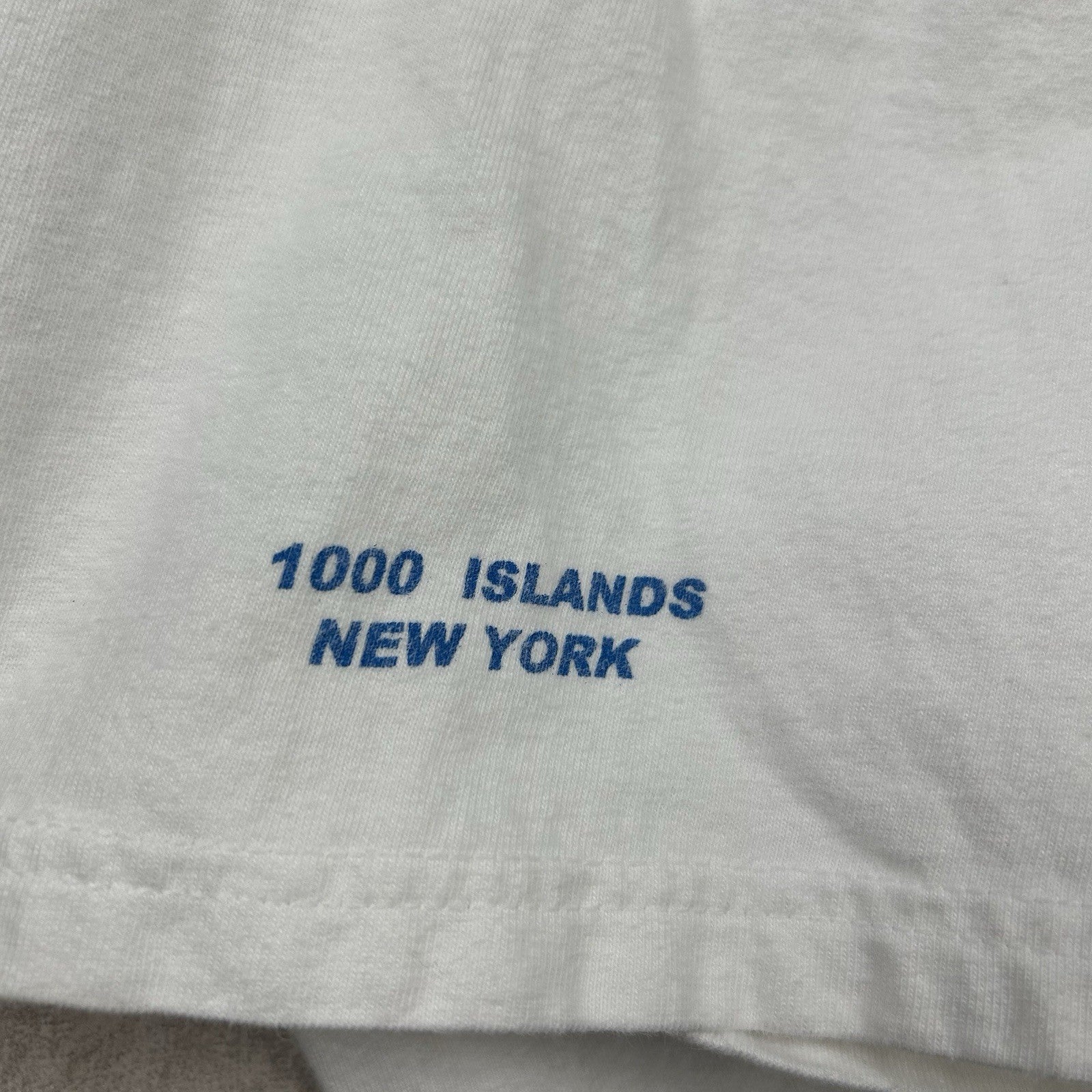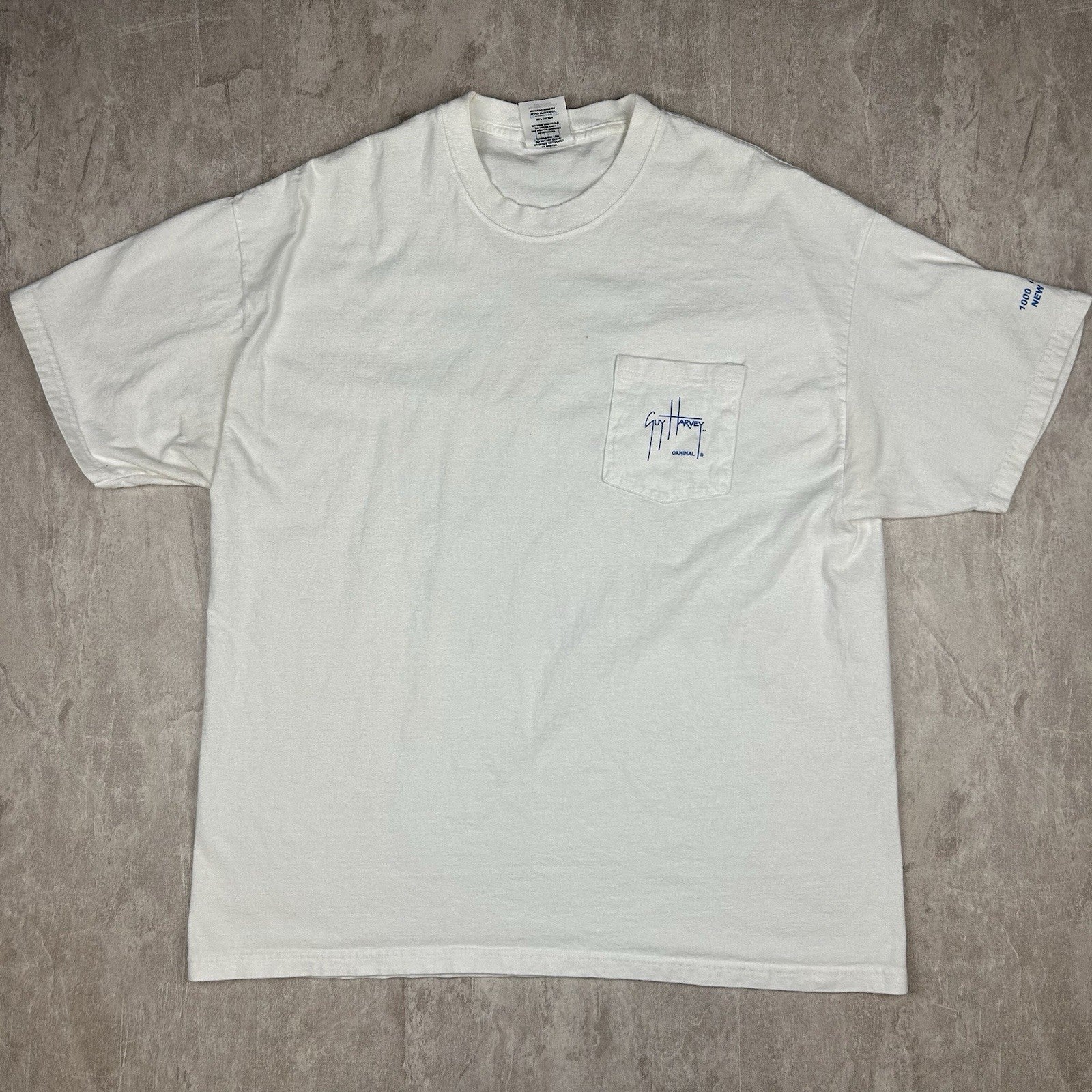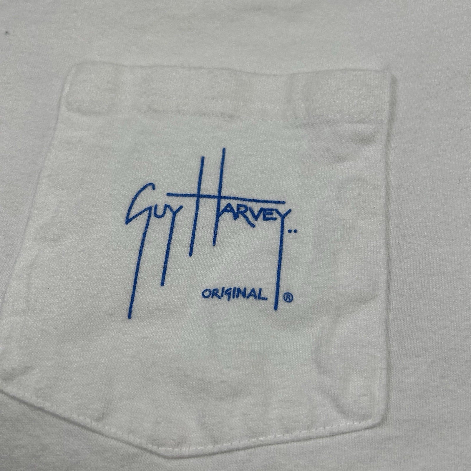 Classic Guy Harvey style from 2004, this double-sided white tee features bold bass fishing artwork on the back and signature branding on the front. A must-have for anglers and collectors alike. Men's size XL.