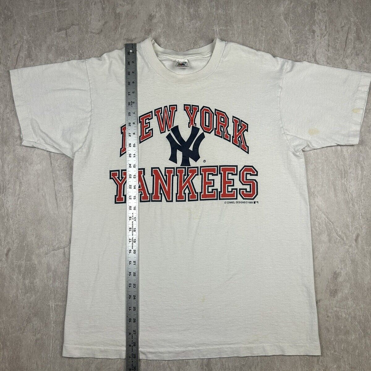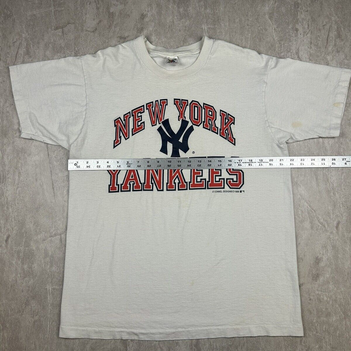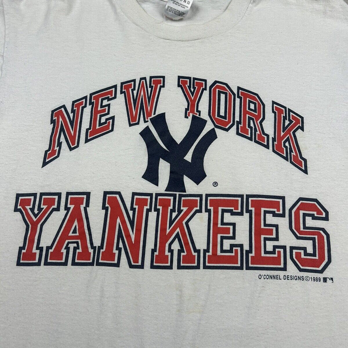 This Vintage 1989 New York Yankees MLB T-Shirt, in men's size XL, features a classic white design by O'Connell Designs. It's a timeless piece celebrating the Yankees' rich history, perfect for fans and collectors of vintage sportswear.