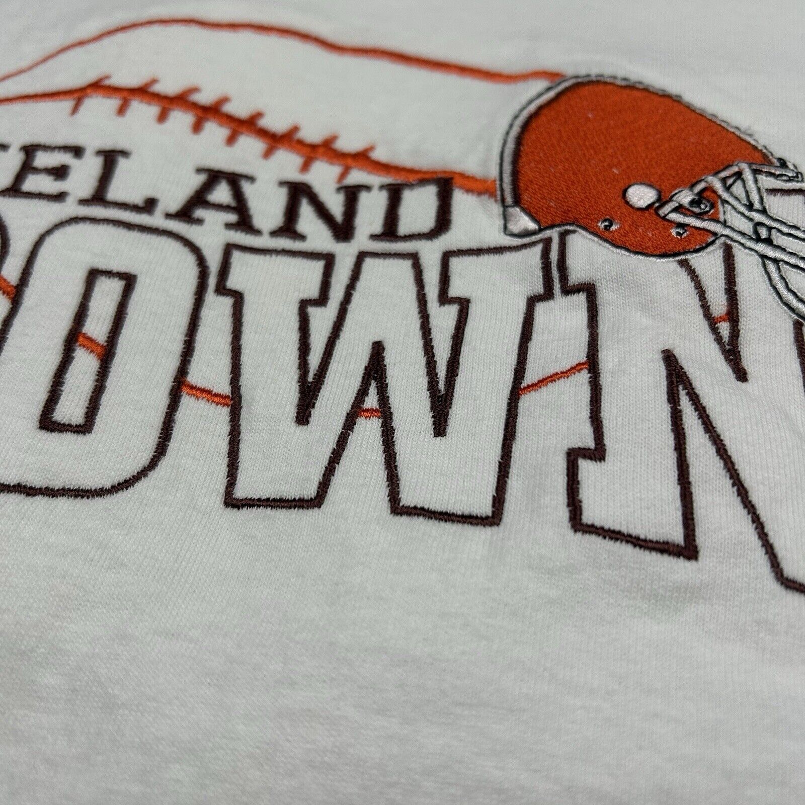 This Vintage 90s Cleveland Browns Cadre Athletic White Embroidered T-Shirt in size XL features bold embroidered details celebrating the iconic NFL team. A classic piece for Browns fans and vintage sportswear collectors, combining style and team pride.