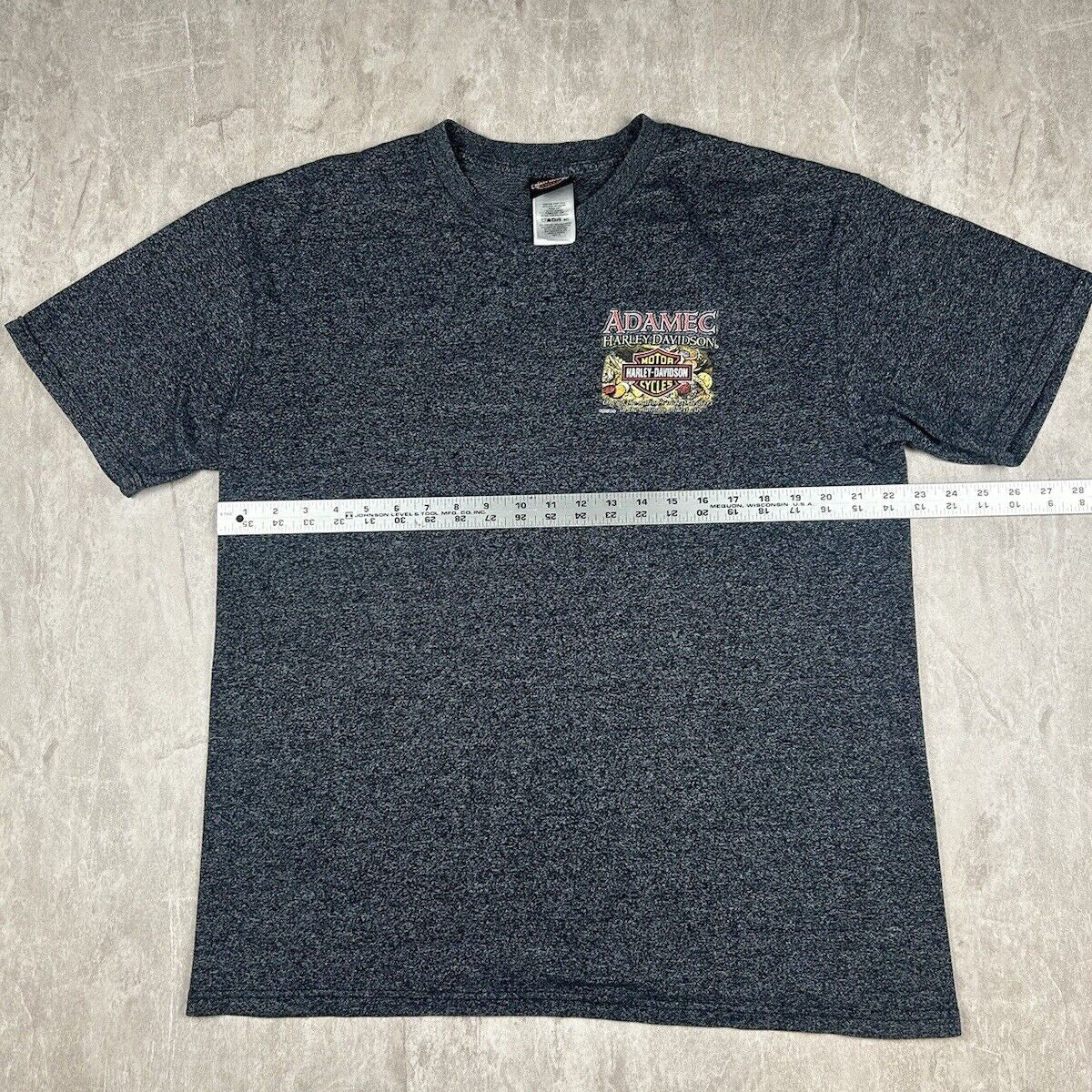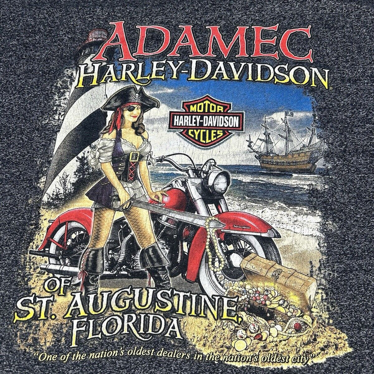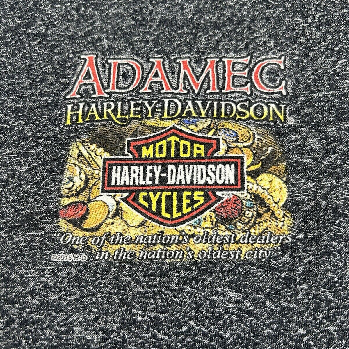 This 2015 Harley-Davidson T-Shirt, in men's size XL, features a bold graphic from Adamec Harley-Davidson in St. Augustine, Florida. The gray tee embodies the spirit of the open road, making it a perfect piece for bikers and Harley enthusiasts.