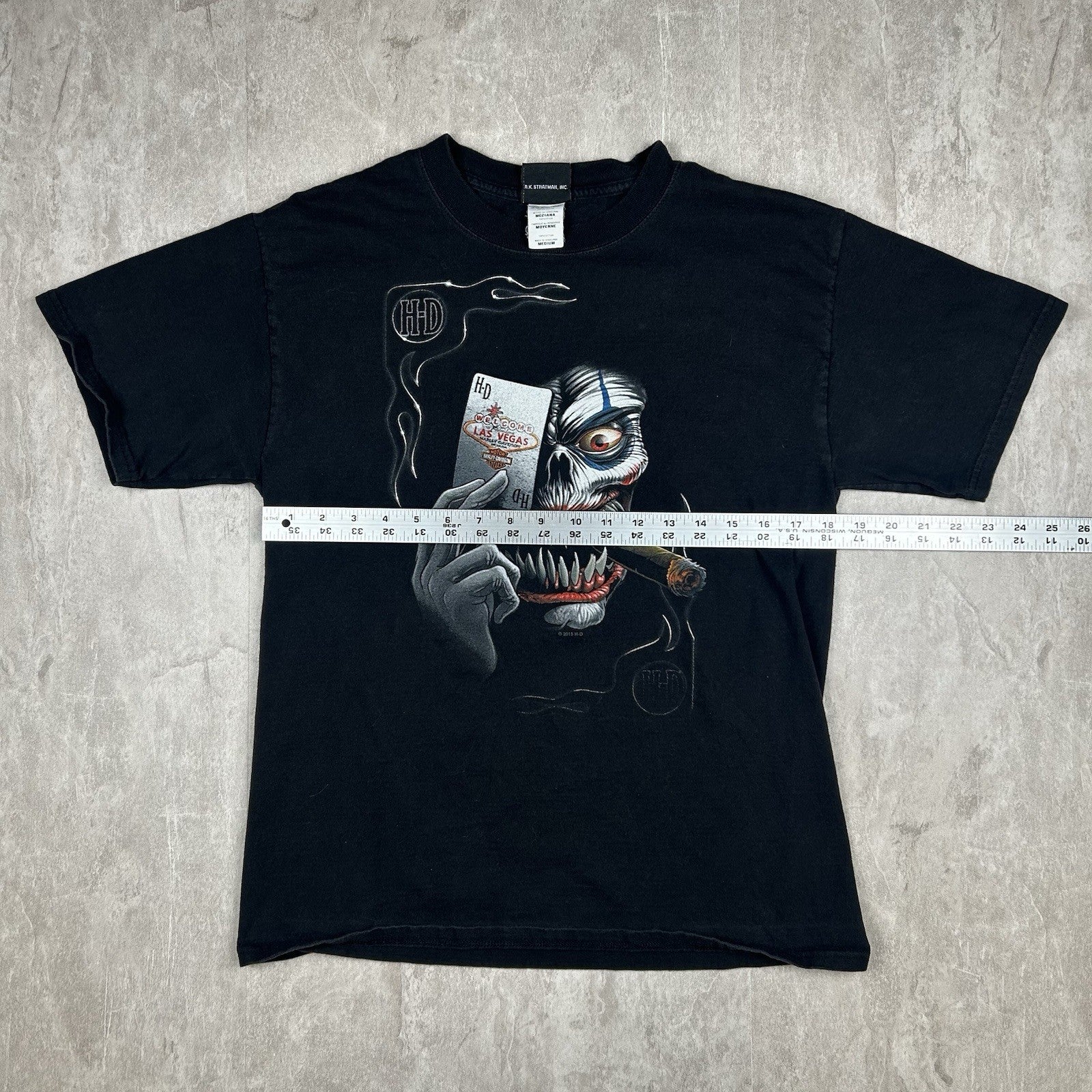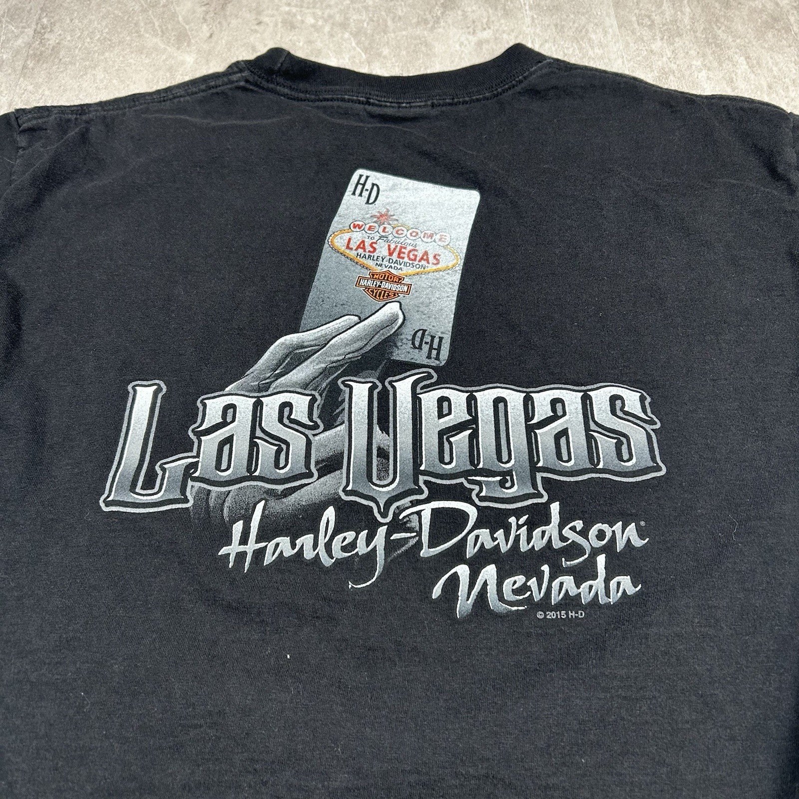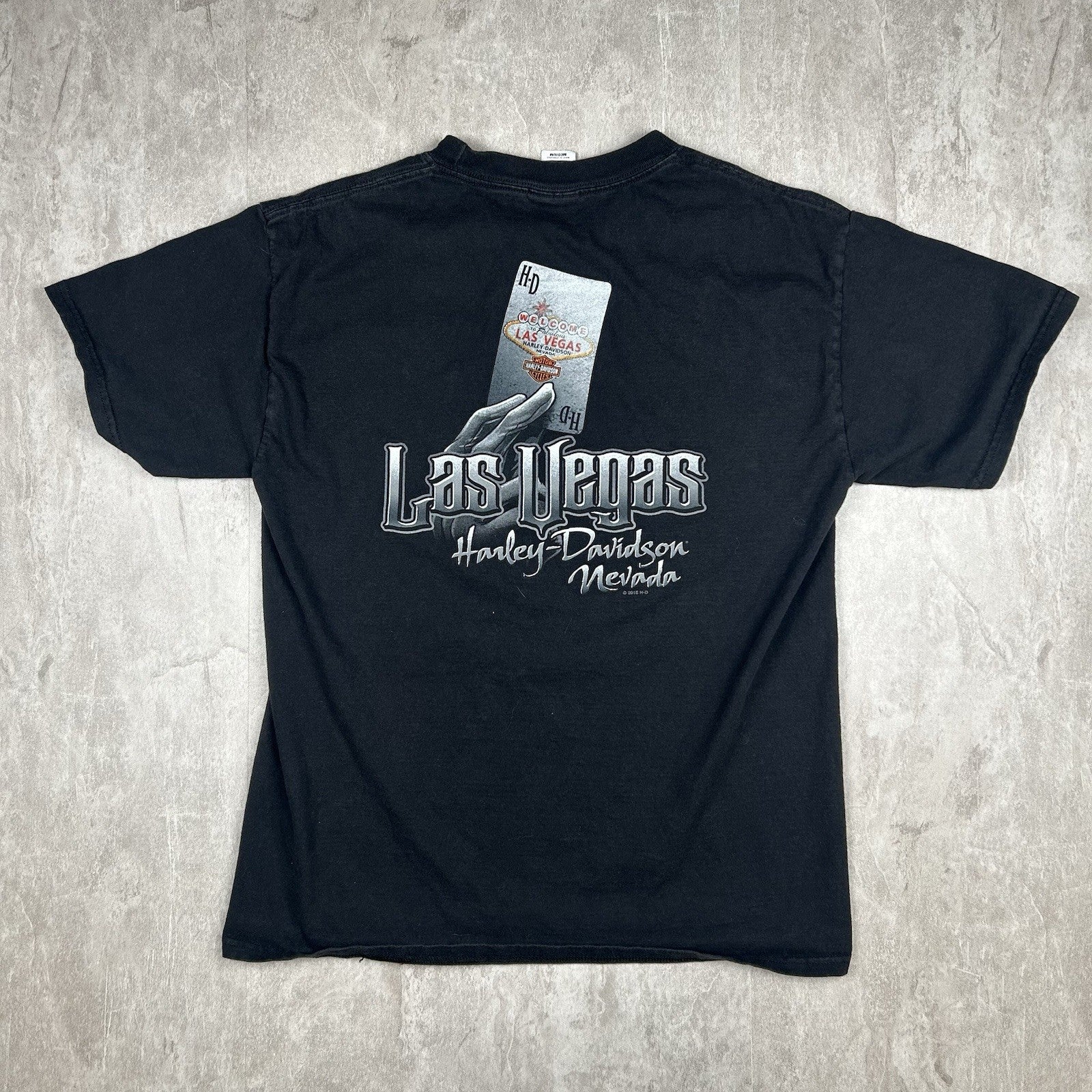 2015 Las Vegas Harley-Davidson graphic tee featuring flaming cards, poker chips, and the Grim Reaper. Sin City meets biker bold. Men's size M.