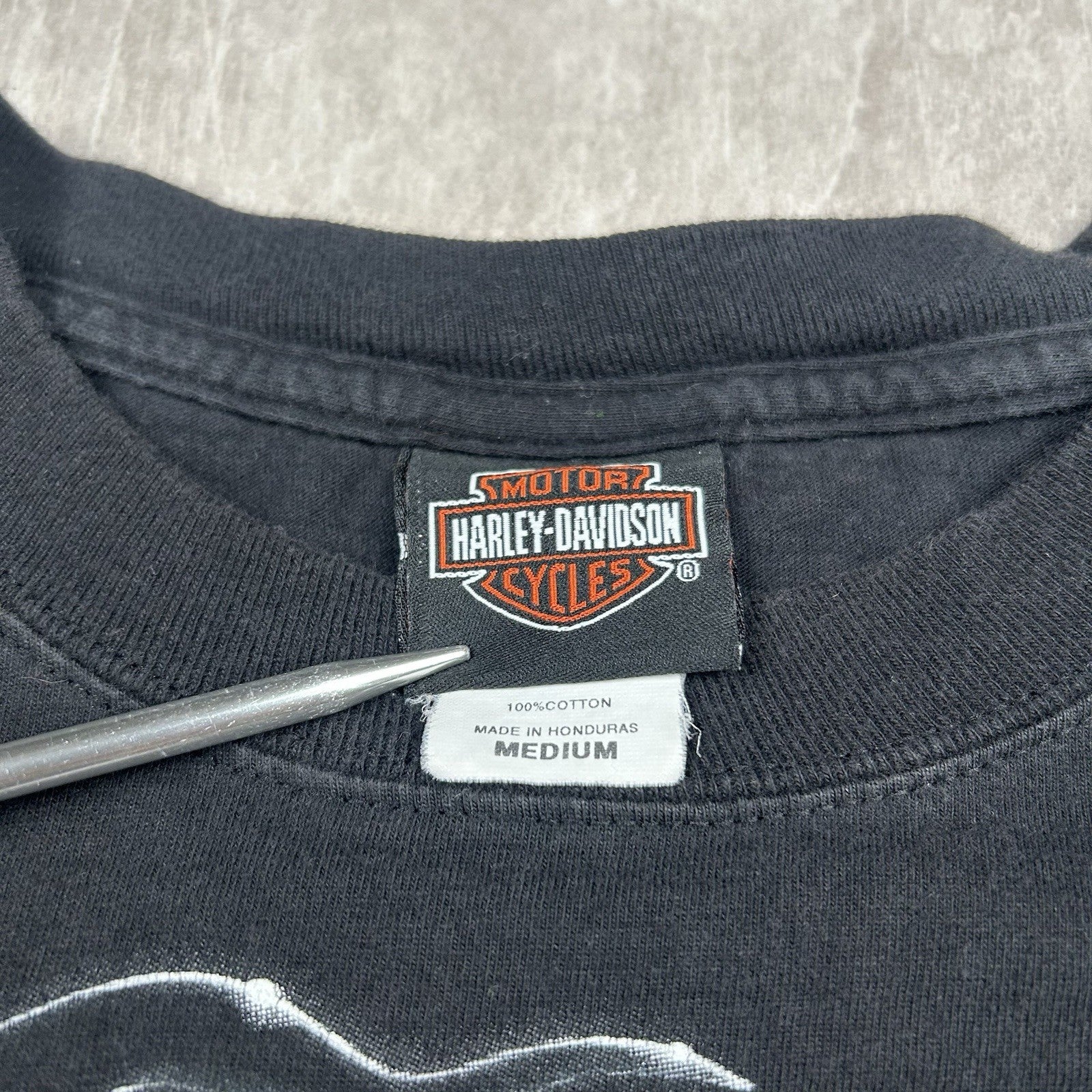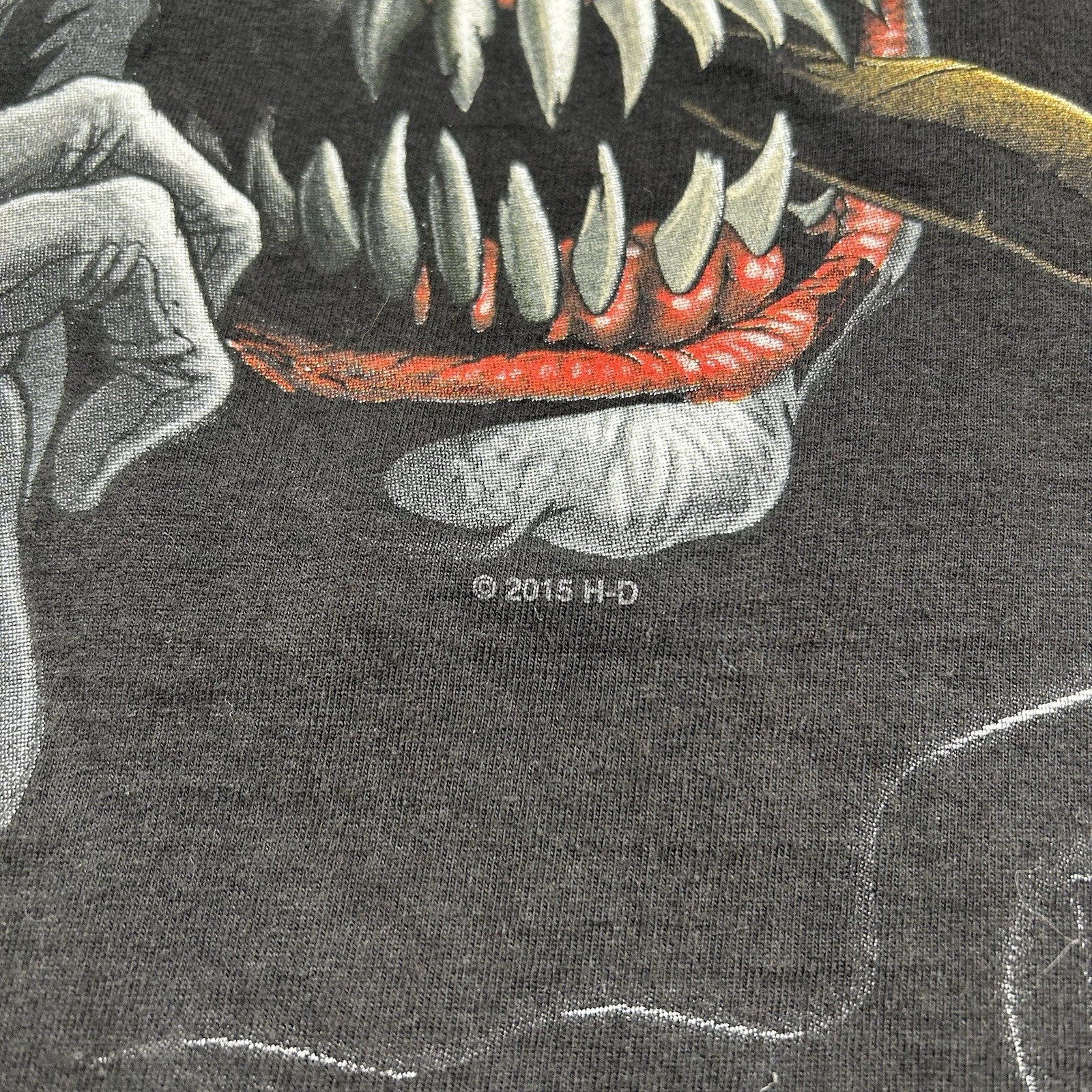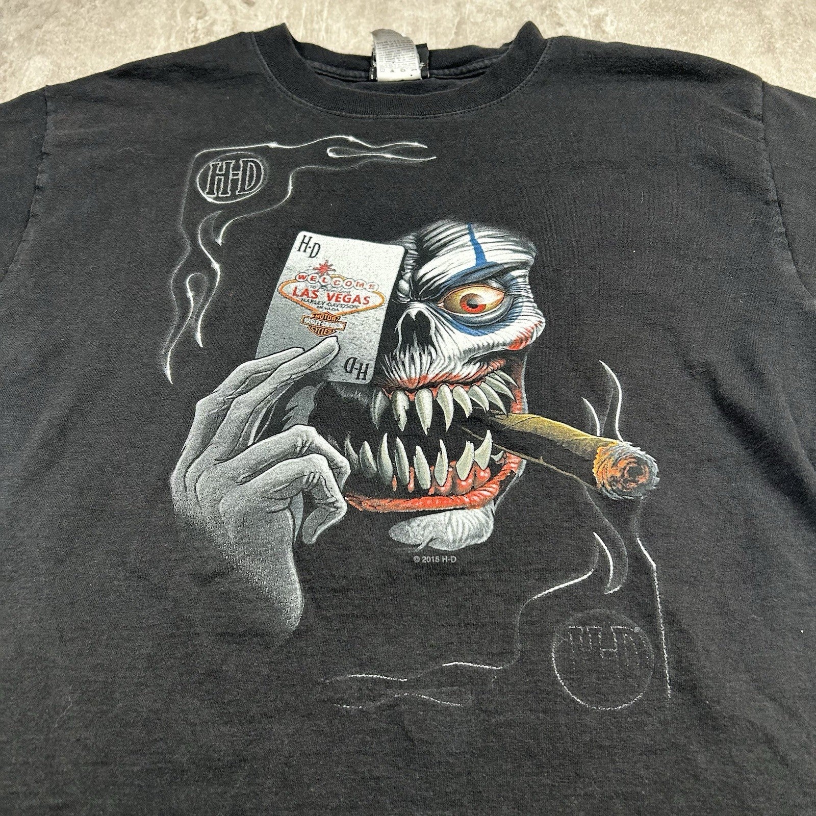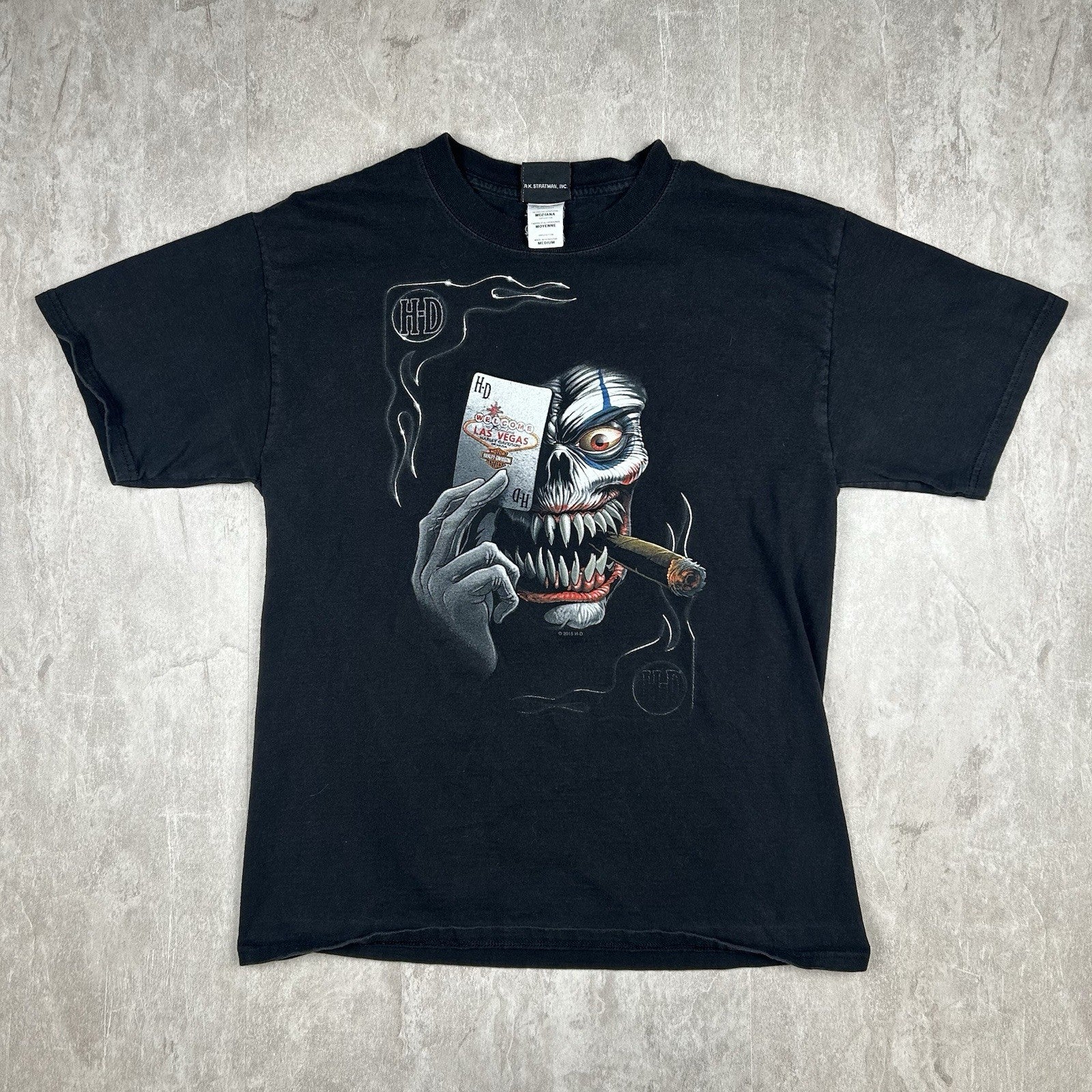 2015 Las Vegas Harley-Davidson graphic tee featuring flaming cards, poker chips, and the Grim Reaper. Sin City meets biker bold. Men's size M.
