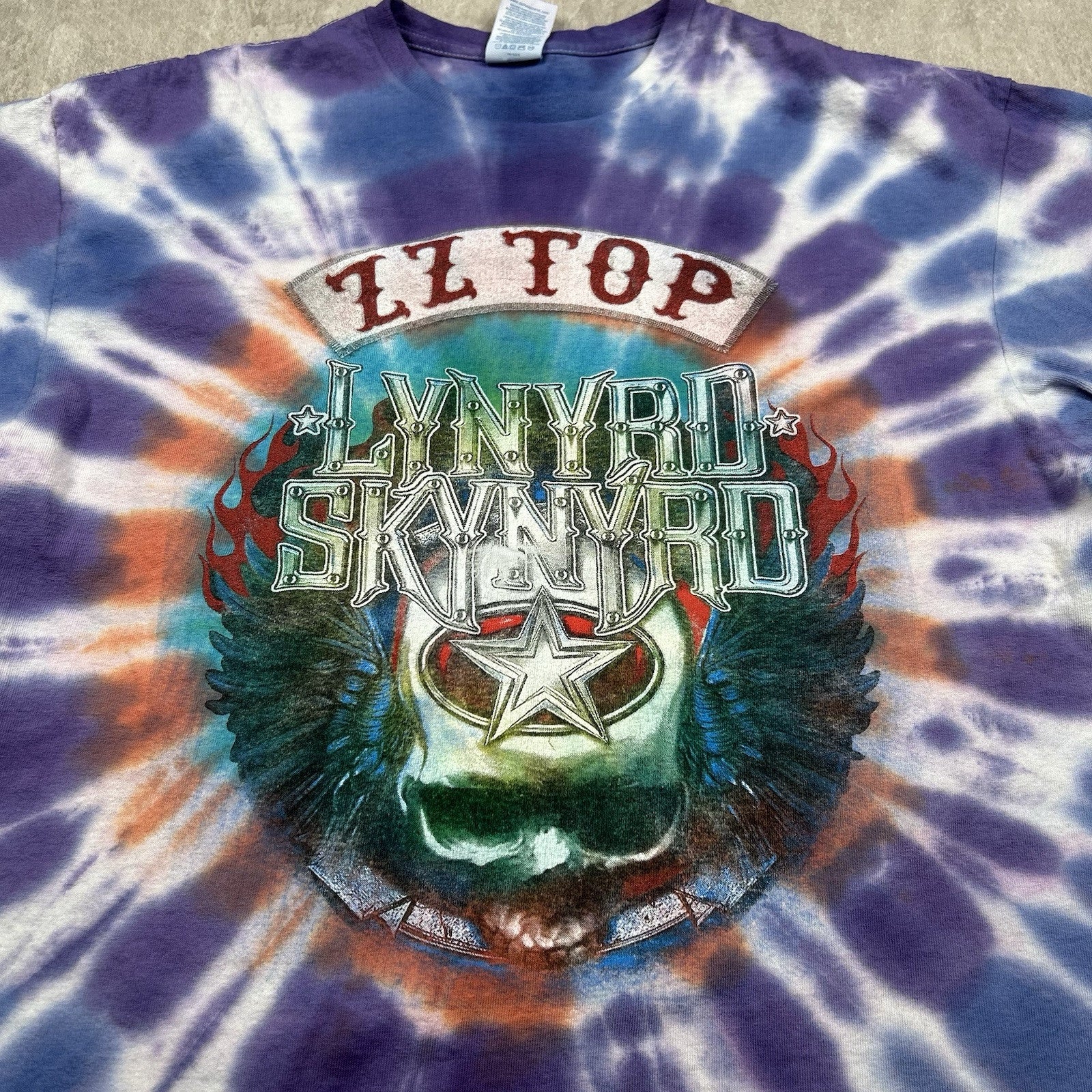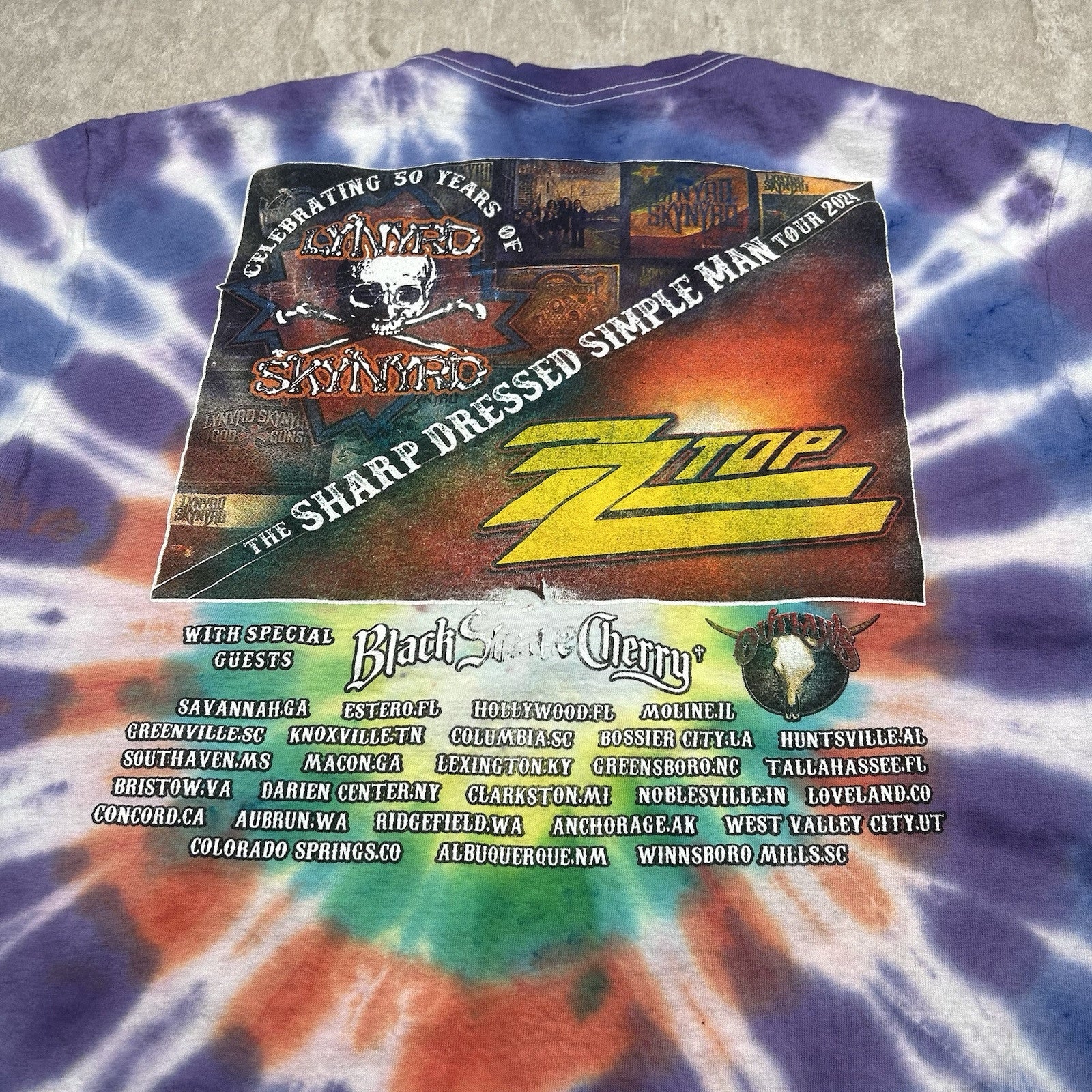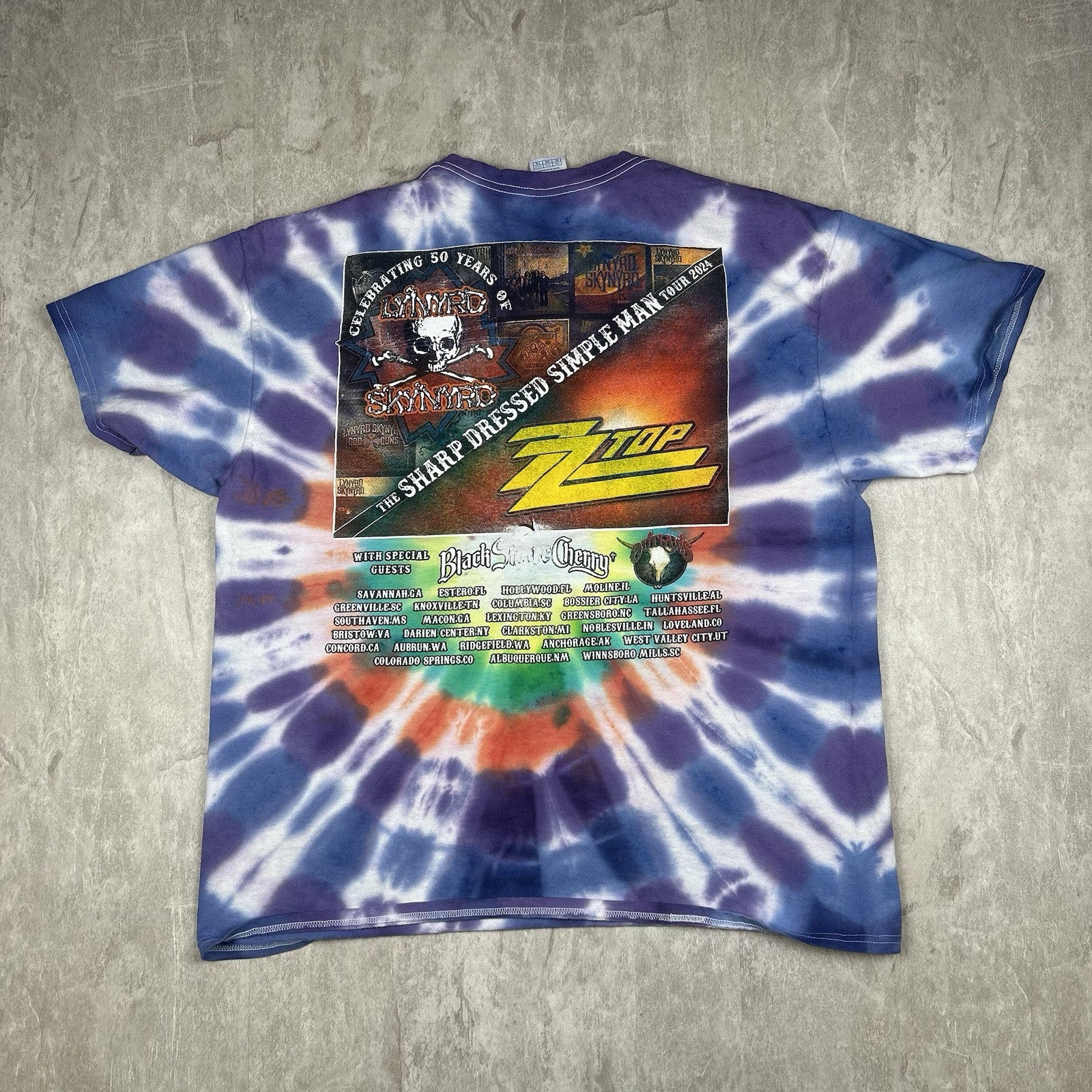 This 2024 Lynyrd Skynyrd and ZZ Top tour T-shirt features a bold tie-dye design with double-sided graphics. A must-have for classic rock fans. Men's size XL.