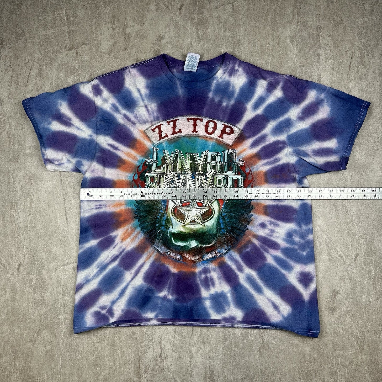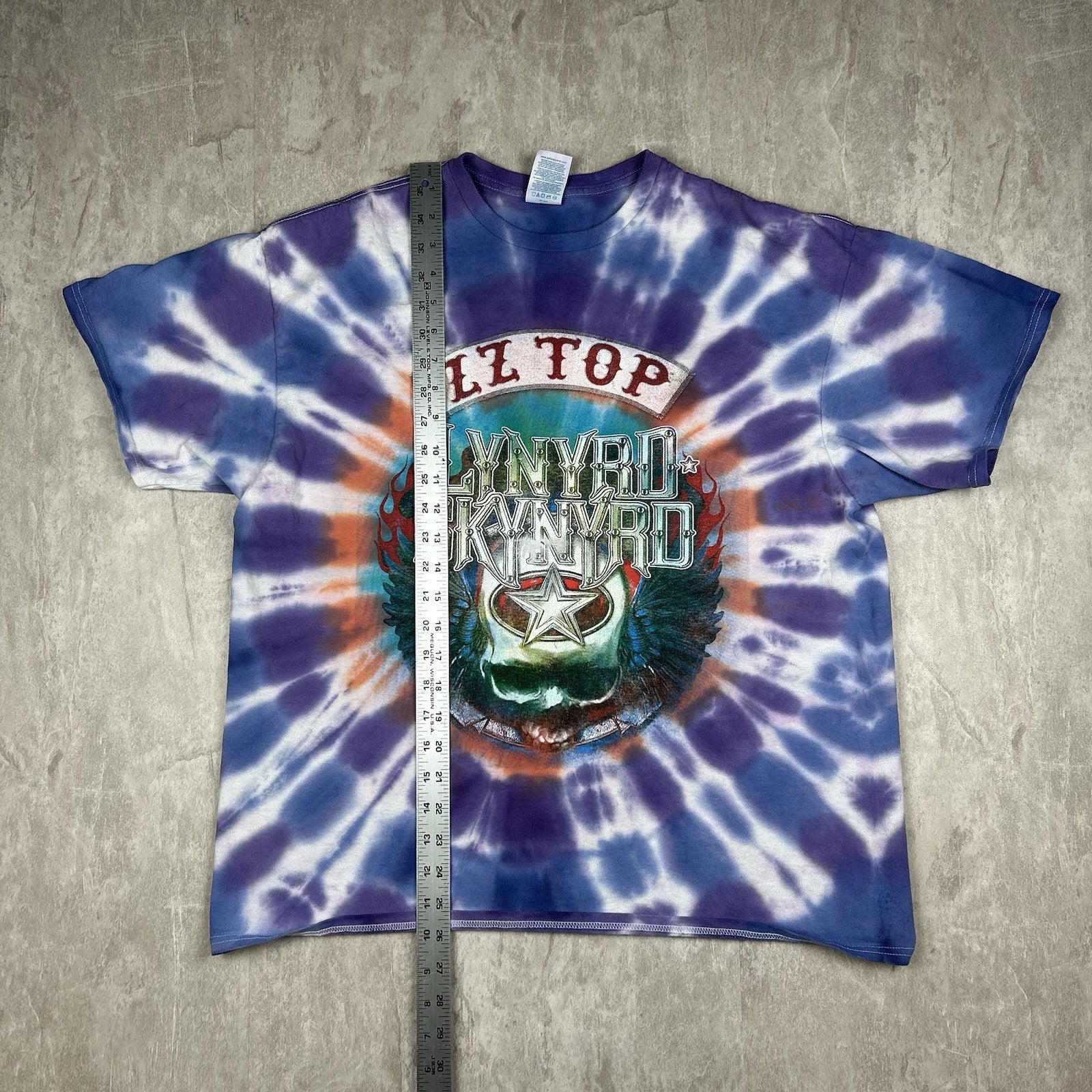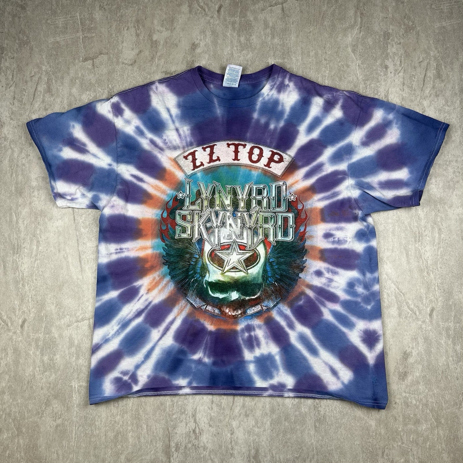 This 2024 Lynyrd Skynyrd and ZZ Top tour T-shirt features a bold tie-dye design with double-sided graphics. A must-have for classic rock fans. Men's size XL.