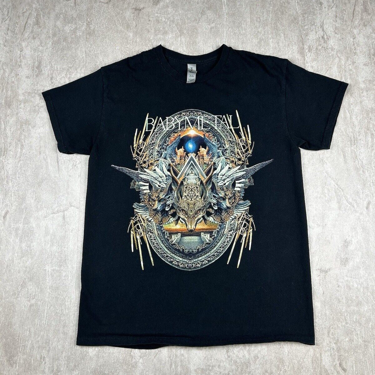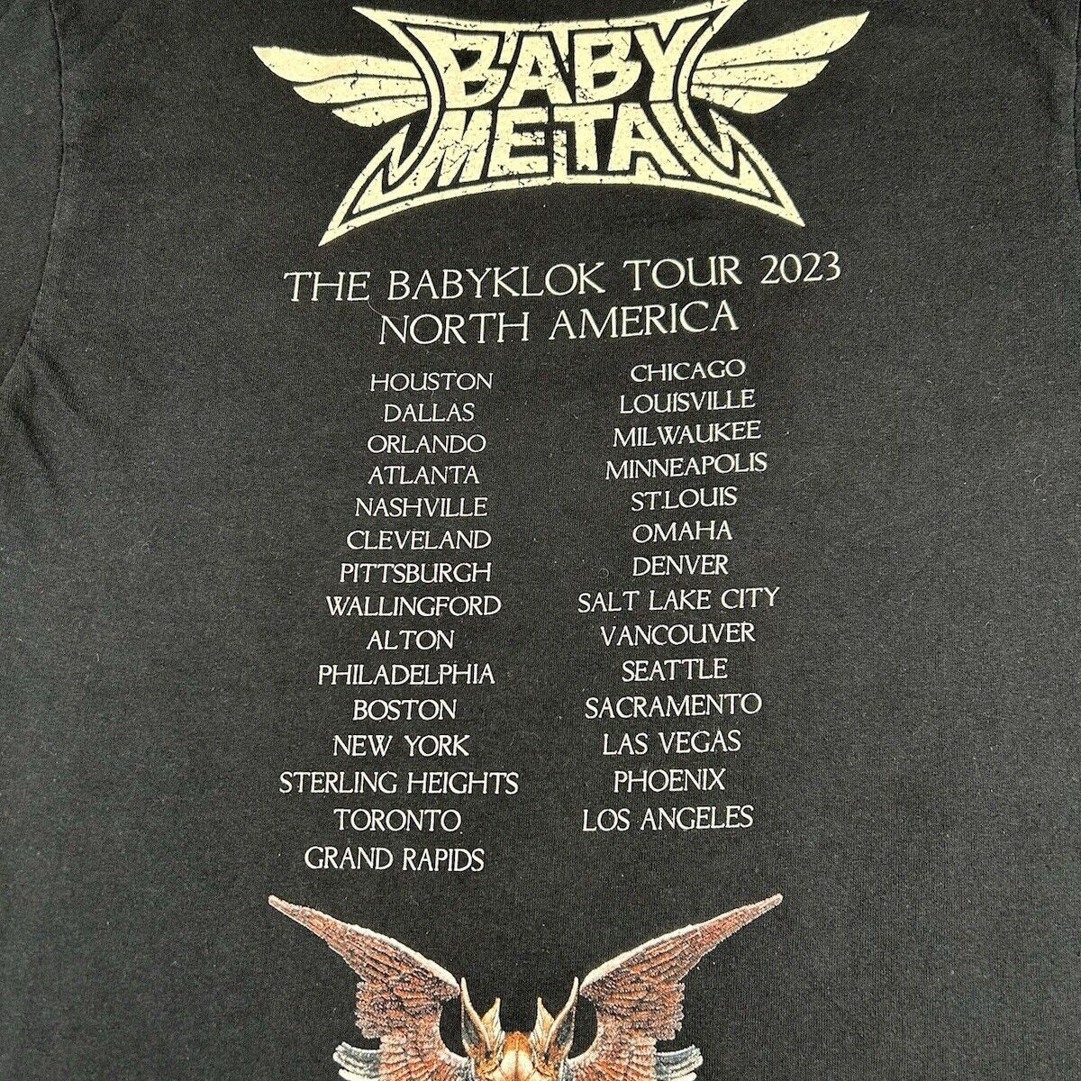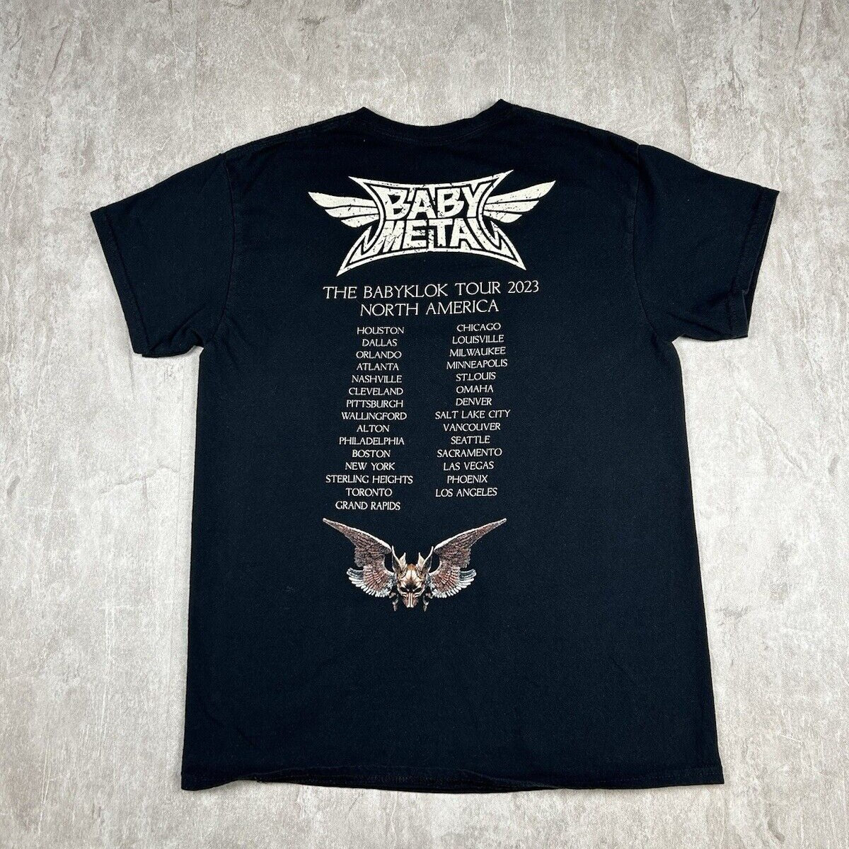 This Babymetal 2023 Tour Black T-Shirt, in men's size M, features a striking double-sided design celebrating the Babyklok America tour. Perfect for fans, it offers a bold way to showcase your love for the iconic metal band.