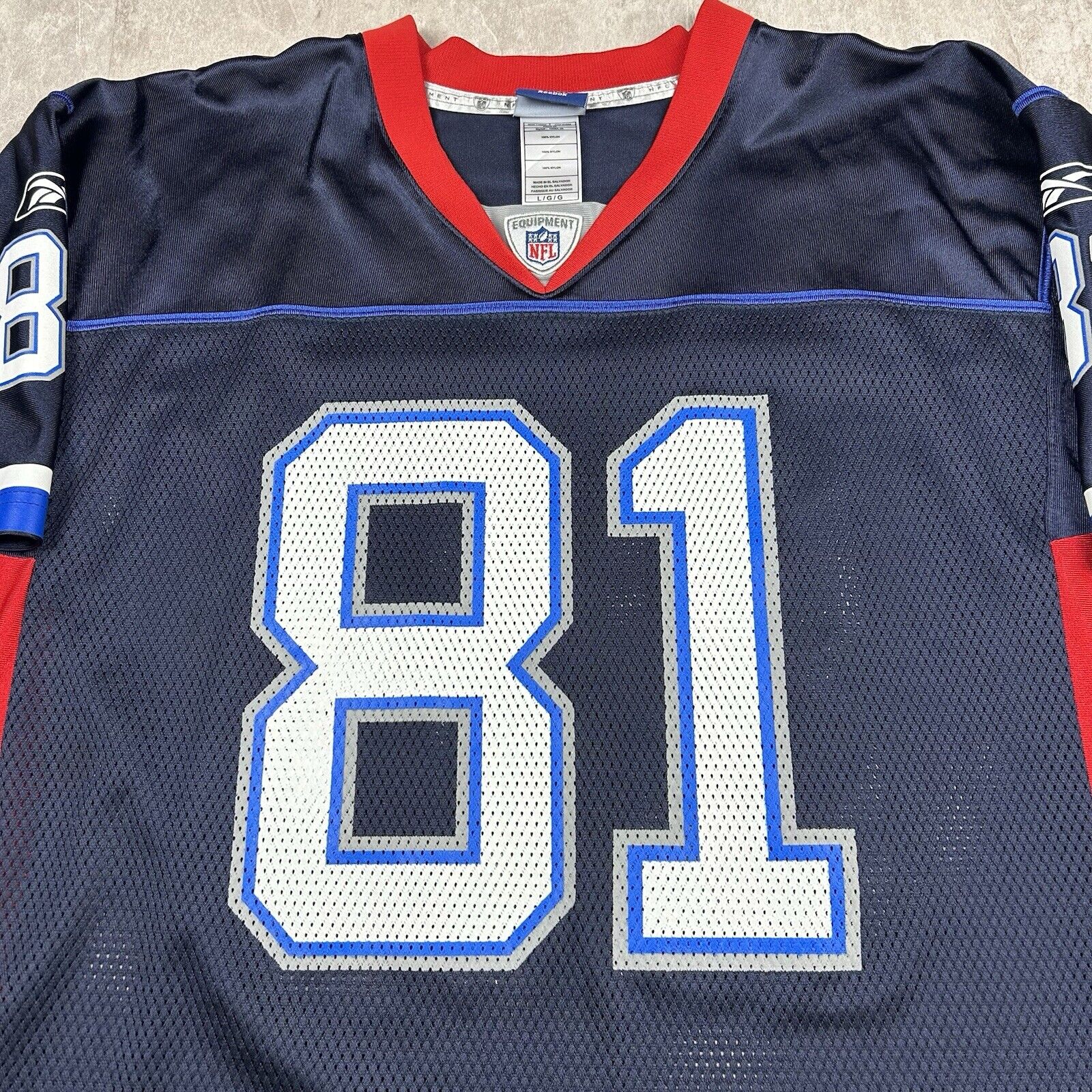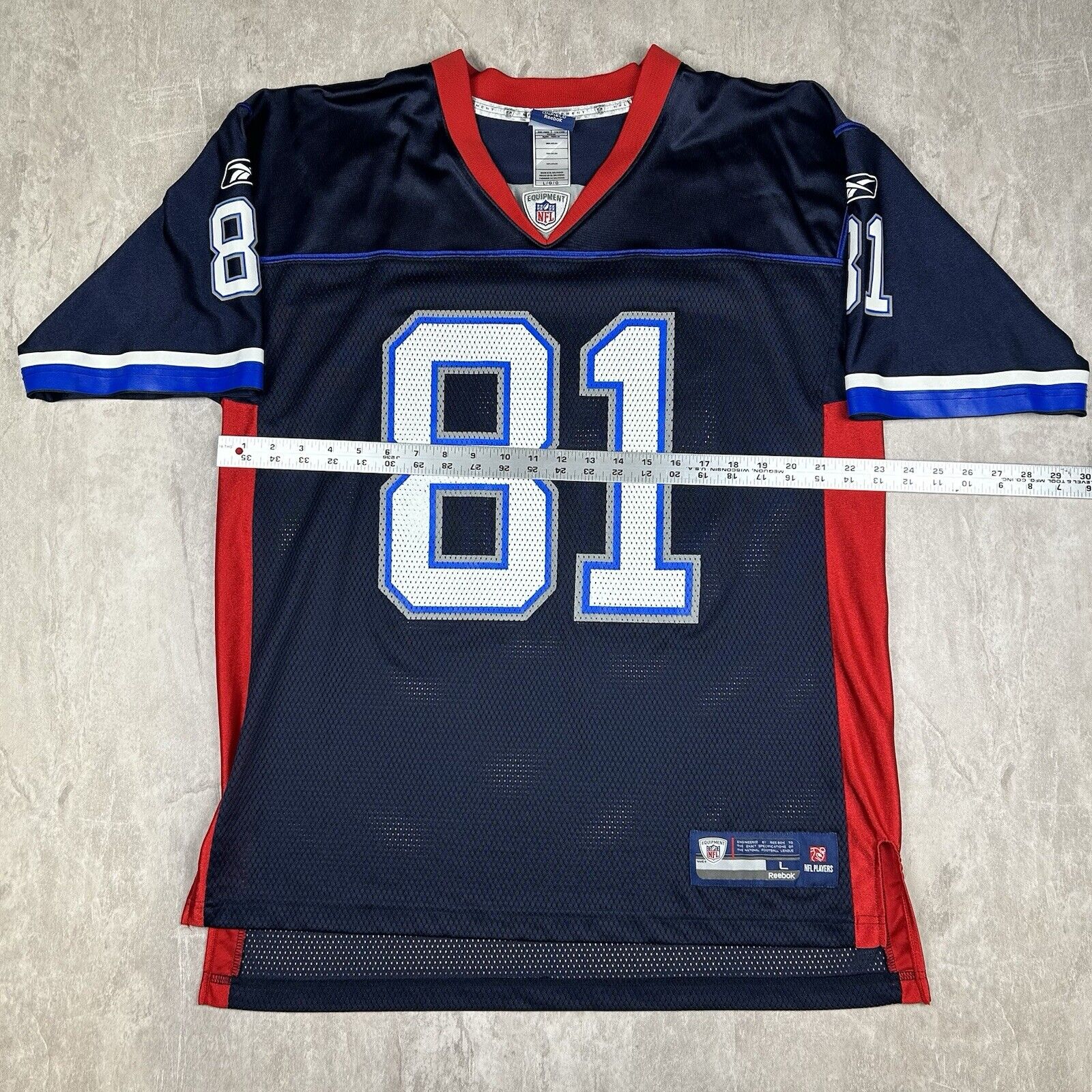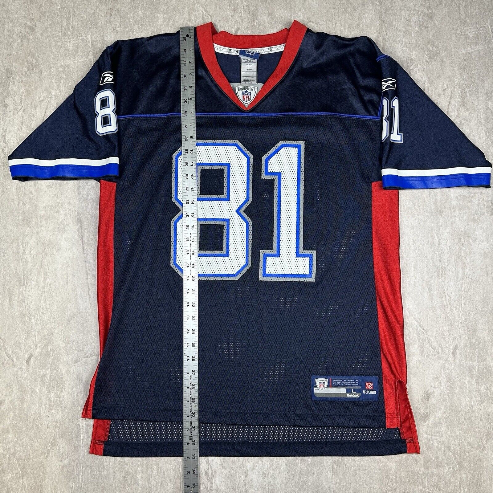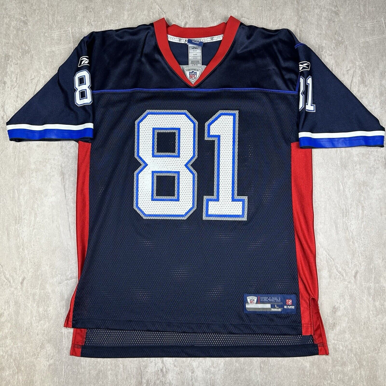 This Buffalo Bills Terrell Owens Jersey by Reebok On Field in size L features the iconic blue design with #81 on the front and back. Perfect for fans of T.O. and the Bills, this jersey combines style and NFL authenticity.