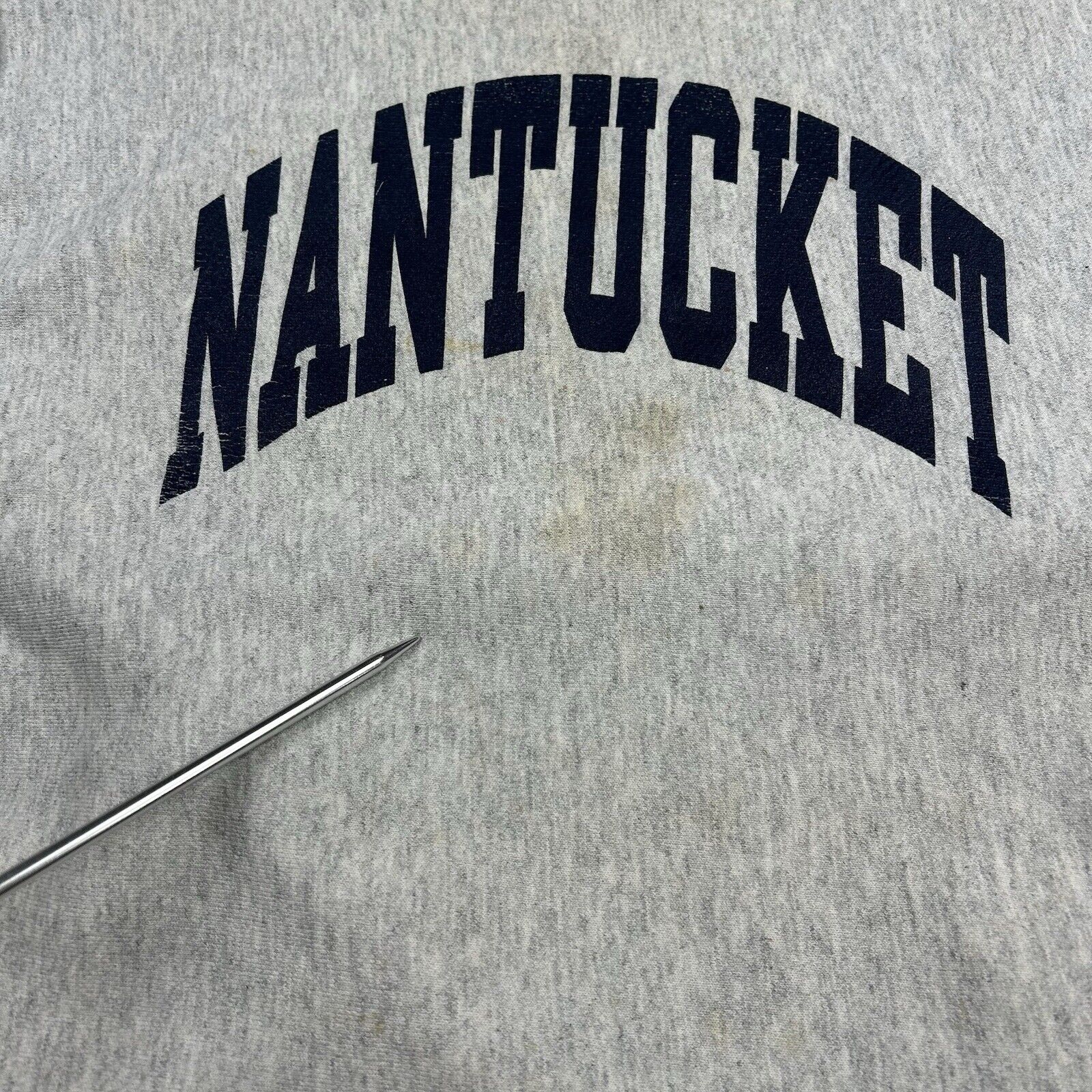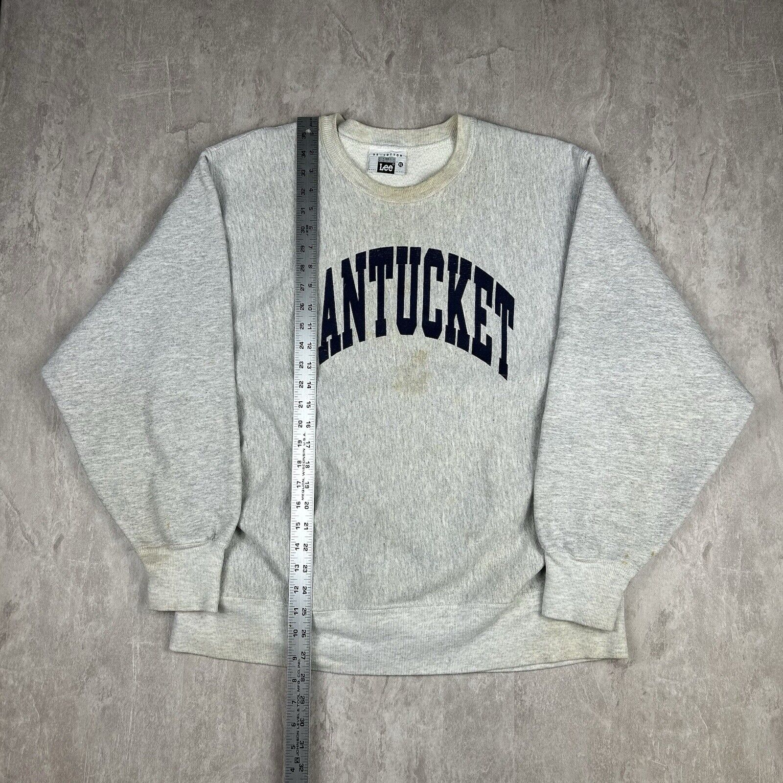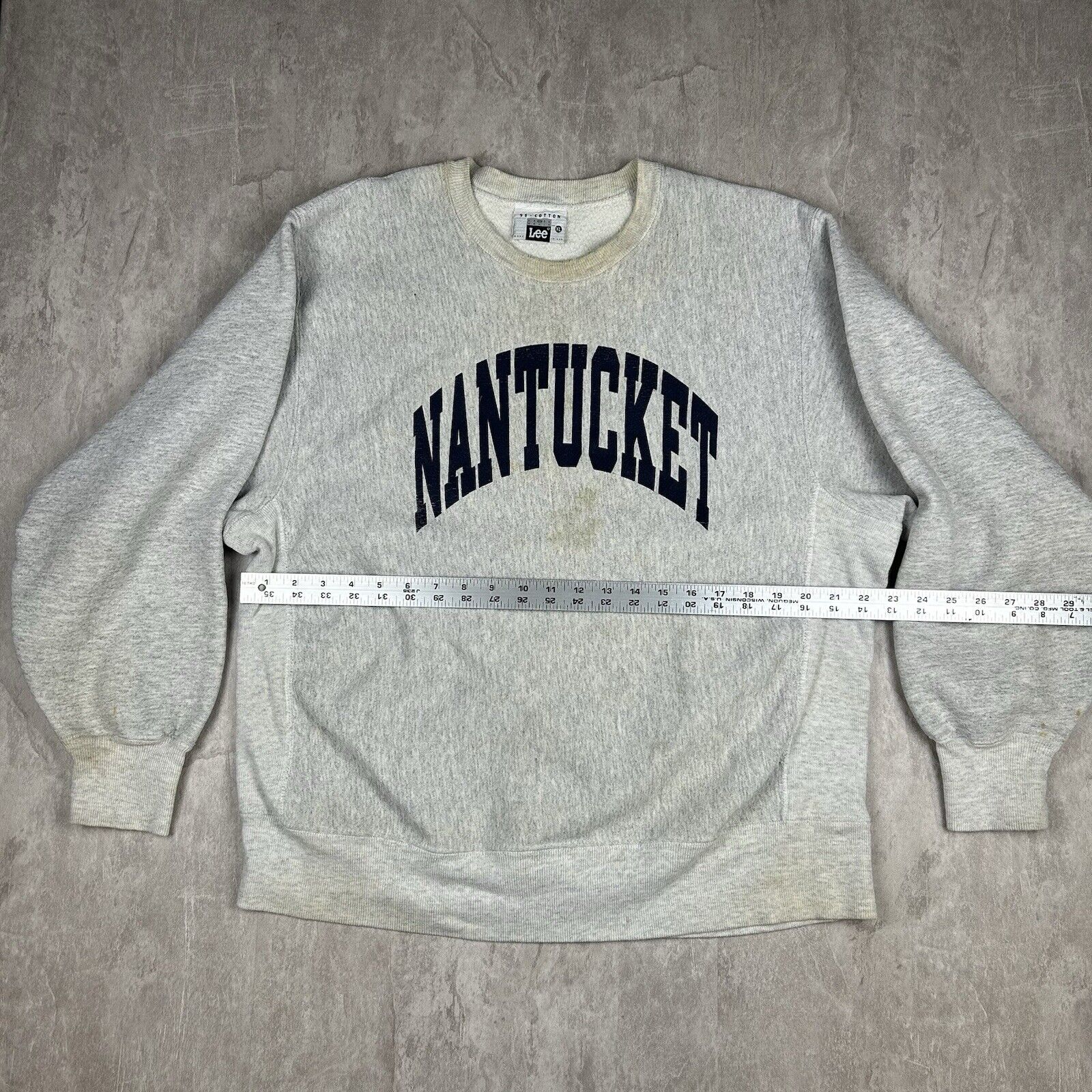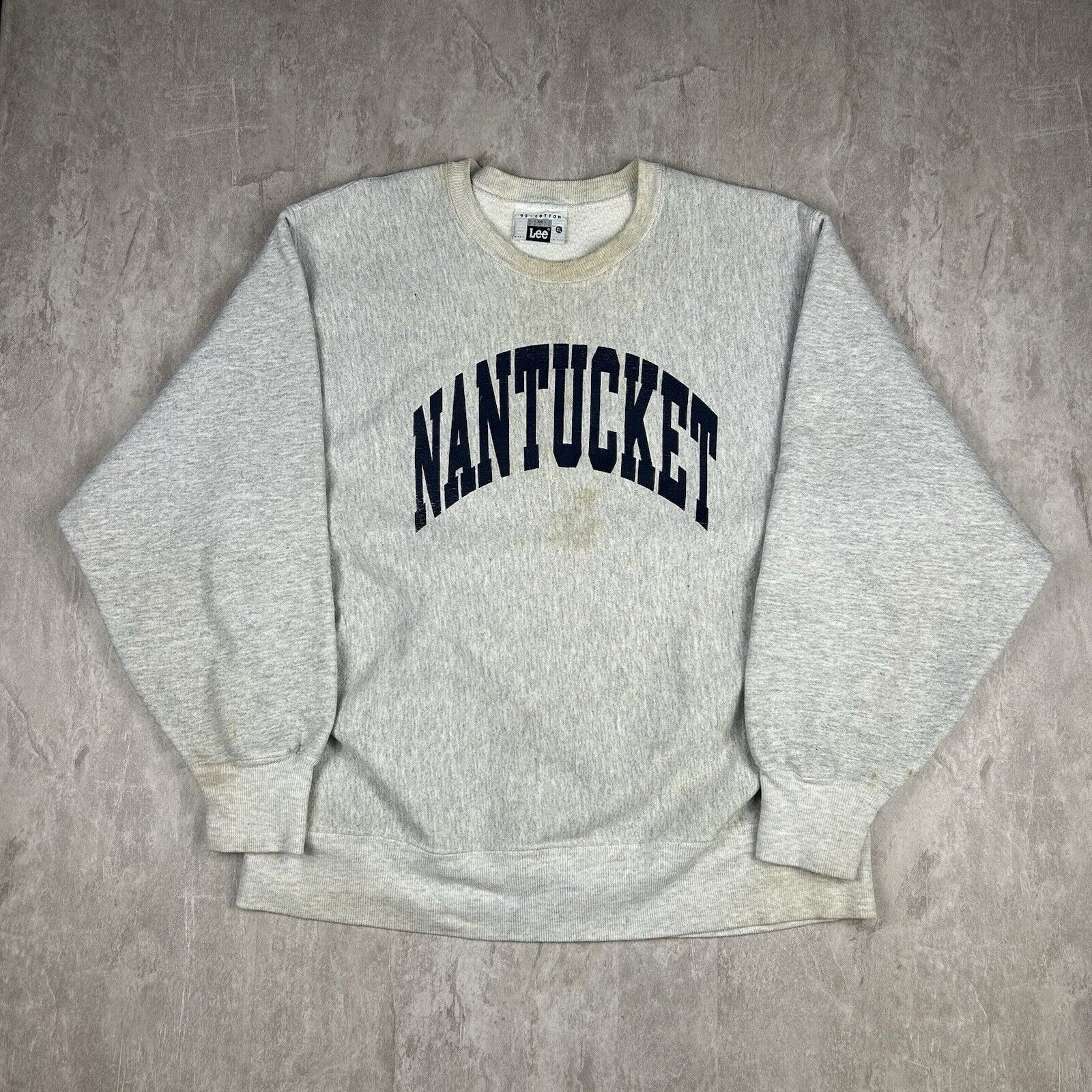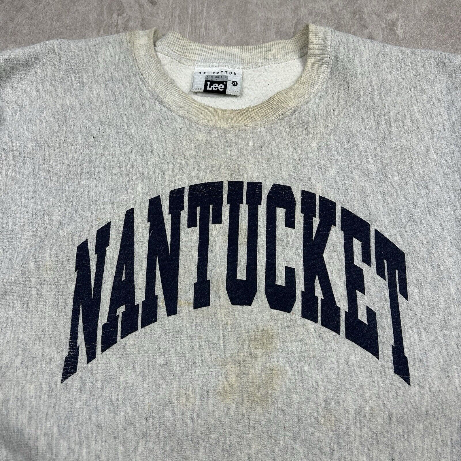 This Distressed Vintage 90s Lee Nantucket Crewneck Sweatshirt comes in a classic gray color, featuring a well-worn, authentic vintage look. Made for Men's Size XL, it captures a relaxed, timeless style with its iconic Nantucket design, perfect for lovers of coastal vibes and nostalgic fashion.