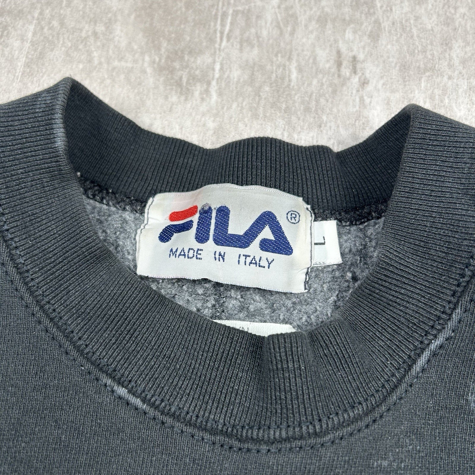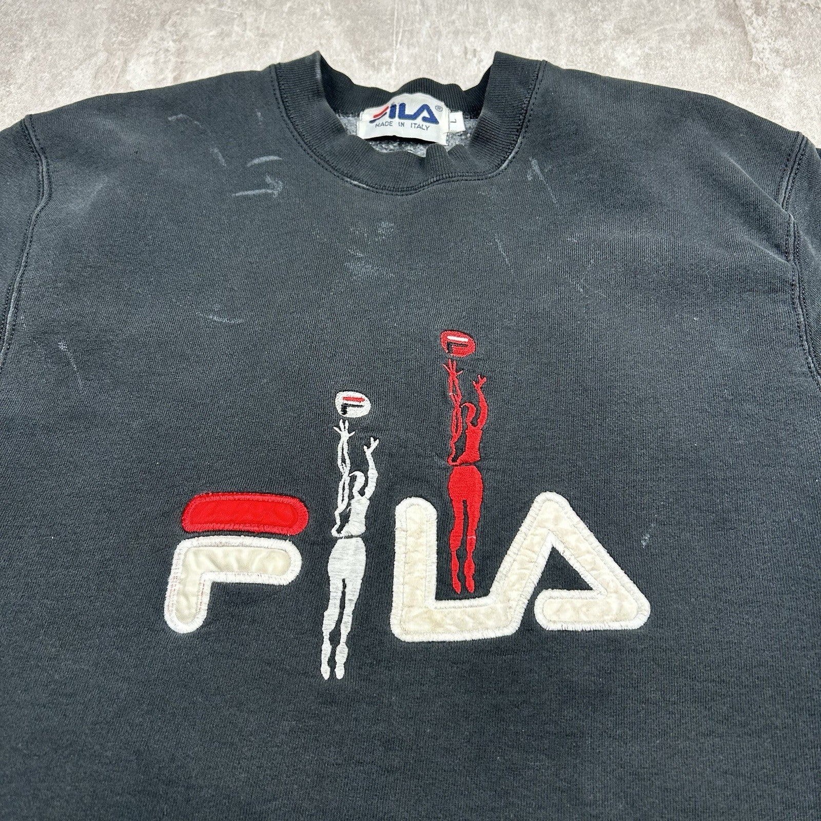 This distressed vintage Fila basketball crewneck sweatshirt features bold embroidered graphics and classic athletic style. Soft, worn-in feel with tons of character. Men's size L.