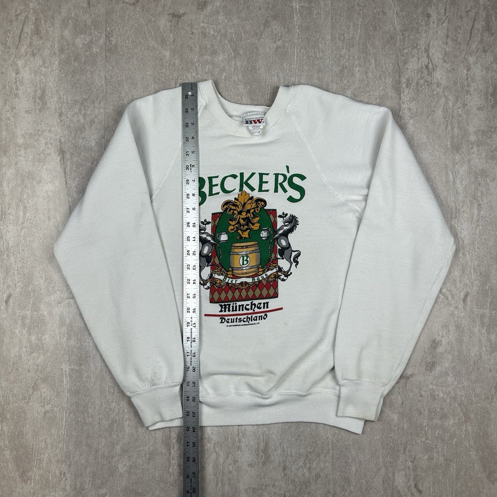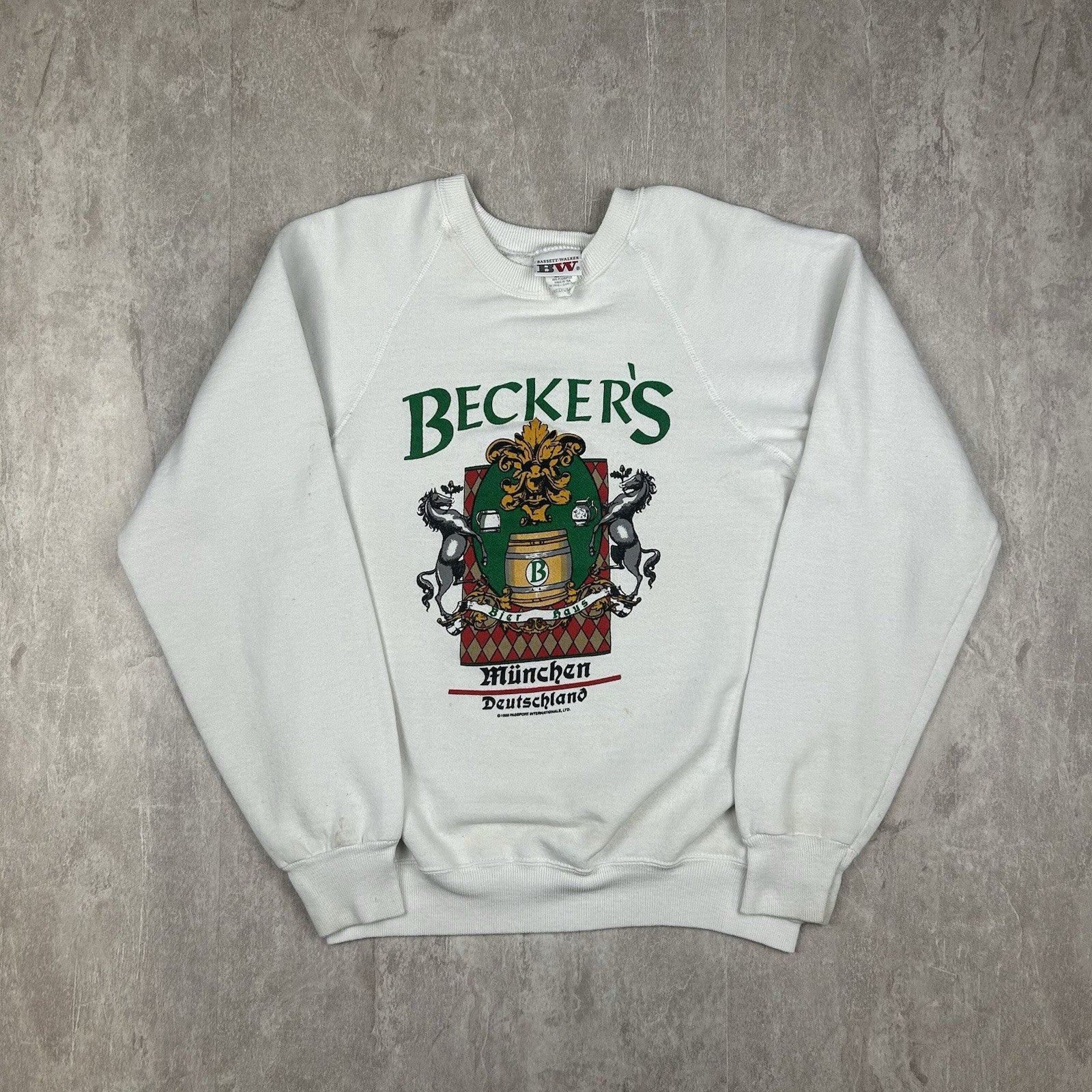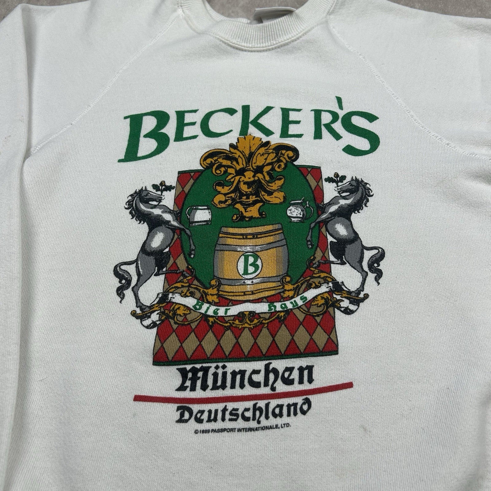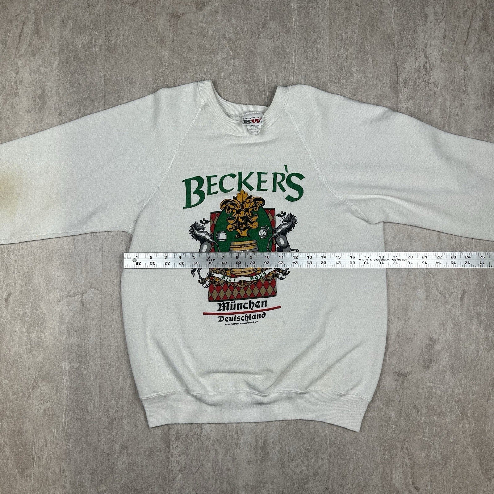 This distressed vintage Becker's Deutschland crewneck sweatshirt features classic Germany lettering with a worn-in, retro look. Comfortable and full of character. Men's size M.