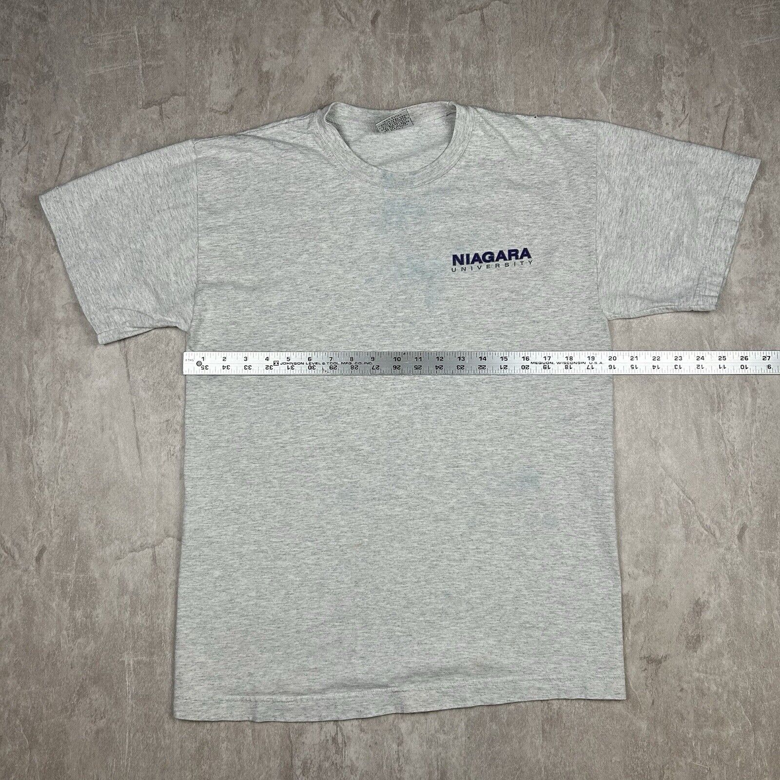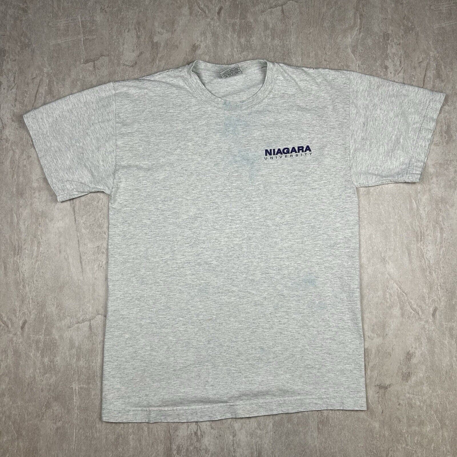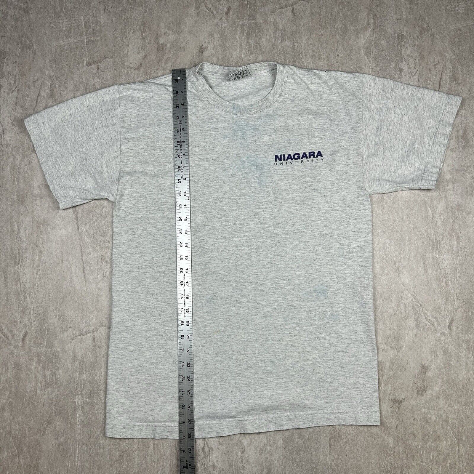 This distressed vintage Niagara University T-shirt in Men's Size M features a classic gray design with worn graphics, adding character and a well-loved feel. Made in the USA from soft cotton, this tee is perfect for fans of vintage collegiate apparel or anyone looking for a comfortable, nostalgic piece. A great find for collectors!