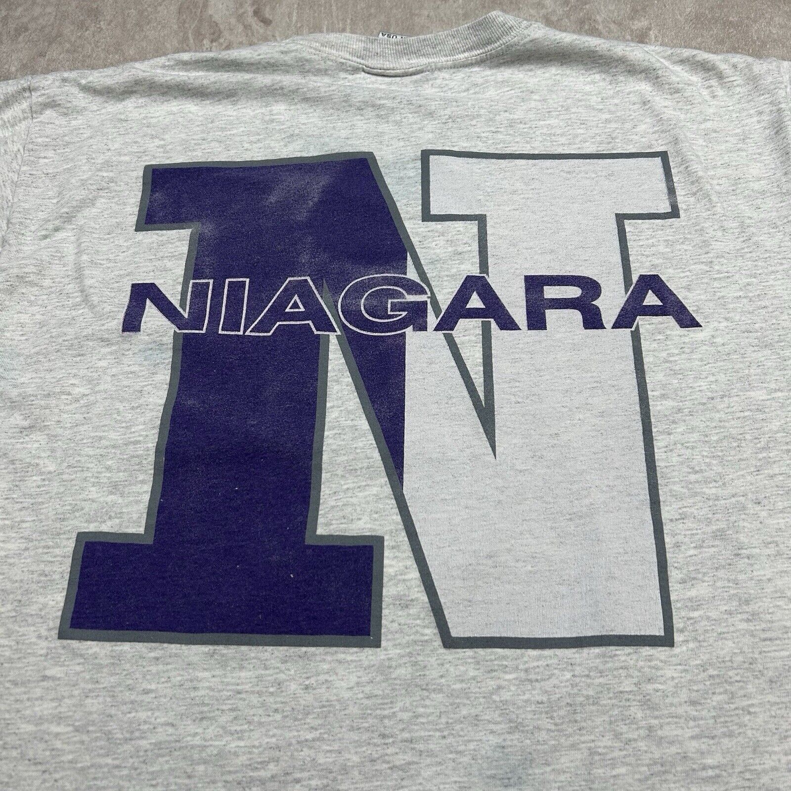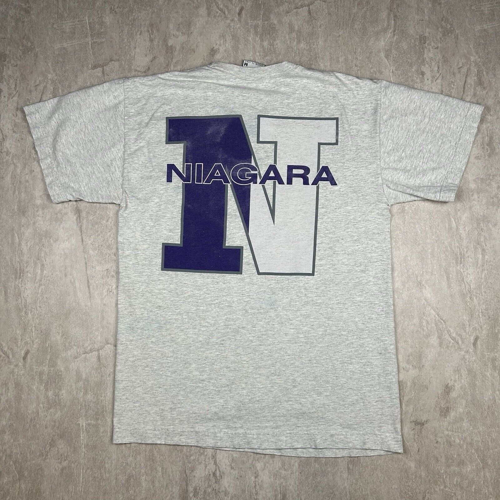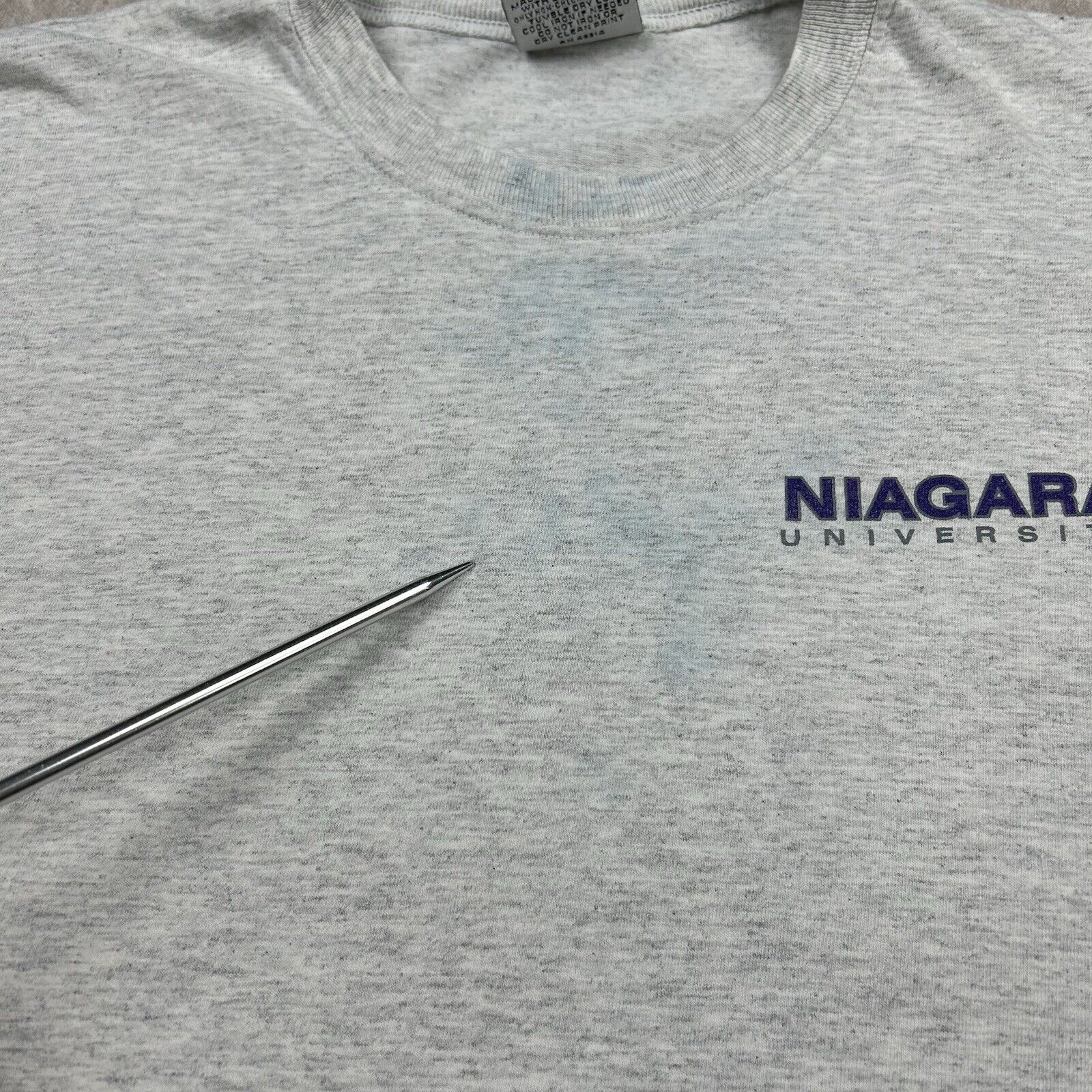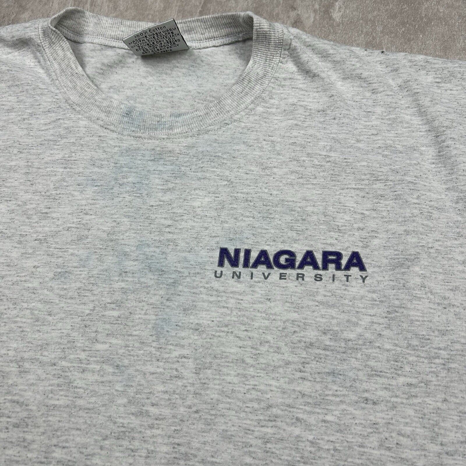 This distressed vintage Niagara University T-shirt in Men's Size M features a classic gray design with worn graphics, adding character and a well-loved feel. Made in the USA from soft cotton, this tee is perfect for fans of vintage collegiate apparel or anyone looking for a comfortable, nostalgic piece. A great find for collectors!