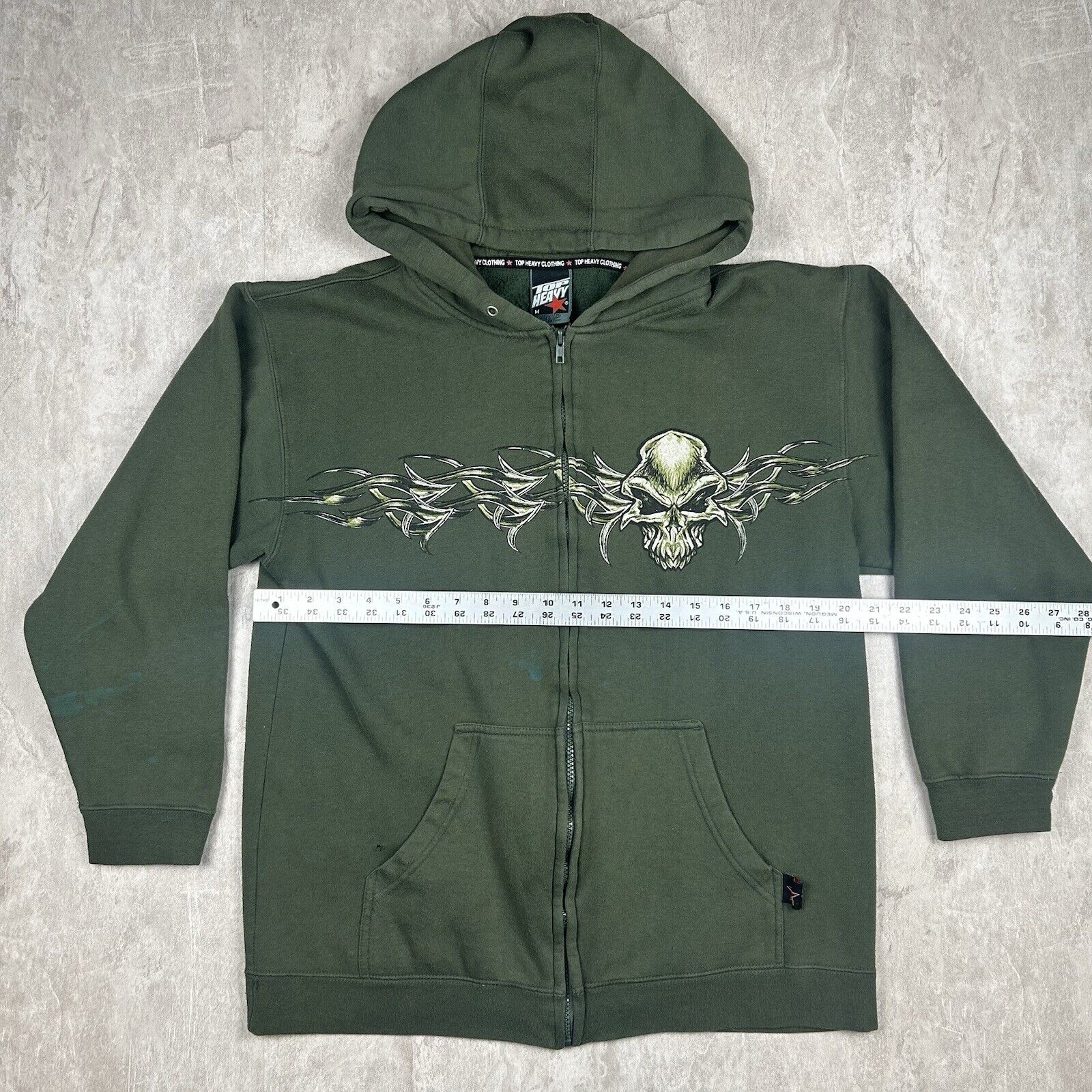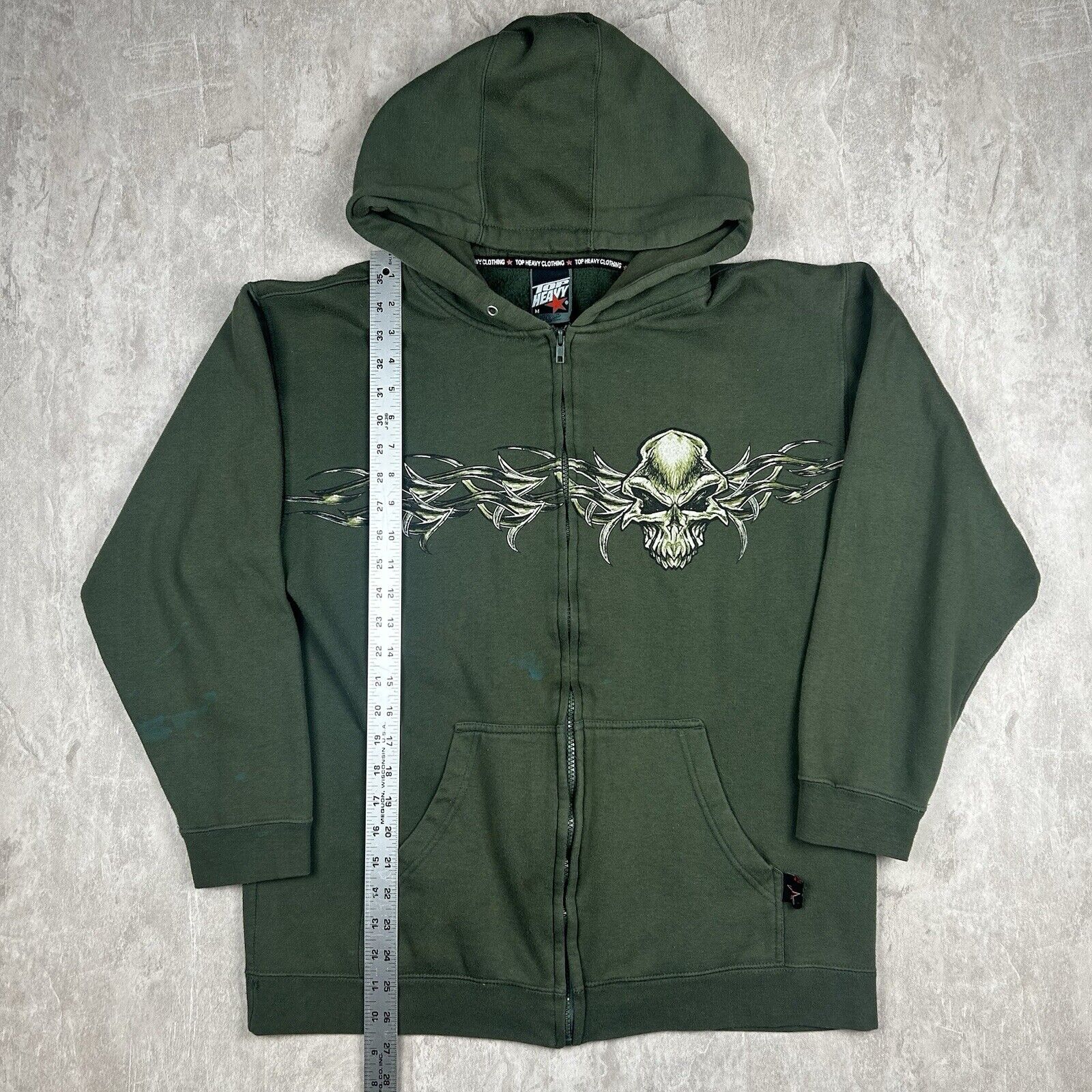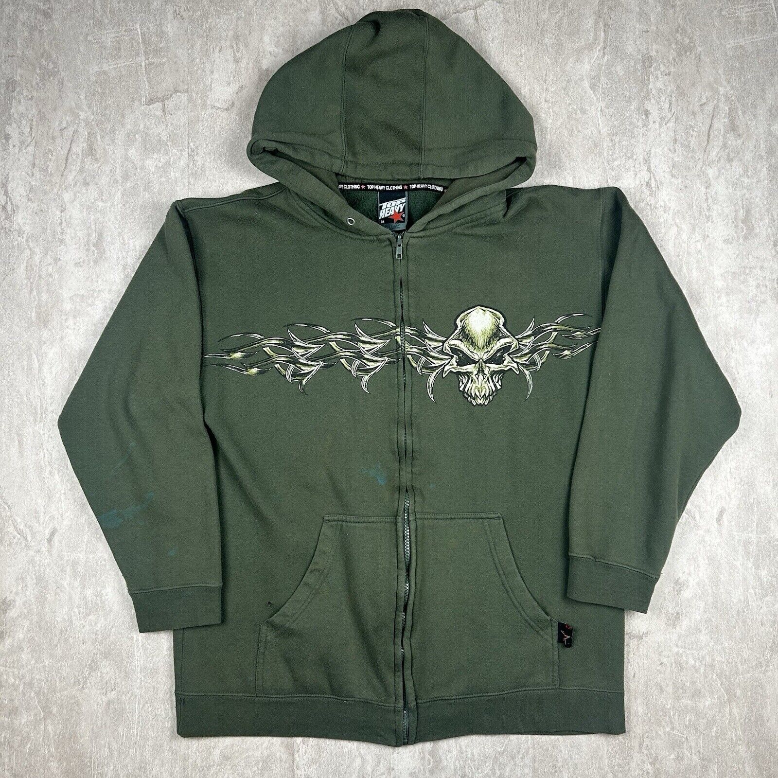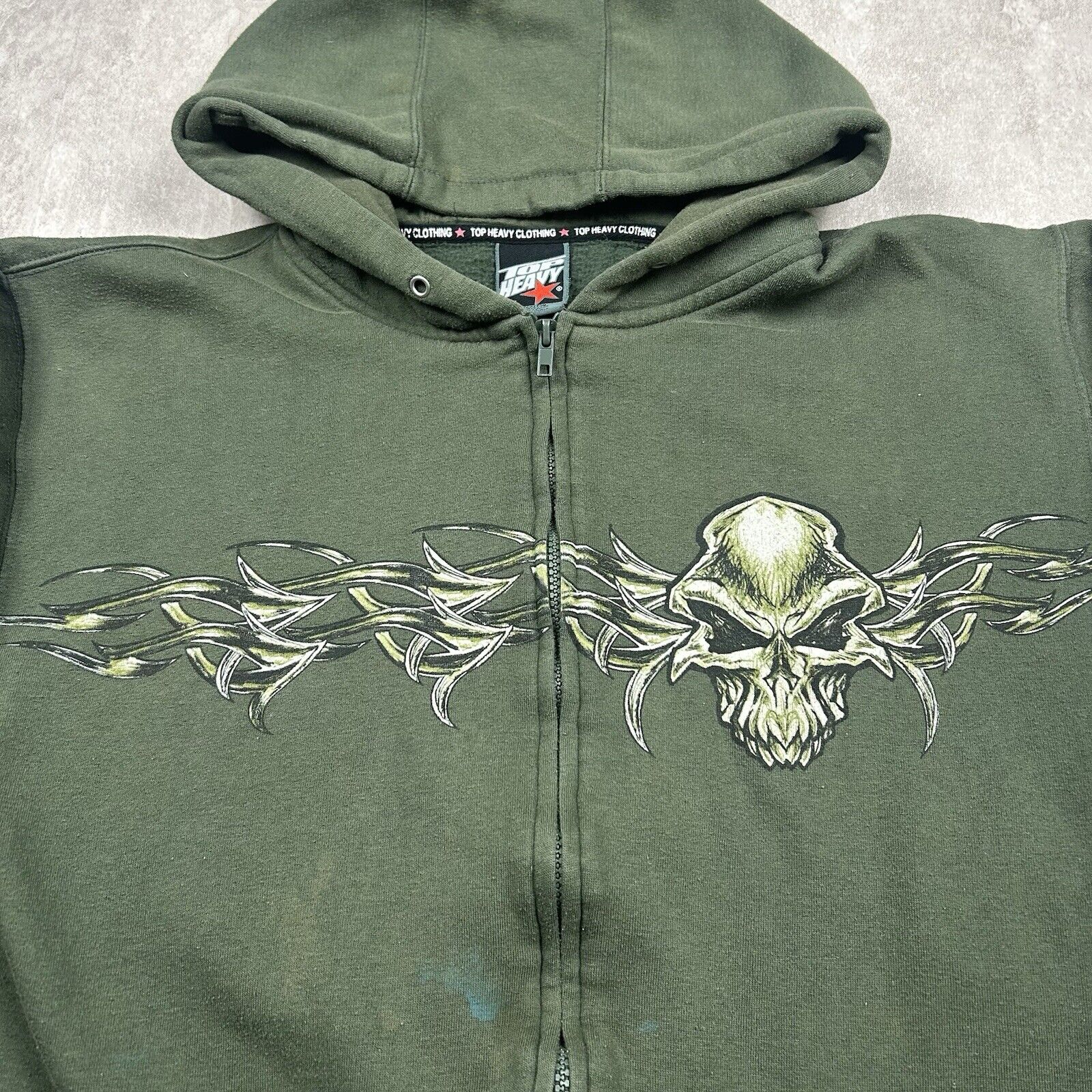 Embrace Y2K grunge with this distressed vintage Top Heavy hoodie. Featuring a bold tribal skull graphic, it's the perfect blend of edgy and retro style. Men's Size M.