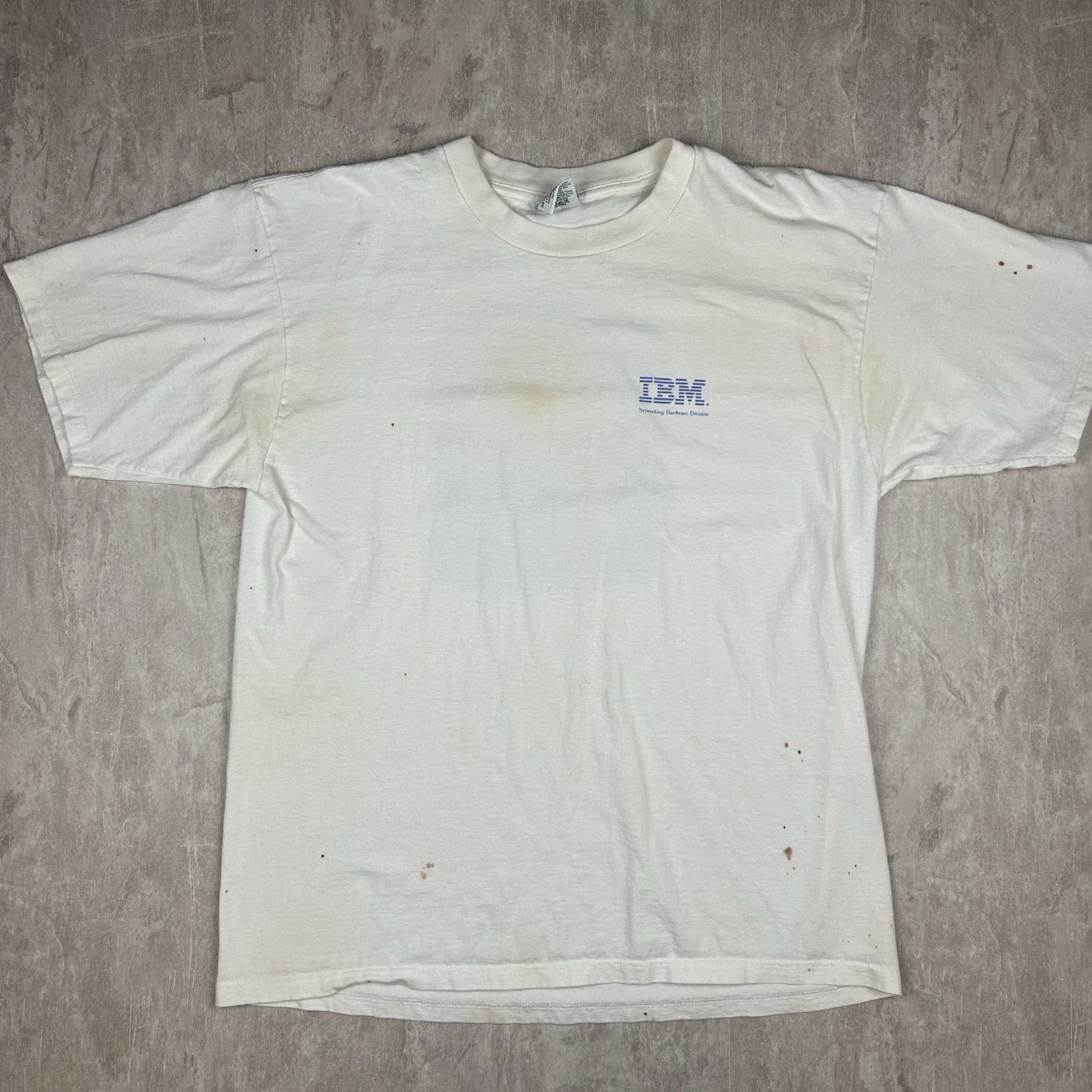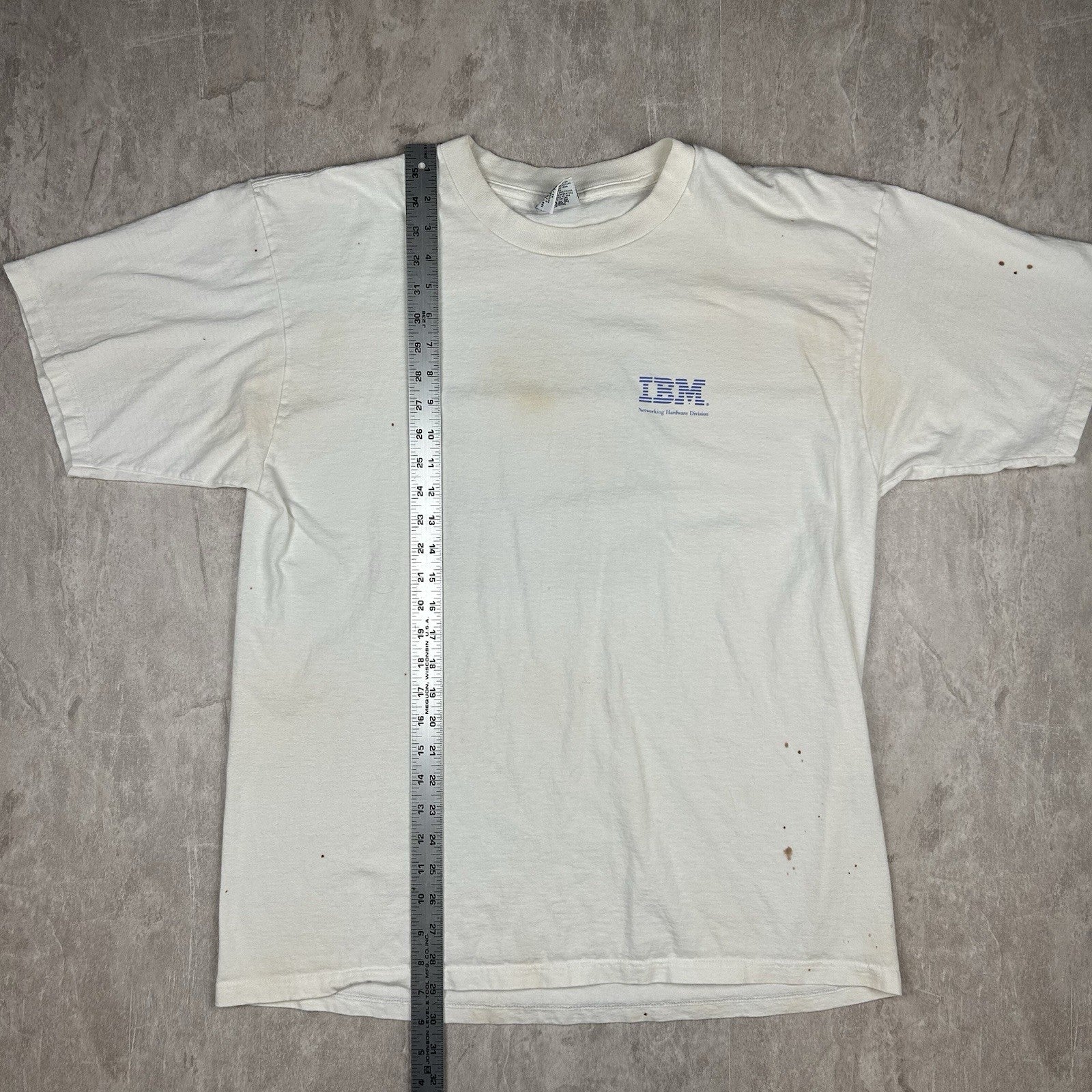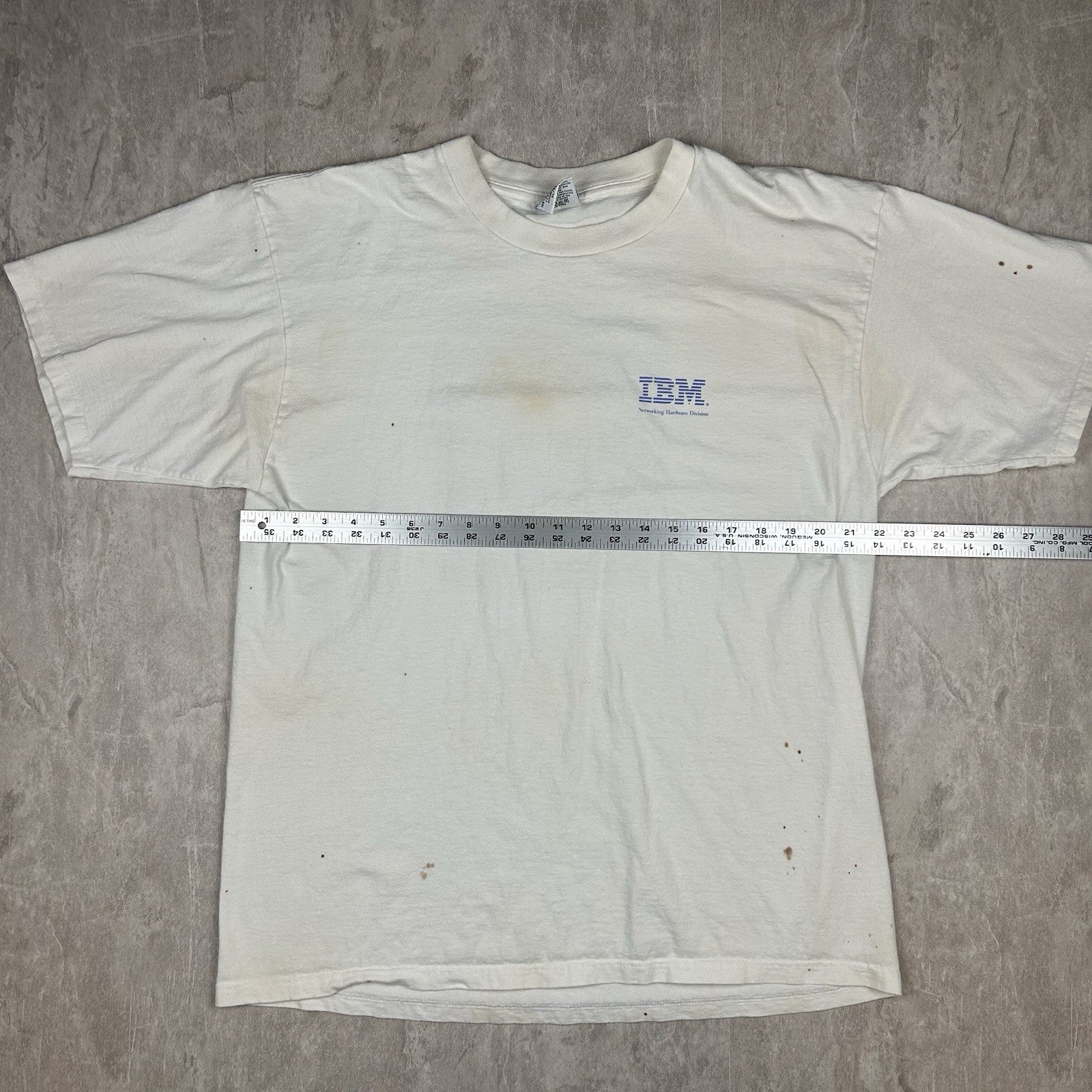 Retro tech vibes meet corporate cool in this distressed vintage 90s IBM Computers T-shirt. Features ATM technology graphics on soft white cotton—authentic wear adds character. Tagged men's size XL.