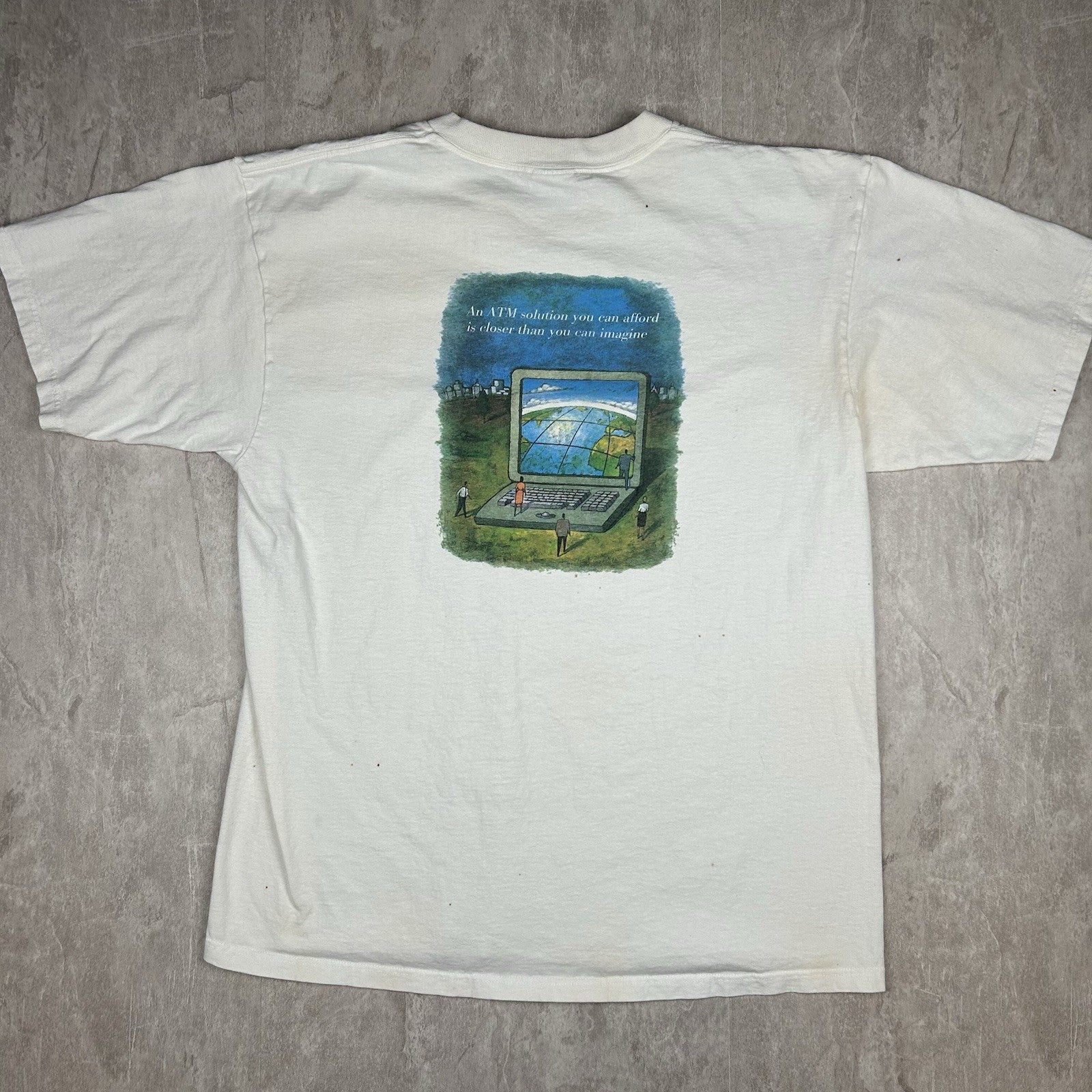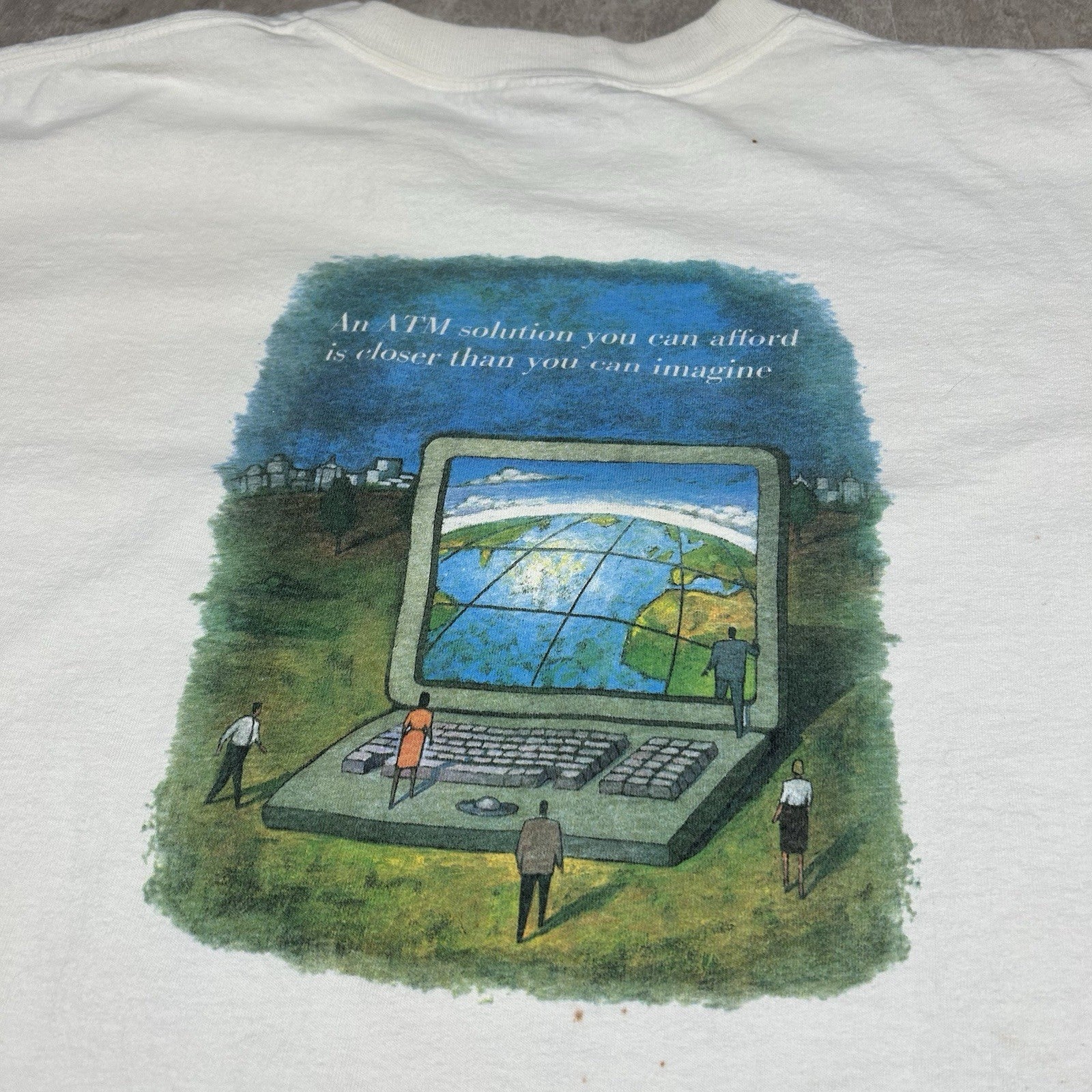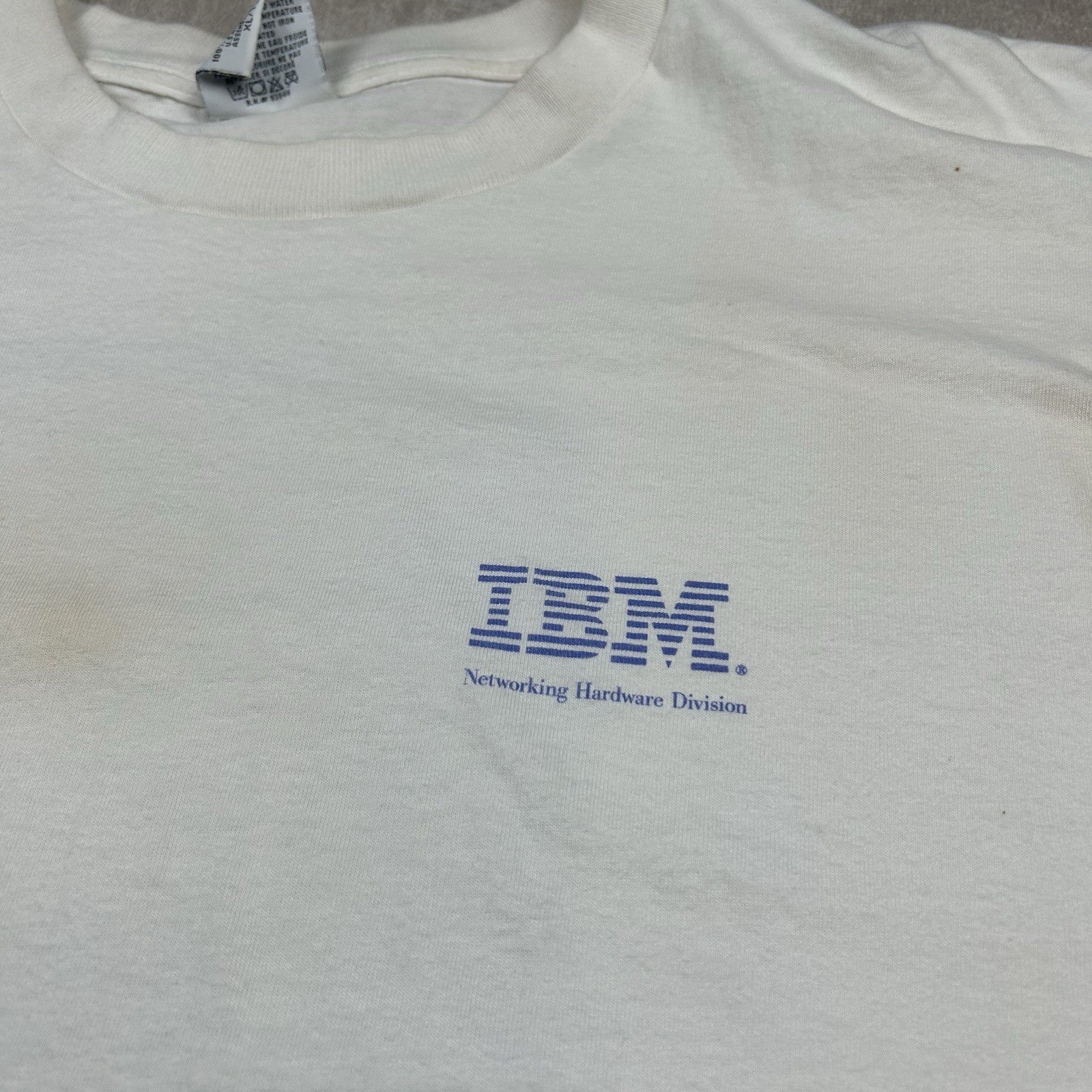Retro tech vibes meet corporate cool in this distressed vintage 90s IBM Computers T-shirt. Features ATM technology graphics on soft white cotton—authentic wear adds character. Tagged men's size XL.