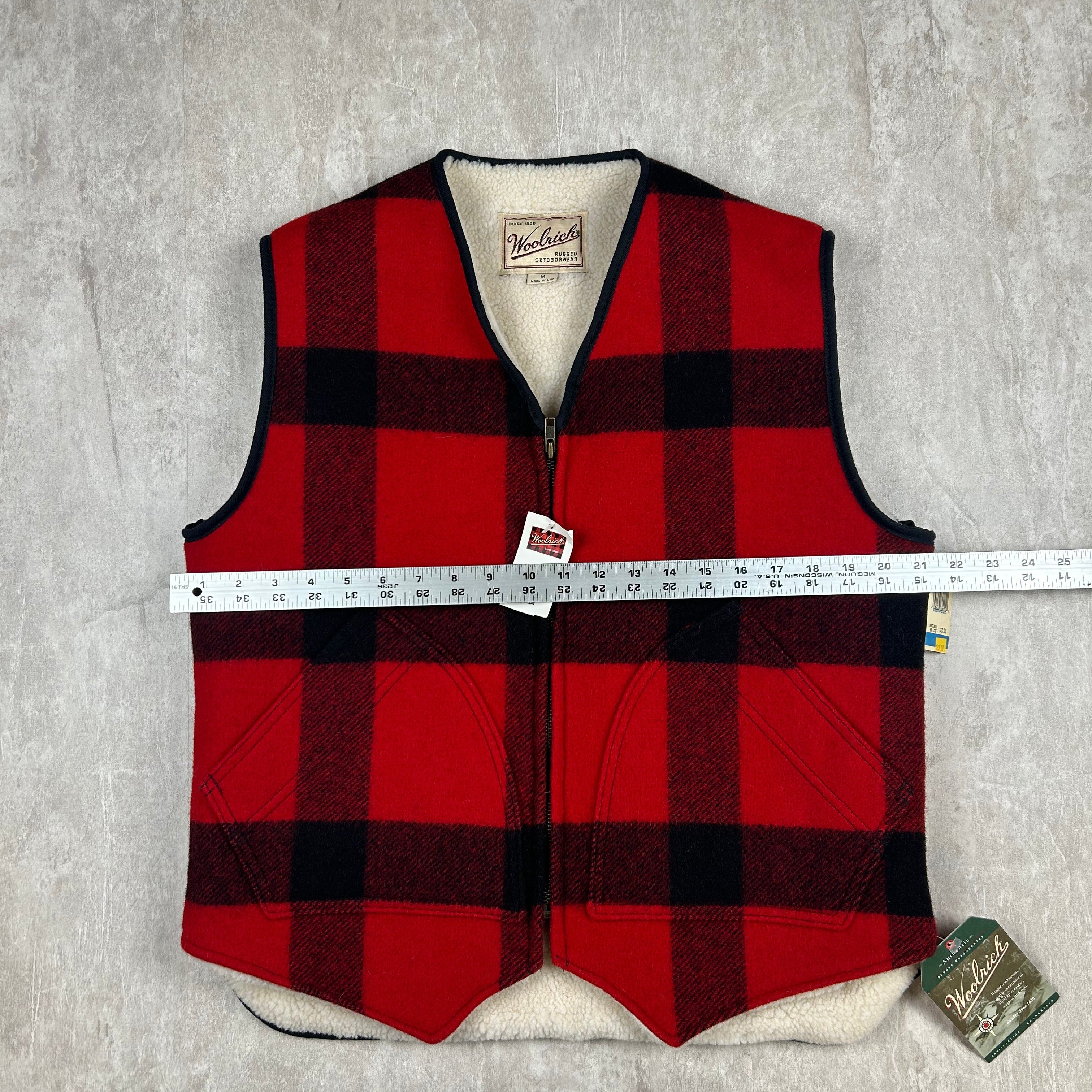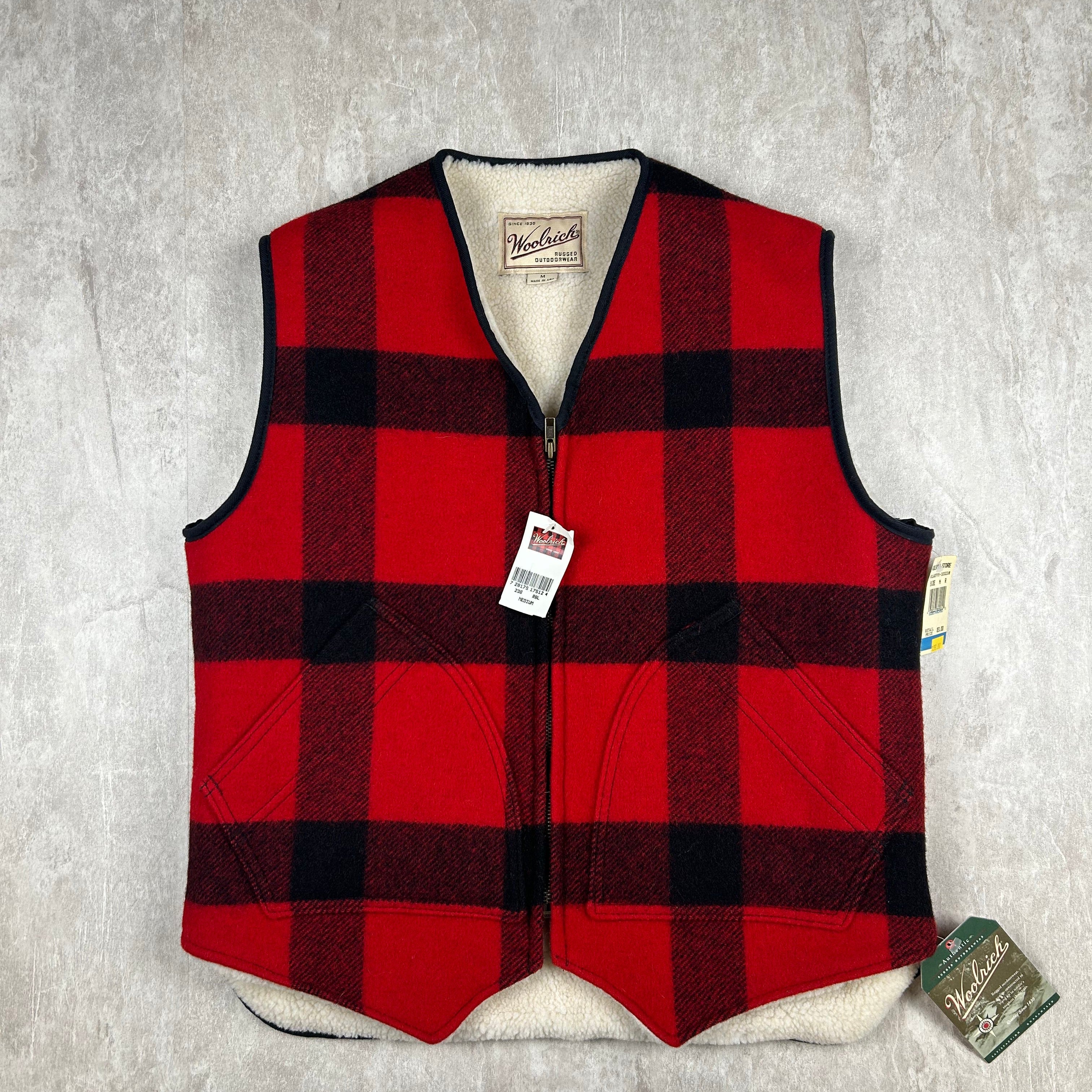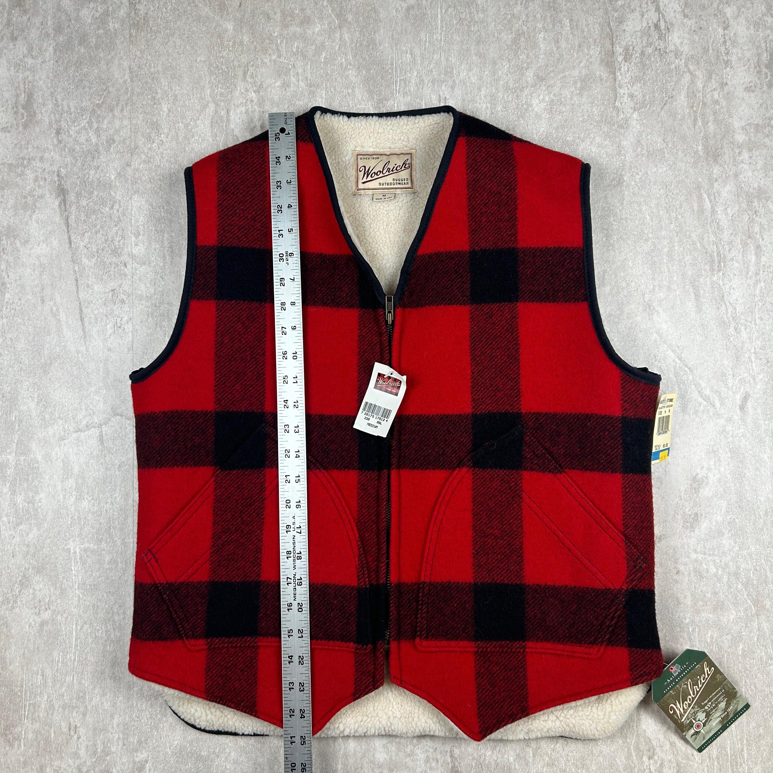 New Vintage Woolrich Sherpa Lined Red Black Plaid Wool Vest Men’s Size M