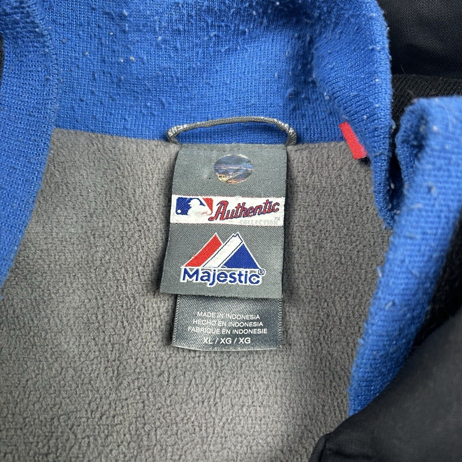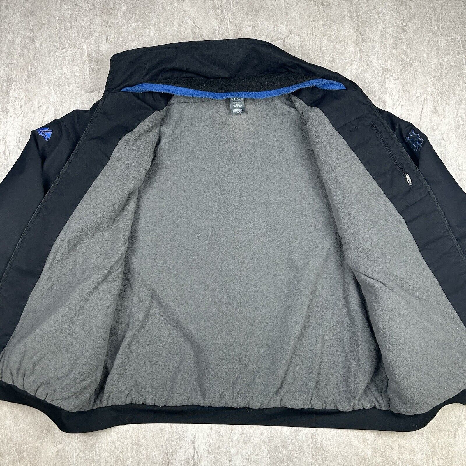 This New York Mets Majestic jacket in Men's Size XL features a sleek black and blue design, showcasing authentic MLB branding. Made from high-quality materials, this jacket combines comfort and style, making it perfect for game days or casual outings. A must-have for Mets fans and collectors of official sports apparel!