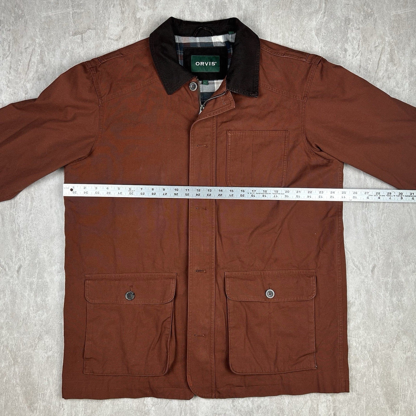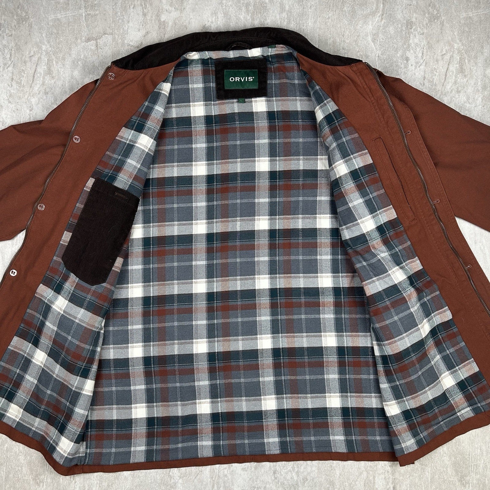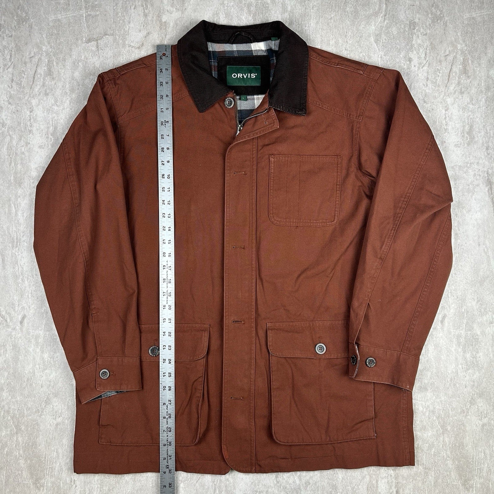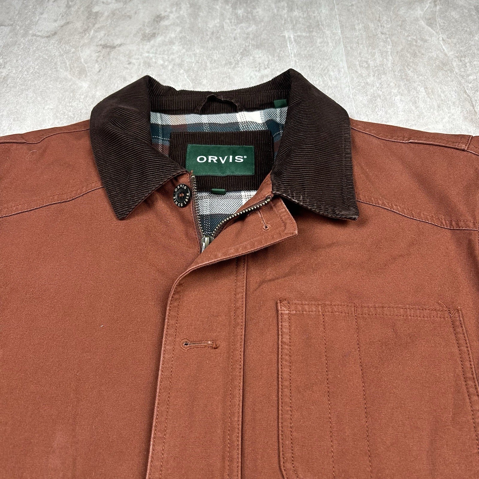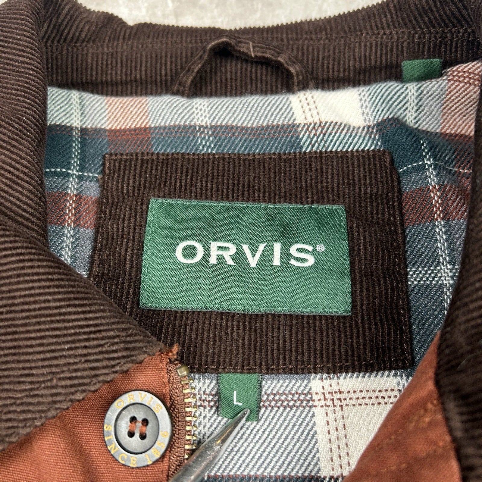Orvis Brown Tan Chore Barn Coat Plaid Flannel Lined Corduroy Collar Men’s Size L