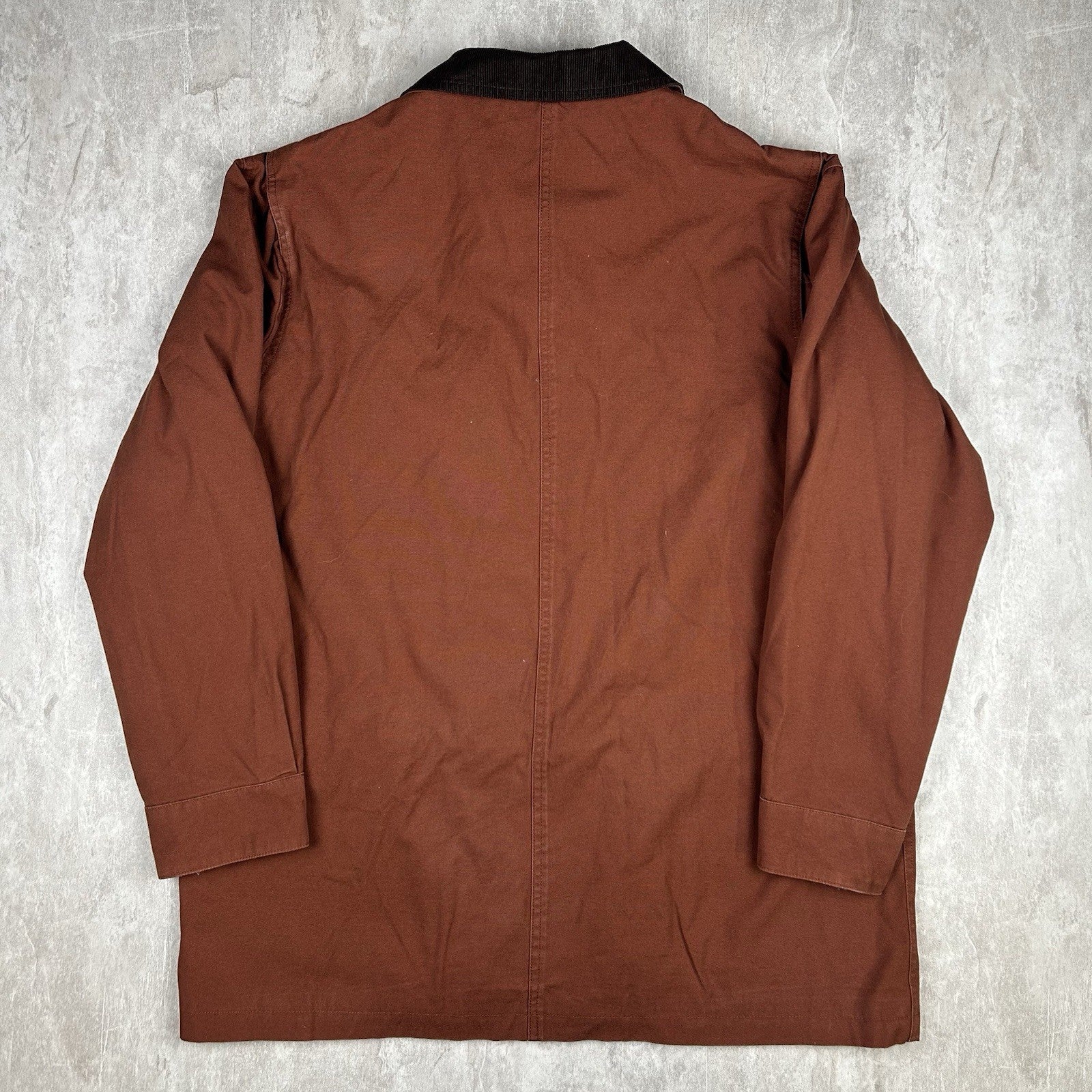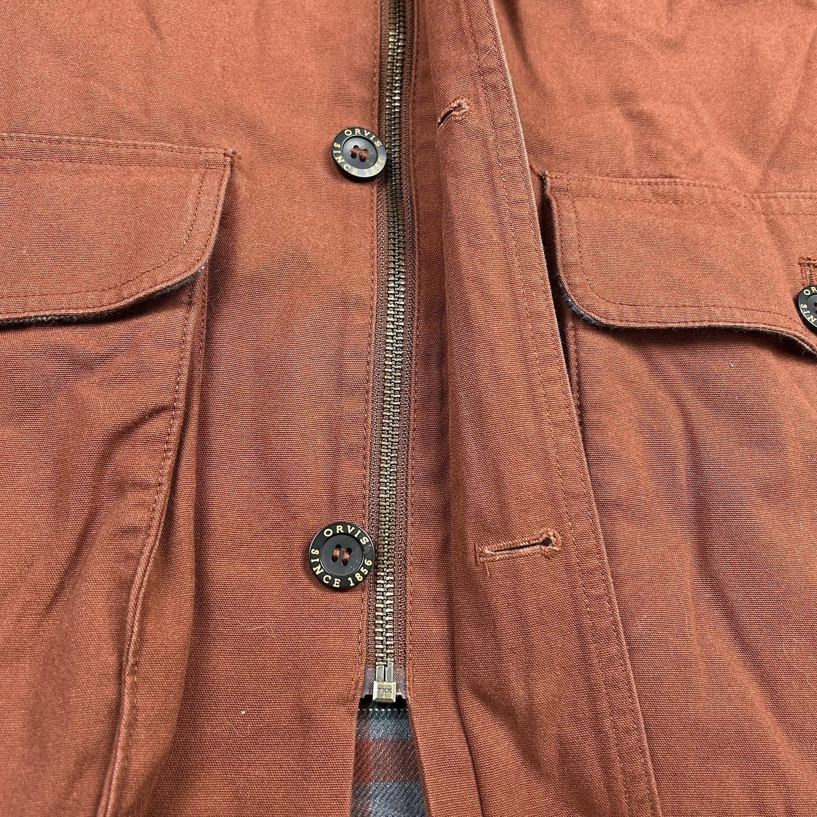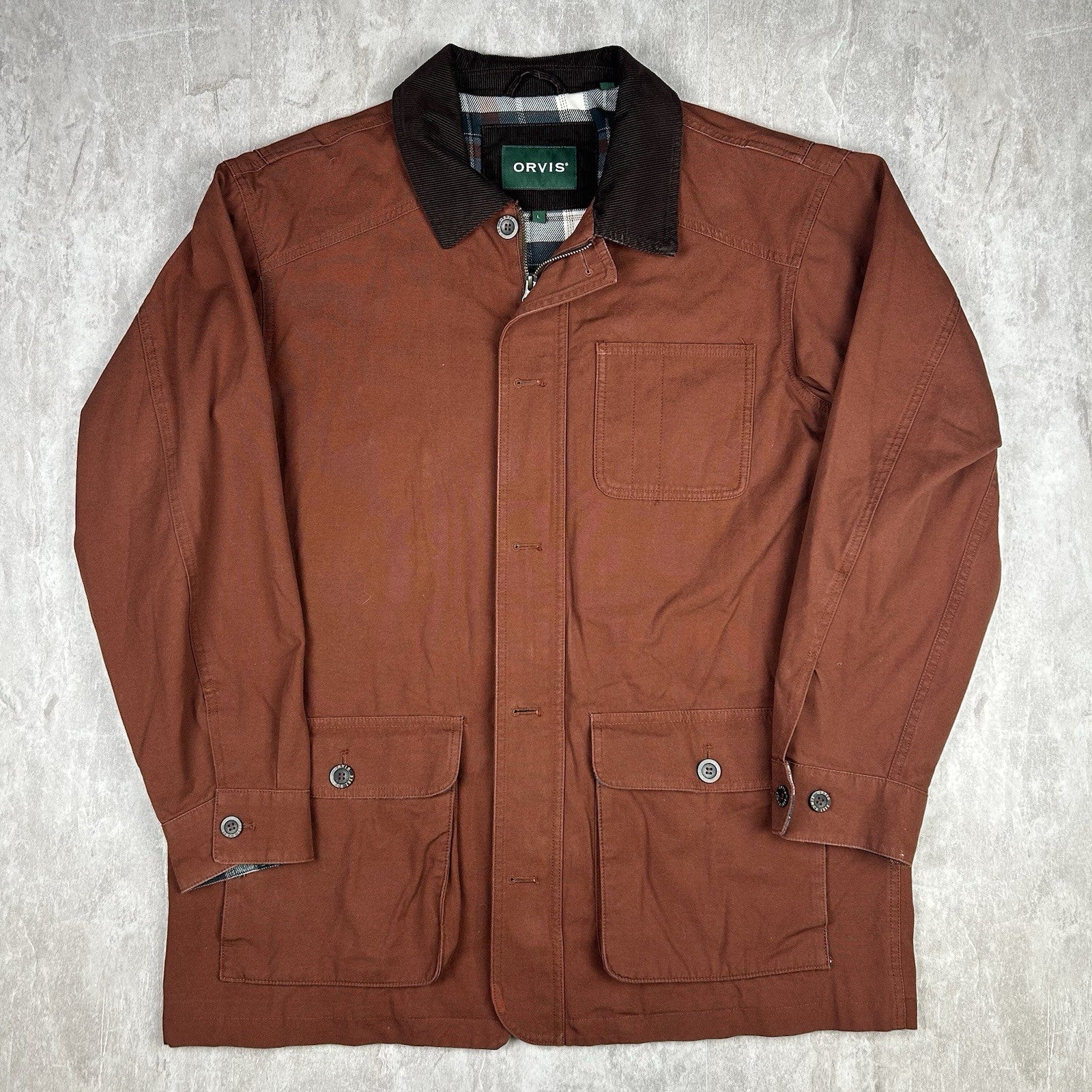Orvis brown and tan chore coat with a rugged cotton canvas shell and soft plaid flannel lining. Features a corduroy collar, large utility pockets, and timeless barn coat styling. Men's size L.