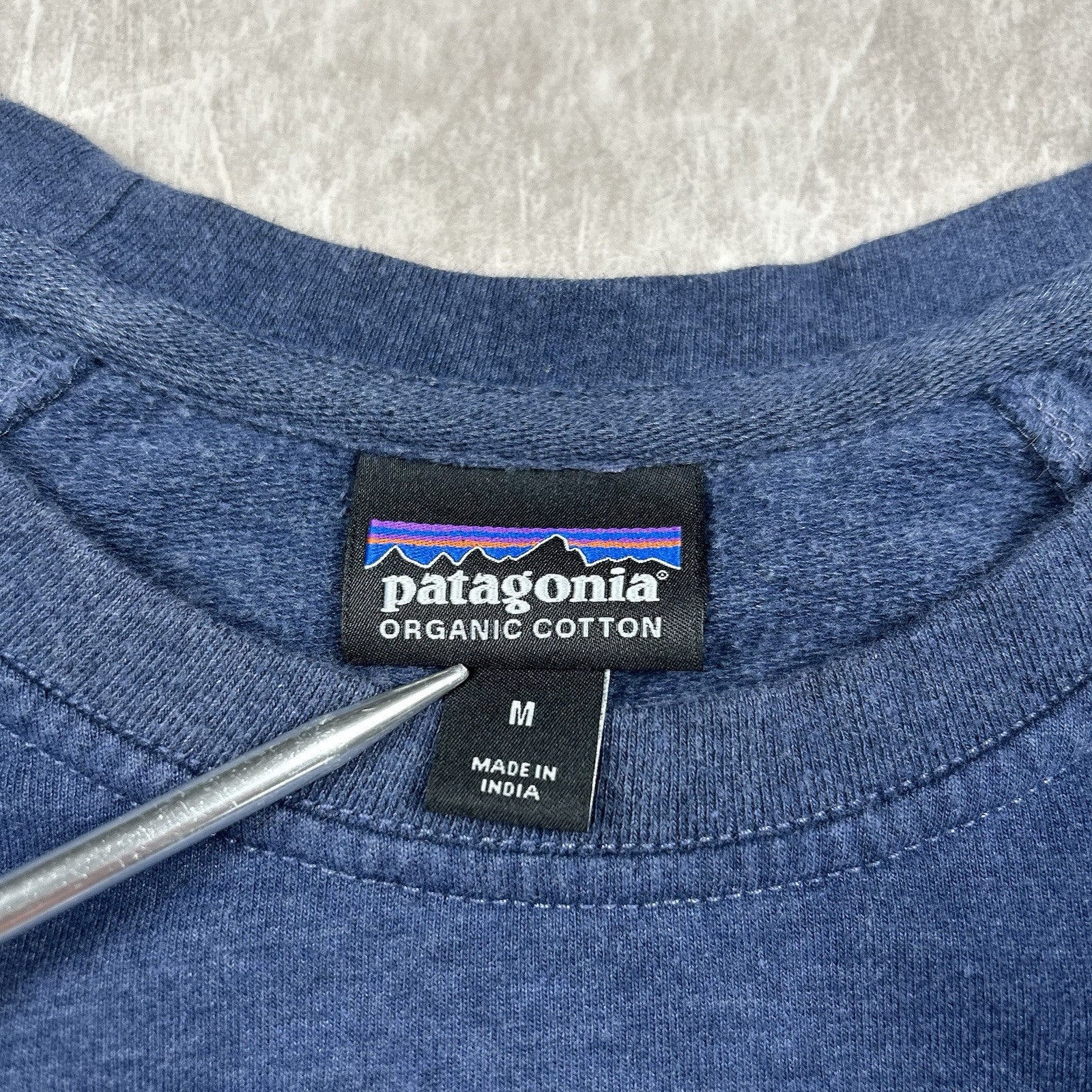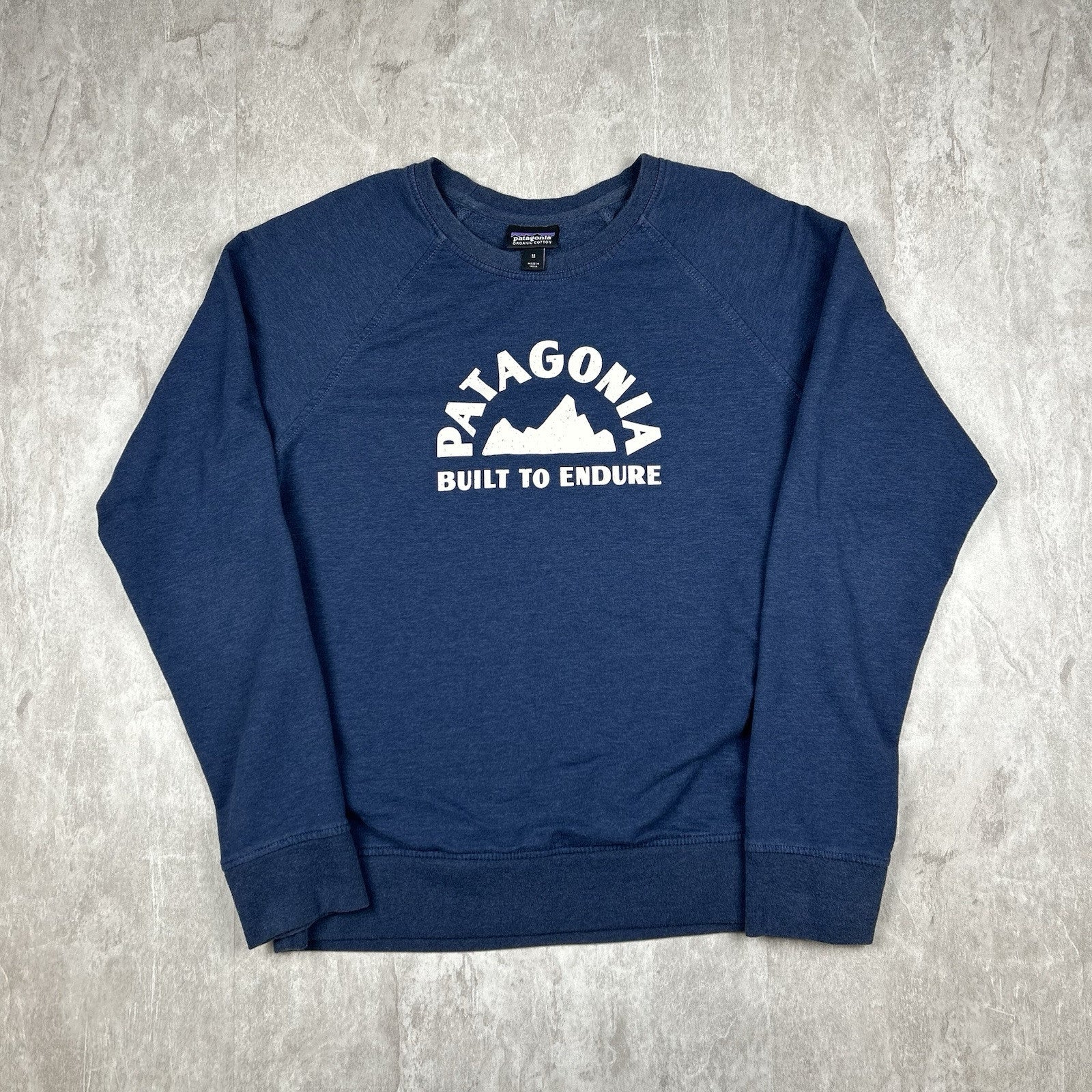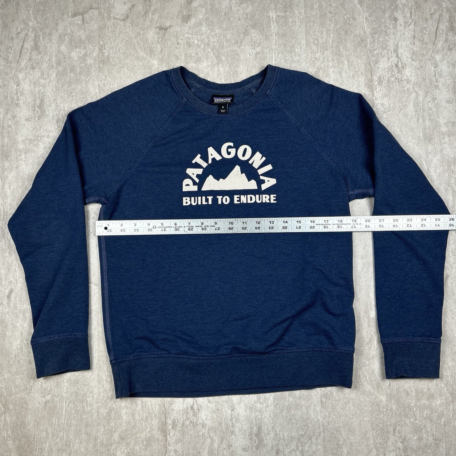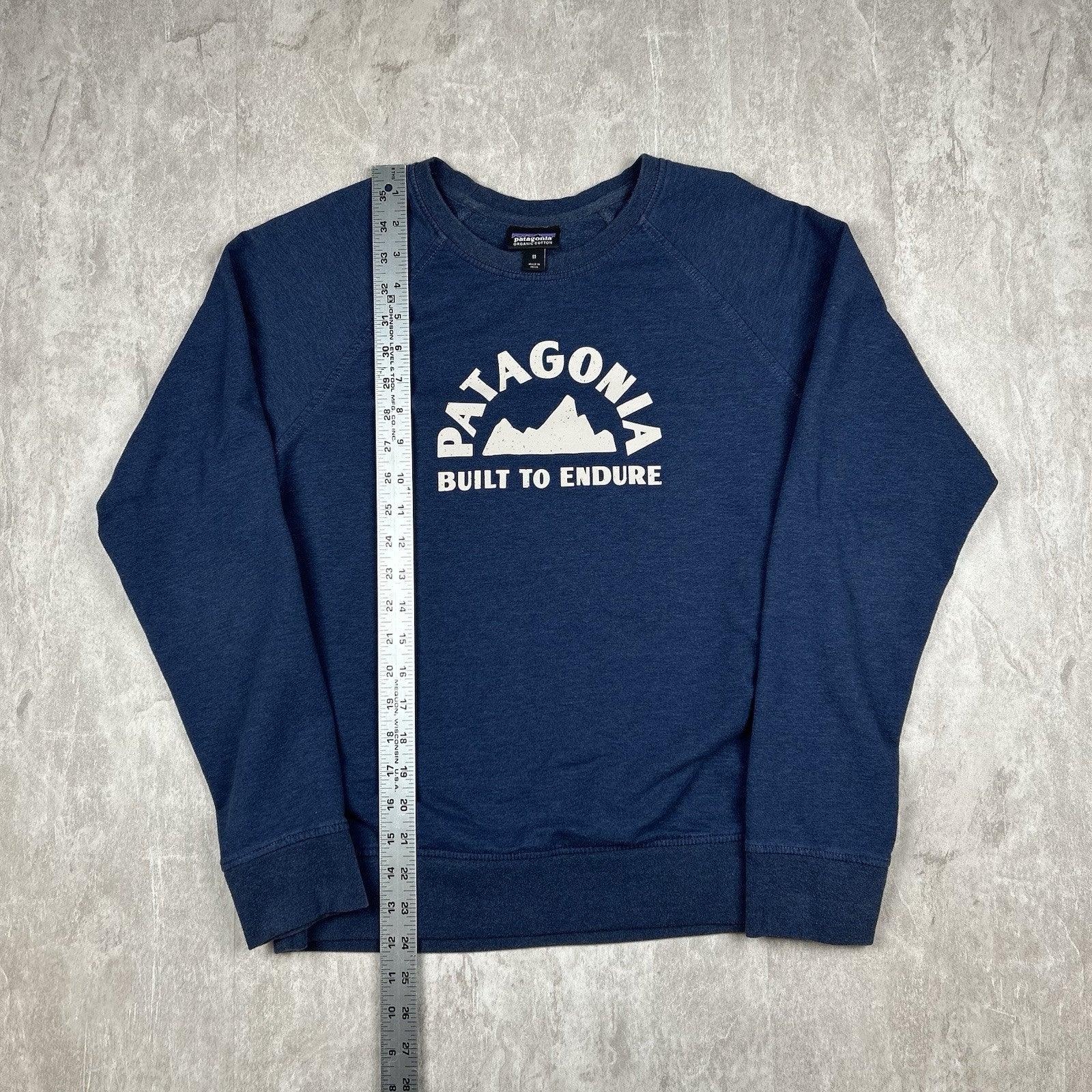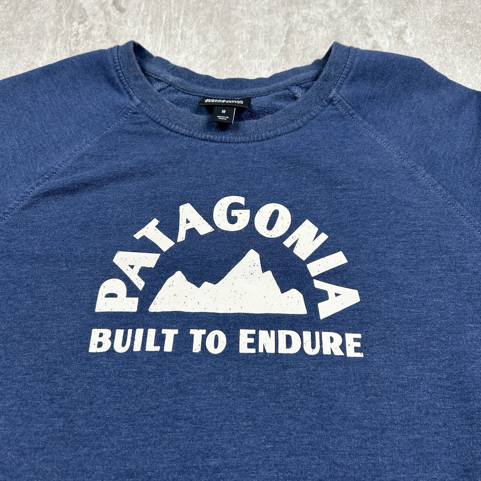 This Patagonia blue crewneck sweatshirt is a durable and comfortable pullover, designed with the "Built To Endure" slogan. Made for active lifestyles, it's in great condition and fits a men's size medium.