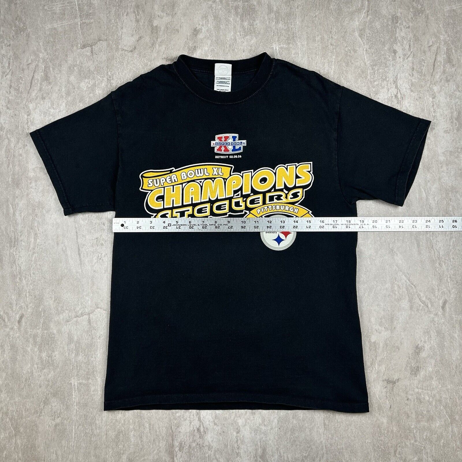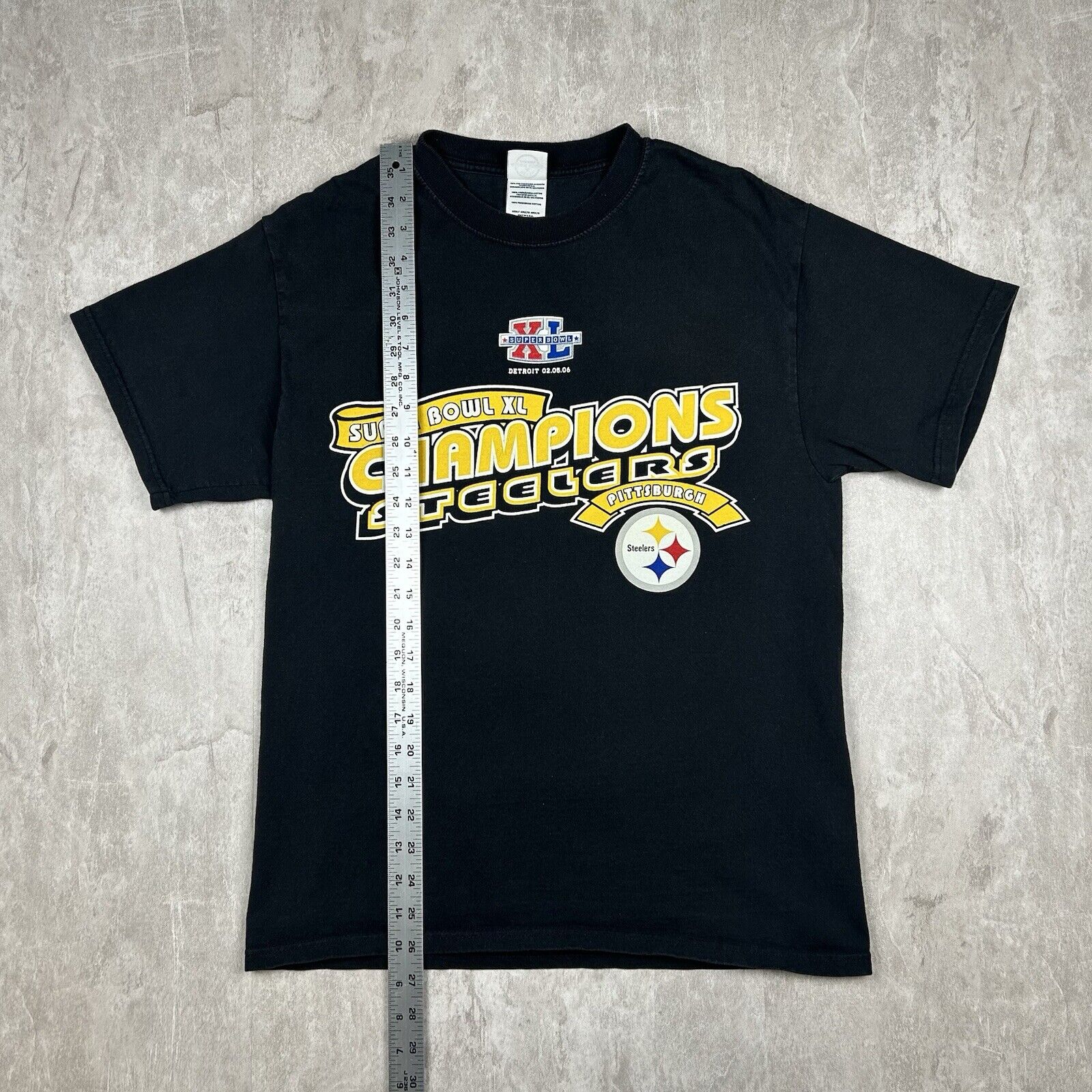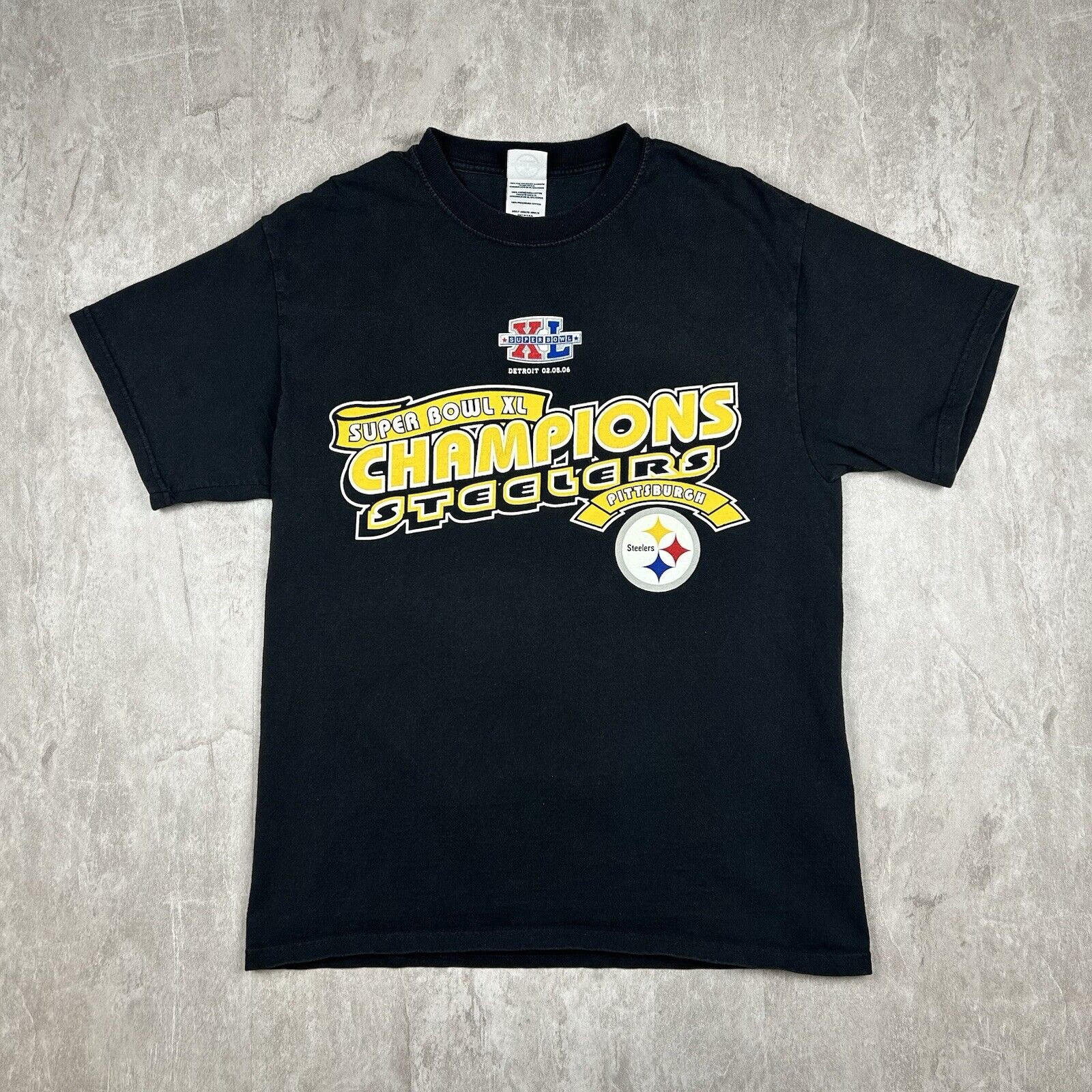 This Pittsburgh Steelers 2006 Super Bowl XL Champs T-shirt in Men's Size M features a bold black design celebrating the team's championship victory. Made from soft cotton, this tee is perfect for showcasing your Steelers pride. A great addition for fans and collectors of vintage NFL memorabilia!