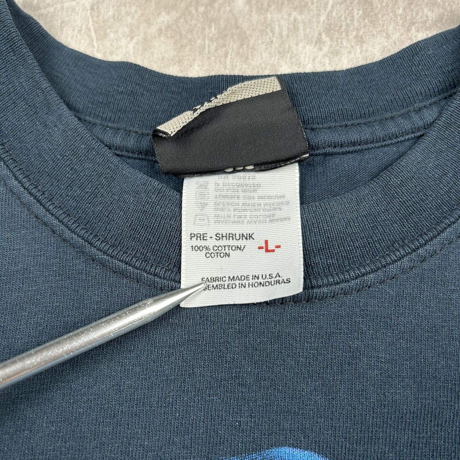 This rare vintage 2002 Y2K Liquid Blue T-shirt features a stunning wizard and dragon magic graphic, capturing the era's mystical vibe. Made for Men's size L, it boasts high-quality construction and vivid details, making it a must-have for collectors and fantasy fans.