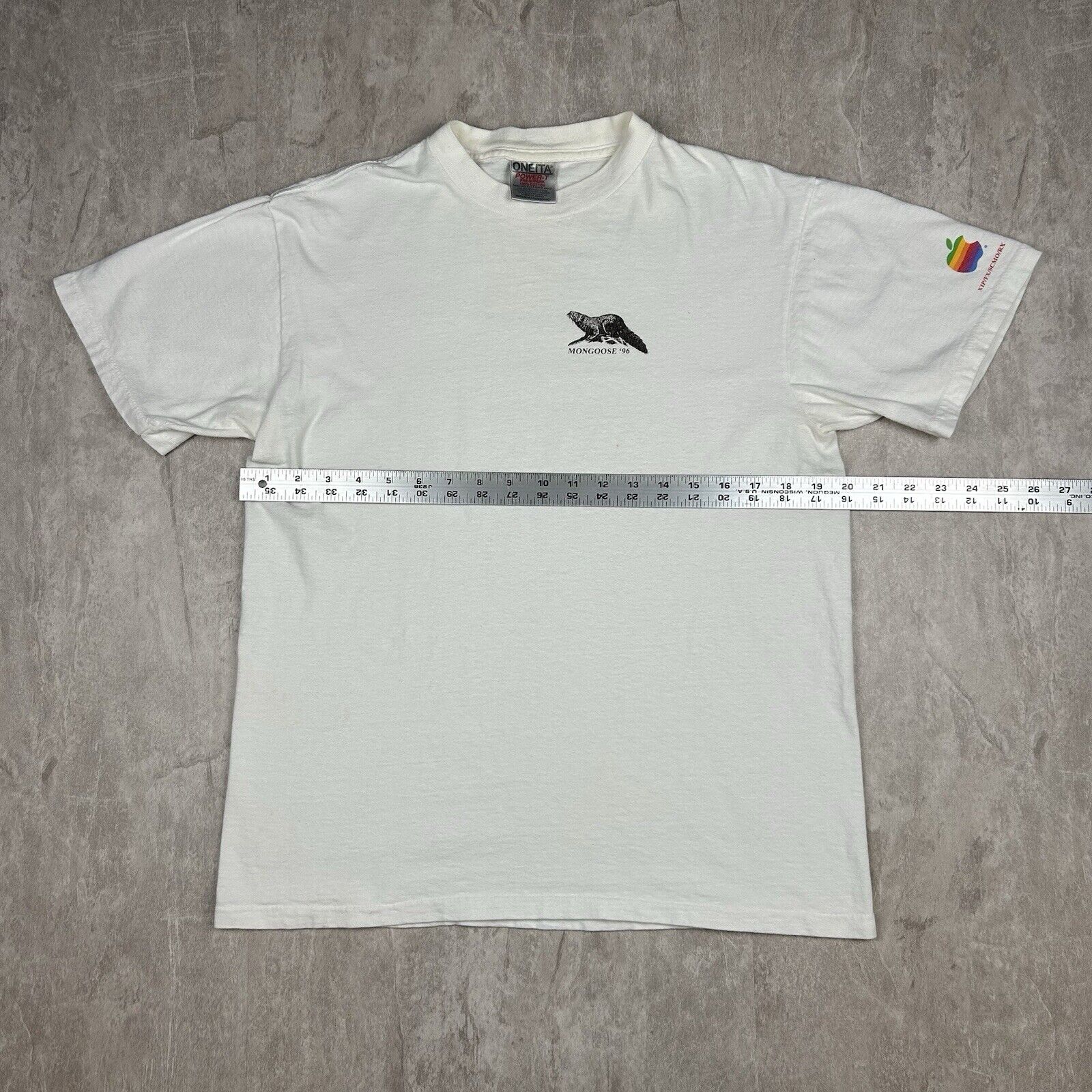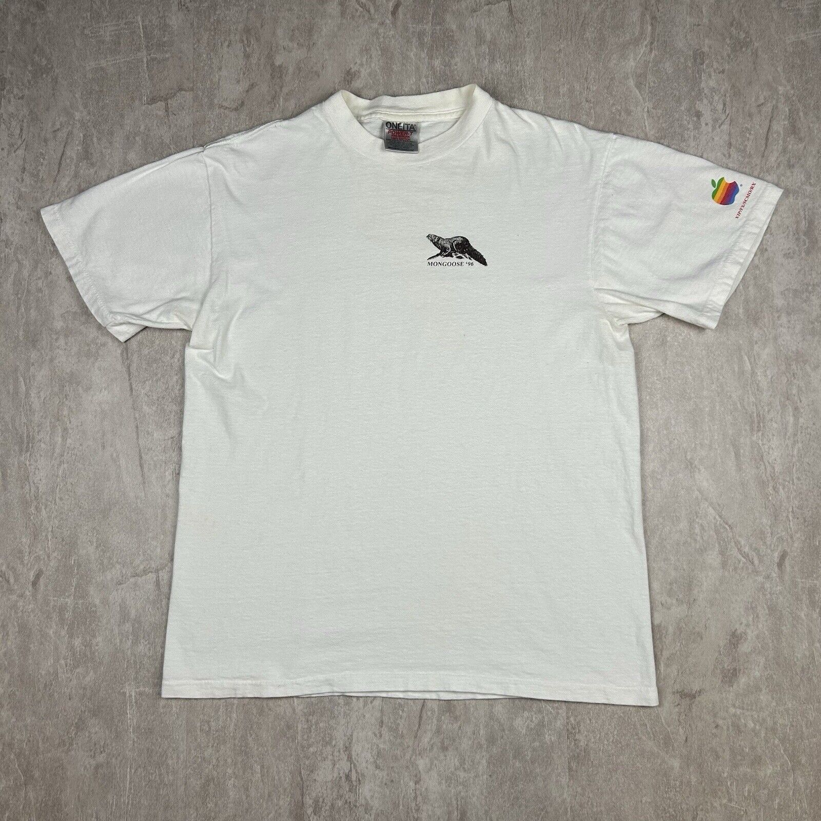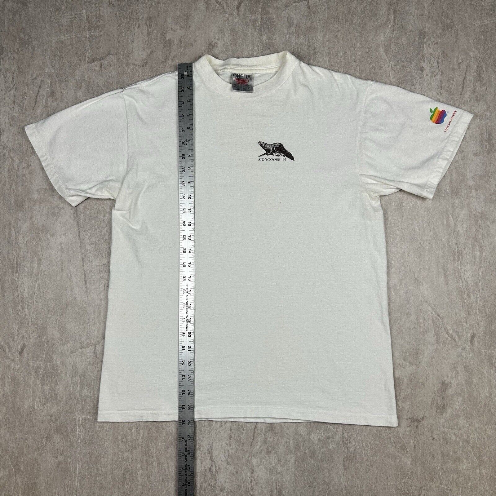 This rare vintage 90s Apple Tech Mongoose 96 T-shirt in Men's Size M features a vibrant rainbow Apple logo, capturing the essence of classic Apple branding. Set on a soft white cotton tee, this piece is a unique find from the iconic tech company's 90s era. Perfect for collectors of vintage tech apparel or Apple enthusiasts looking for a retro statement piece!